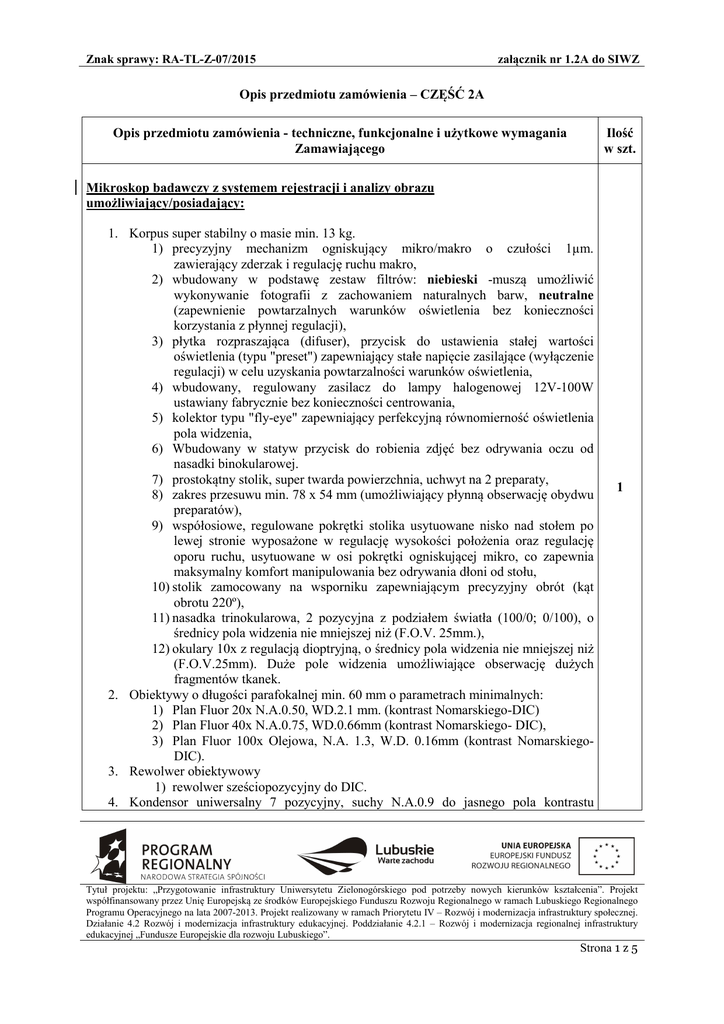 Znak sprawy: RA-TL-Z-07/2015 załącznik nr 1.2A do SIWZ Opis przedmiotu zamówienia – CZĘŚĆ 2A Opis przedmiotu zamówienia - techniczne, funkcjonalne i użytkowe wymagania Zamawiającego Ilość w szt. Mikroskop badawczy z systemem rejestracji i analizy obrazu umożliwiający/posiadający: 1. Korpus super stabilny o masie min. 13 kg. 1) precyzyjny mechanizm ogniskujący mikro/makro o czułości 1µm. zawierający zderzak i regulację ruchu makro, 2) wbudowany w podstawę zestaw filtrów: niebieski -muszą umożliwić wykonywanie fotografii z zachowaniem naturalnych barw, neutralne (zapewnienie powtarzalnych warunków oświetlenia bez konieczności korzystania z płynnej regulacji), 3) płytka rozpraszająca (difuser), przycisk do ustawienia stałej wartości oświetlenia (typu "preset") zapewniający stałe napięcie zasilające (wyłączenie regulacji) w celu uzyskania powtarzalności warunków oświetlenia, 4) wbudowany, regulowany zasilacz do lampy halogenowej 12V-100W ustawiany fabrycznie bez konieczności centrowania, 5) kolektor typu "fly-eye" zapewniający perfekcyjną równomierność oświetlenia pola widzenia, 6) Wbudowany w statyw przycisk do robienia zdjęć bez odrywania oczu od nasadki binokularowej. 7) prostokątny stolik, super twarda powierzchnia, uchwyt na 2 preparaty, 8) zakres przesuwu min. 78 x 54 mm (umożliwiający płynną obserwację obydwu preparatów), 9) współosiowe, regulowane pokrętki stolika usytuowane nisko nad stołem po lewej stronie wyposażone w regulację wysokości położenia oraz regulację oporu ruchu, usytuowane w osi pokrętki ogniskującej mikro, co zapewnia maksymalny komfort manipulowania bez odrywania dłoni od stołu, 10) stolik zamocowany na wsporniku zapewniającym precyzyjny obrót (kąt obrotu 220º), 11) nasadka trinokularowa, 2 pozycyjna z podziałem światła (100/0; 0/100), o średnicy pola widzenia nie mniejszej niż (F.O.V. 25mm.), 12) okulary 10x z regulacją dioptryjną, o średnicy pola widzenia nie mniejszej niż (F.O.V.25mm). Duże pole widzenia umożliwiające obserwację dużych fragmentów tkanek. 2. Obiektywy o długości parafokalnej min. 60 mm o parametrach minimalnych: 1) Plan Fluor 20x N.A.0.50, WD.2.1 mm. (kontrast Nomarskiego-DIC) 2) Plan Fluor 40x N.A.0.75, WD.0.66mm (kontrast Nomarskiego- DIC), 3) Plan Fluor 100x Olejowa, N.A. 1.3, W.D. 0.16mm (kontrast NomarskiegoDIC). 3. Rewolwer obiektywowy 1) rewolwer sześciopozycyjny do DIC. 4. Kondensor uniwersalny 7 pozycyjny, suchy N.A.0.9 do jasnego pola kontrastu 1 Tytuł projektu: „Przygotowanie infrastruktury Uniwersytetu Zielonogórskiego pod potrzeby nowych kierunków kształcenia”. Projekt współfinansowany przez Unię Europejską ze środków Europejskiego Funduszu Rozwoju Regionalnego w ramach Lubuskiego Regionalnego Programu Operacyjnego na lata 2007-2013. Projekt realizowany w ramach Priorytetu IV – Rozwój i modernizacja infrastruktury społecznej. Działanie 4.2 Rozwój i modernizacja infrastruktury edukacyjnej. Poddziałanie 4.2.1 – Rozwój i modernizacja regionalnej infrastruktury edukacyjnej „Fundusze Europejskie dla rozwoju Lubuskiego”. Strona 1 z 5 Znak sprawy: RA-TL-Z-07/2015 załącznik nr 1.2A do SIWZ fazowego i DIC dla obiektywów od 4x do 100x. 5. Wyposażenie do DIC: 1) DIC polaryzator, obrotowy, 2) DIC analizator, 3) moduł lambda, 4) wsuwka do obiektywu 40x, 5) wsuwka do obiektywu 100x. 6. Kamera cyfrowa wraz z oprogramowaniem o minimalnych parametrach: 1) Matryca CCD 2/3” min 5 MPix, 2) Waga głowicy kamery nie większa niż 280g, 3) Podgląd na żywo min 37 klatek na sekundę, 4) Czas ekspozycji od 0.001 s do 60 sekund, 5) Łącznik optyczny dopasowujący pole widzenia kamery, 6) Automatyczne oraz manualne nastawianie czasu ekspozycji, 7) Możliwość robienia zdjęć w odstępach czasowych, 8) Automatyczny oraz manualny balans bieli, 9) Korekcja kolorów, 10) Zapis zdjęć w min. następujących formatach JPEG, BMP, TIFF , 11) Możliwość sterowania kamerą oraz robienia zdjęć przez komputer połączony przez port FireWire, 12) Sterownik do kamery umożliwiający podłączenie dwóch kamer cyfrowych (np. czarno-białej i kolorowej) do analizy za pomocą jednego oprogramowania. 13) Możliwość łatwego przełączania nastawień kamery do różnego typu obserwacji (jasne pole, kontrast fazowy , fluorescencja) 7. Oprogramowaniem zapewniające: 1) możliwość nagrywania filmów AVI, wykonywania zdjęć w odstępach czasowych, 2) automatyczne oraz manualne zliczanie obiektów, 3) automatyczne oraz manualne pomiary powierzchni , długości, średnic, eksport do Excel, 4) edycja obrazu (kontrast , jasność , nasycenie), 5) statystyka, 6) kalibracja, 7) sterowanie kamerą (zapis, odczyt , podgląd na żywo), 8) wydruk pomiarów, obrazów, 9) składanie dużych obrazów (z kilku pól widzenia w jeden obraz), 10) generowanie raportów, 11) możliwość rejestracji obrazów fluorescencyjnych z min 6 bloczków filtrowych i nałożenia ich w jeden obraz z możliwością edycji w późniejszym czasie każdego z nich, 12) możliwość doposażenia w moduł umożliwiający składanie jednego ostrego obrazu z kilku płaszczyzn głębi ostrości, 13) możliwość dowolnego wyznaczania pola powierzchni do pomiarów zautomatyzowanych. 8. Musi posiadać możliwość doposażenia w przyszłości w: 1) Obiektywy: Tytuł projektu: „Przygotowanie infrastruktury Uniwersytetu Zielonogórskiego pod potrzeby nowych kierunków kształcenia”. Projekt współfinansowany przez Unię Europejską ze środków Europejskiego Funduszu Rozwoju Regionalnego w ramach Lubuskiego Regionalnego Programu Operacyjnego na lata 2007-2013. Projekt realizowany w ramach Priorytetu IV – Rozwój i modernizacja infrastruktury społecznej. Działanie 4.2 Rozwój i modernizacja infrastruktury edukacyjnej. Poddziałanie 4.2.1 – Rozwój i modernizacja regionalnej infrastruktury edukacyjnej „Fundusze Europejskie dla rozwoju Lubuskiego”. Strona 2 z 5 Znak sprawy