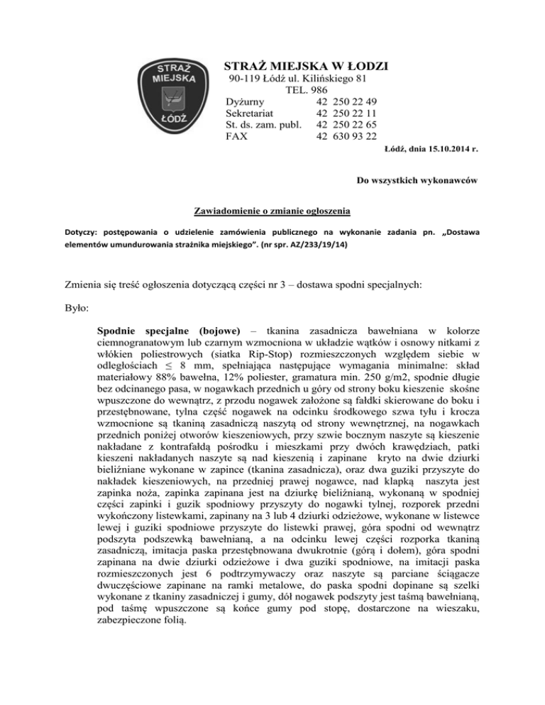 STRAŻ MIEJSKA W ŁODZI 90-119 Łódź ul. Kilińskiego 81 TEL. 986 Dyżurny 42 250 22 49 Sekretariat 42 250 22 11 St. ds. zam. publ. 42 250 22 65 FAX 42 630 93 22 Łódź, dnia 15.10.2014 r. Do wszystkich wykonawców Zawiadomienie o zmianie ogłoszenia Dotyczy: postępowania o udzielenie zamówienia publicznego na wykonanie zadania pn. „Dostawa elementów umundurowania strażnika miejskiego”. (nr spr. AZ/233/19/14) Zmienia się treść ogłoszenia dotyczącą części nr 3 – dostawa spodni specjalnych: Było: Spodnie specjalne (bojowe) – tkanina zasadnicza bawełniana w kolorze ciemnogranatowym lub czarnym wzmocniona w układzie wątków i osnowy nitkami z włókien poliestrowych (siatka Rip-Stop) rozmieszczonych względem siebie w odległościach ≤ 8 mm, spełniająca następujące wymagania minimalne: skład materiałowy 88% bawełna, 12% poliester, gramatura min. 250 g/m2, spodnie długie bez odcinanego pasa, w nogawkach przednich u góry od strony boku kieszenie skośne wpuszczone do wewnątrz, z przodu nogawek założone są fałdki skierowane do boku i przestębnowane, tylna część nogawek na odcinku środkowego szwa tyłu i krocza wzmocnione są tkaniną zasadniczą naszytą od strony wewnętrznej, na nogawkach przednich poniżej otworów kieszeniowych, przy szwie bocznym naszyte są kieszenie nakładane z kontrafałdą pośrodku i mieszkami przy dwóch krawędziach, patki kieszeni nakładanych naszyte są nad kieszenią i zapinane kryto na dwie dziurki bieliźniane wykonane w zapince (tkanina zasadnicza), oraz dwa guziki przyszyte do nakładek kieszeniowych, na przedniej prawej nogawce, nad klapką naszyta jest zapinka noża, zapinka zapinana jest na dziurkę bieliźnianą, wykonaną w spodniej części zapinki i guzik spodniowy przyszyty do nogawki tylnej, rozporek przedni wykończony listewkami, zapinany na 3 lub 4 dziurki odzieżowe, wykonane w listewce lewej i guziki spodniowe przyszyte do listewki prawej, góra spodni od wewnątrz podszyta podszewką bawełnianą, a na odcinku lewej części rozporka tkaniną zasadniczą, imitacja paska przestębnowana dwukrotnie (górą i dołem), góra spodni zapinana na dwie dziurki odzieżowe i dwa guziki spodniowe, na imitacji paska rozmieszczonych jest 6 podtrzymywaczy oraz naszyte są parciane ściągacze dwuczęściowe zapinane na ramki metalowe, do paska spodni dopinane są szelki wykonane z tkaniny zasadniczej i gumy, dół nogawek podszyty jest taśmą bawełnianą, pod taśmę wpuszczone są końce gumy pod stopę, dostarczone na wieszaku, zabezpieczone folią. Jest: Spodnie specjalne (bojowe) - w kolorze ciemnogranatowym, wykonane z tkaniny typu Frontiera 150 RIPSTOP WDP-OLF lub równoważnej spełniającej następujące wymagania minimalne: skład materiałowy 50 % bawełna, 50% poliester, gramatura 245 g/m2, długie bez odcinanego pasa, w nogawkach przednich u góry od strony boku kieszenie skośne wpuszczone do wewnątrz, z przodu nogawek założone są fałdki skierowane do boku i przestębnowane, tylna część nogawek na odcinku środkowego szwu tyłu i krocza wzmocnione są tkaniną zasadniczą naszytą od strony wewnętrznej, na nogawkach przednich poniżej otworów kieszeniowych, przy szwie bocznym naszyte są kieszenie nakładane z kontrafałdą pośrodku i mieszkami przy dwóch krawędziach, patki kieszeni nakładanych naszyte są nad kieszenią i zapinane kryto na dwie dziurki bieliźniane wykonane w zapince (tkanina zasadnicza), oraz dwa guziki przyszyte do nakładek kieszeniowych, na przedniej prawej nogawce, nad klapką naszyta jest zapinka noża, zapinka zapinana jest na dziurkę bieliźnianą, wykonaną w spodniej części zapinki i guzik spodniowy przyszyty do nogawki tylnej, rozporek przedni wykończony listewkami, zapinany na 3 lub 4 dziurki odzieżowe, wykonane w listewce lewej i guziki spodniowe przyszyte do listewki prawej, góra spodni od wewnątrz podszyta podszewką bawełnianą, a na odcinku lewej części rozporka tkaniną zasadniczą, imitacja paska przestębnowana dwukrotnie (górą i dołem), góra spodni zapinana na dwie dziurki odzieżowe i dwa guziki spodniowe, na imitacji paska rozmieszczonych jest 6 szlufek umożliwiających wsunięcie pasa o szerokości 45 +/-3 mm oraz naszyte są ściągacze dwuczęściowe zapinane na ramki metalowe, do paska spodni dopinane są szelki wykonane z tkaniny zasadniczej i gumy, dół nogawek podszyty jest taśmą bawełnianą, pod taśmę wpuszczone są końce gumy pod stopę, dostarczone na wieszaku, zabezpieczone folią. W związku z zaistniałą zmianą przedłużamy termin składania ofert na dzień 21.10.2014 r do godz. 15.00.