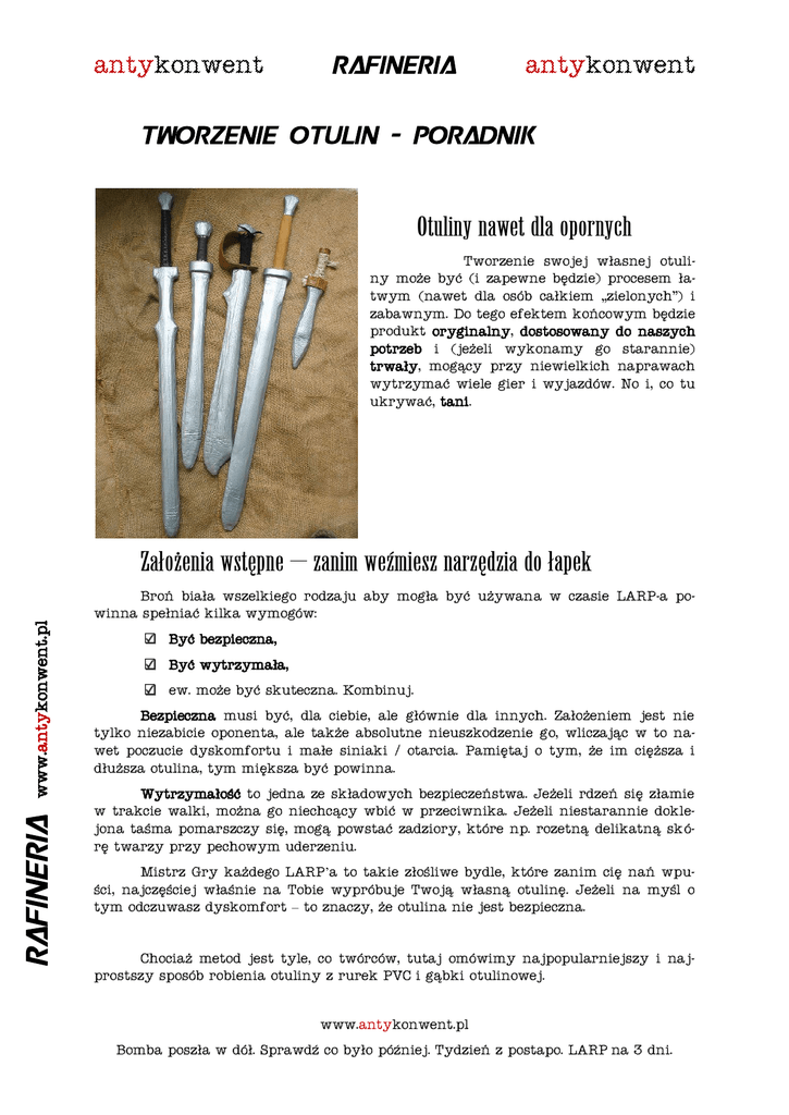 antykonwent RAFINERIA antykonwent Tworzenie otulin - poradnik Otuliny nawet dla opornych Tworzenie swojej własnej otuliny może być (i zapewne będzie) procesem łatwym (nawet dla osób całkiem „zielonych”) i zabawnym. Do tego efektem końcowym będzie produkt oryginalny, dostosowany do naszych potrzeb i (jeżeli wykonamy go starannie) trwały, mogący przy niewielkich naprawach wytrzymać wiele gier i wyjazdów. No i, co tu ukrywać, tani. Rafineria www.antykonwent.pl Założenia wstępne – zanim weźmiesz narzędzia do łapek Broń biała wszelkiego rodzaju aby mogła być używana w czasie LARP-a powinna spełniać kilka wymogów: Być bezpieczna, Być wytrzymała, ew. może być skuteczna. Kombinuj. Bezpieczna musi być, dla ciebie, ale głównie dla innych. Założeniem jest nie tylko niezabicie oponenta, ale także absolutne nieuszkodzenie go, wliczając w to nawet poczucie dyskomfortu i małe siniaki / otarcia. Pamiętaj o tym, że im cięższa i dłuższa otulina, tym miększa być powinna. Wytrzymałość to jedna ze składowych bezpieczeństwa. Jeżeli rdzeń się złamie w trakcie walki, można go niechcący wbić w przeciwnika. Jeżeli niestarannie doklejona taśma pomarszczy się, mogą powstać zadziory, które np. rozetną delikatną skórę twarzy przy pechowym uderzeniu. Mistrz Gry każdego LARP’a to takie złośliwe bydle, które zanim cię nań wpuści, najczęściej właśnie na Tobie wypróbuje Twoją własną otulinę. Jeżeli na myśl o tym odczuwasz dyskomfort – to znaczy, że otulina nie jest bezpieczna. Chociaż metod jest tyle, co twórców, tutaj omówimy najpopularniejszy i najprostszy sposób robienia otuliny z rurek PVC i gąbki otulinowej. www.antykonwent.pl Bomba poszła w dół. Sprawdź co było później. Tydzień z postapo. LARP na 3 dni. www.antykonwent.pl Tworzenie otulin www.antykonwent.pl Czego będziesz potrzebował – materiały i narzędzia: Odpowiednio długa rurka z PVC (PCW) znana również jako rurka do wody (UWAGA! Wybieramy droższe rurki do wody ciepłej, ich ścianki są grubsze i nie pękają, a jeśli już pękną, to nie powstają ostre kanty, których w otulinach unikać należy), Kształtki do łączenia rur (tu, co ciekawe, o ile nie mamy dostępu do specjalnej nagrzewnicy do mocowania rur do ciepłej wody, bierzemy kształtki do wody zimnej, są większe i dopasujemy rury używając kleju i taśmy izolacyjnej), Otulina – tanie karimaty są super, a można też kupić izolację do rur, która ma już odpowiedni kształt. Będziesz potrzebował tego wiele warstw. Taśma klejąca typu Power Tape (to ta srebrna taśma uniwersalnego zastosowania, pewnie byliście kiedyś taką przyklejani do łóżka albo sufitu - jak każdy). Taśma z ułożonymi w kratkę włóknami (najlepsze mają tam aramid) jest dużo bardziej odporna na pękanie i rozrywanie, Klej butapren (śmierdzi jak cholera, więc używać tylko przy otwartych oknach, jego opary są halucynogenne) – przyda się, bo dzięki niemu konstrukcja trzyma się kupy. Długo wiąże (kilkanaście godzin), ale w odróżnieniu od innych klejów daje elastyczne połączenie, które będzie pracować razem z otuliną a nie pękać i kruszyć się. Taśma izolacyjna – najlepiej w kilku kolorach, do ozdoby, na rękojeść, Pistolet i klej w sztyftach (to te do klejenia na gorąco) – przydaje się, np. do łączenia rurek z kształtkami, Papier ścierny – do zmatowienia rurek PVC, żeby się ich klej lepiej trzymał. Komentarz do materiałów: Rafineria Rdzeń stanowi kręgosłup broni. Musi być wytrzymały i giętki. Kiedy jest sztywny, łatwo się łamie. Jeżeli się łamie, powstają ostre drzazgi które z łatwością przebijają piankę, taśmę klejącą a ostatecznie nawet otrzewną pchniętej osoby. Nie polecamy. Dlatego materiały jak rurki do zimnej wody, pręty z włókna szklanego, bambus to zabawa dla bardziej doświadczonych osób. Im dłuższa broń, tym bardziej będzie się majtała (efekt wędki), żeby temu zapobiec stosujemy grubszy rdzeń. Jednak grubszy rdzeń to też większy ciężar i konieczność grubszego otulania. Szara gąbka otulinowa to dobry materiał, jest bardzo miękka i tania. Oczywiście jedna warstwa nie wystarczy. Zamiennikiem może być karimata, jednak trzeba ją dobrze dobrać. Niektóre karimaty są twardsze i cięższe niż otulina do rur, takie nadają się raczej do lekkich i krótkich otulin jednoręcznych, np. maczet. Otulina amortyzuje też uderzenia w czasie walki, więc więcej otuliny to mniejsze naprężenia przekazywane na rdzeń i dłuższa jego żywotność. -2- www.antykonwent.pl Tworzenie otulin www.antykonwent.pl 1. Rdzeń – kręgosłup otuliny Rurki przycinamy do odpowiedniej długości i matowimy je gruboziarnistym papierem ściernym lub pilnikiem (żeby lepiej się do nich kleiła otulina). Układamy szkielet naszej broni, rurki mocujemy w kształtkach (wcześniej odpowiednio owijając ich końce taśmą izolacyjną, żeby wchodziły na ścisło), kleimy. Dla pewności można wlać trochę kleju z pistoletu do kształtki i dopchnąć rurkę. Na koniec warto łączenie paroma warstwami powertapa. Ten etap wydaje się niezbyt złożony, lecz od tego jaki to sobie szkielet wymyślimy zależy, jaką bronią będziemy machać. Uwaga! W broni, którą zamierzamy również dźgać przeciwnika należy zadbać, by końcówka rdzenia nie miała ostrych krawędzi. Najlepiej zabezpieczyć ją jakimś korkiem lub owalną zaślepką – np. przyklejonym korkiem od szampana, albo nawet piłką tenisową w większej broni (bezpieczne topory, młoty, włócznie). Z dobrych porad: Rafineria Kiedy nie macie noża do cięcia rur PVC (bo kto ma?), warto poświęcić jakiś stary nóż i po rozgrzaniu go nad ogniem kroić na gorąco. Idzie to dużo sprawniej niż cięcie piłą. Druga sprawa. Rurki do gorącej wody można kształtować (np. wyginać) w dużej temperaturze. Kiedyś zdarzyło mi się wyginać na grillu, ale
