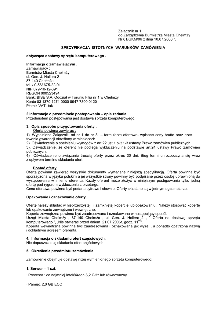 Załącznik nr 1 do Zarządzenia Burmistrza Miasta ChełmŜy Nr 61/GKM/06 z dnia 10.07.2006 r. SPECYFIKACJA ISTOTNYCH WARUNKÓW ZAMÓWIENIA dotycząca dostawy sprzętu komputerowego . Informacja o zamawiającym . Zamawiający : Burmistrz Miasta ChełmŜy ul. Gen. J. Hallera 2 87-140 ChełmŜa tel. / 0-56/ 675-22-91 NIP 879-10-12-391 REGON 000523494 Bank: BISE S.A. Oddział w Toruniu Filia nr 1 w ChełmŜy Konto 03 1370 1271 0000 8947 7300 0120 Płatnik VAT- tak 2.Informacje o przedmiocie postępowania – opis zadania. Przedmiotem postępowania jest dostawa sprzętu komputerowego. 3. Opis sposobu przygotowania oferty . Oferta powinna zawierać : 1). Wypełnione Załączniki od nr 1 do nr 3 – formularze ofertowe- wpisane ceny brutto oraz czas trwania gwarancji określony w miesiącach. 2). Oświadczenie o spełnieniu wymogów z art.22 ust.1 pkt 1-3 ustawy Prawo zamówień publicznych. 3). Oświadczenie, Ŝe oferent nie podlega wykluczeniu na podstawie art.24 ustawy Prawo zamówień publicznych. 4) Oświadczenie o związaniu treścią oferty przez okres 30 dni. Bieg terminu rozpoczyna się wraz z upływem terminu składania ofert. Postać oferty Oferta powinna zawierać wszystkie dokumenty wymagane niniejszą specyfikacją. Oferta powinna być sporządzona w języku polskim a jej wszystkie strony powinny być podpisane przez osobę uprawnioną do występowania w imieniu oferenta. KaŜdy oferent moŜe złoŜyć w niniejszym postępowania tylko jedną ofertę pod rygorem wykluczenia z przetargu. Cena ofertowa powinna być podana cyfrowo i słownie. Oferty składane są w jednym egzemplarzu. Opakowanie i oznakowanie oferty . Ofertę naleŜy składać w nieprzejrzystej i zamkniętej kopercie lub opakowaniu . NaleŜy stosować kopertę lub opakowanie zewnętrzne i wewnętrzne. Koperta zewnętrzna powinna być zaadresowana i oznakowana w następujący sposób : Urząd Miasta ChełmŜy , 87-140 ChełmŜa , ul. Gen. J. Hallera 2 , " Oferta na dostawę sprzętu 00 komputerowego ”, „Nie otwierać przed dniem 21.07.2006r. godz. 11 ". Koperta wewnętrzna powinna być zaadresowana i oznakowana jak wyŜej , a ponadto opatrzona nazwą i dokładnym adresem oferenta. 4. Informacja o składaniu ofert częściowych. Nie dopuszcza się składania ofert częściowych . 5. Określenie przedmiotu zamówienia . Zamówienie obejmuje dostawę niŜej wymienionego sprzętu komputerowego: 1. Serwer – 1 szt. · Procesor : co najmniej Intel®Xeon 3,2 GHz lub równowaŜny · Pamięć 2,0 GB ECC · płyta główna : 1. Maksymalna ilość procesorów 2 szt. 2. Maksymalna ilość dysków 6 szt. 3. Typ pamięci : ECC 4. Częstotliwość szyny pamięci : 400 Mhz 5. Ilość banków pamięci : 8 szt. 6. Ilość wolnych banków pamięci : 6 szt. · Elementy Hot-Swap : Dyski twarde, Zasilacze · Karta sieciowa : 10/100/1000 Mbit/s · Napędy wbudowane FDD, DVD+/-R · RAID Controller (1int U320, 64 MB) · 146 GB Pluggable Ultra320 10K Universal Hard Drive (1") · 146 GB Pluggable Ultra320 10K Universal Hard Drive (1") · streamer 36/72 GB · 5 kaset do streamera 36/72 GB + kaseta czyszcząca · Redundant Hot Plug Fan Kit · karta grafiki · Obudowa Tower · zasilacz awaryjny UPS : 1 000 W z kablami do podłączenia komputera i monitora · klawiatura, mysz optyczna z kółkiem, · Certyfikat : Ce · System operacyjny : Windows 2003 Serwer PL na 15 uŜytkowników, licencja MOLP + nośnik, nie wymagający aktywacji · Gwarancja : Min. 3 lata, reakcja serwisu do końca następnego dnia roboczego. W przypadku, gdy usunięcie usterki jest niemoŜliwe w siedzibie Zamawiającego to dostawca dostarcza na czas naprawy urządzenie zastępcze spełniające podobną funkcję w zakresie działania i funkcjonalności do dnia następnego po dniu reakcji serwisu. 2. Switch – 2 szt. · Architektura sieci LAN: Ethernet, FastEthernet · Liczba portów 10/100BaseTX (RJ45): 8 · Obsługiwane protokoły: IEEE 802.3x flow control, half/full duplex · Rozmiar tablicy adresów MAC: 800 · Algorytm przełączania: store-and-forward · Typ obudowy: Desktop Gwarancja : 24 m-ce. Dostawca dostarcza na czas naprawy urządzenie zastępcze spełniające podobną funkcję w zakresie działania i funkcjonalności do dnia następnego po dniu reakcji serwisu. 3. Dysk twardy – 1 szt. · Pojemność co najmniej (GB): 120 · Interfejs:Ultra ATA/133 · Pojemność pamięci podręcznej: 8 MB · Prędkość obrotowa silnika : 7200 · Średnie opóźnienie obrotowe (latency): 4,17 ms · Średni czas wyszukiwania: 8,9 ms · Maksymalna wewnętrzna szybkość transmisji: 741 Mb/s · Odporność na wstrząsy: praca 63 Gs/ spoczynek 350 Gs · Stopa błędów przy odczycie : 1:10EE14 · Głośność w czasie pracy (dB): 28 · Liczba godzin bezawaryjnej pracy MTBF: 500 000 · Dodatkowe funkcje: S.M.A.R.T., NoiseGuard, SilentSeek · gwarancja : 36 m-cy. Dostawca dostarcza na czas naprawy urządzenie zastępcze spełniające podobną funkcję w zakresie działania i funkcjonalności do dnia następnego po dniu reakcji serwisu. W przypadku serwera wymagana jest 3 letnia gwarancja producenta z serwisem w miejscu instalacji realizowanym przez autoryzowany punkt serwisowy producenta. Reakcja serwisu do końca następnego dnia roboczego. W przypadku, gdy usunięcie usterki jest niemoŜliwe w siedzibie Zamawiającego to dostawca dostarcza na czas naprawy urządzenie zastępcze spełniające podobną funkcję w zakresie działania i funkcjonalności do dnia następnego po dniu reakcji serwisu. W przypadku switchy wymagana gwarancja co najmniej 24 m-ce, dysku twardego – 36 m-cy. Przy kalkulacji cen proszę uwzględnić terminy płatności w dwóch ratach, pierwsza płatna 7 dni po podpisaniu umowy następna w ciągu 3 m-cy. 6. Kryteria oceny oferty . Przy wyborze oferty zamawiający będzie się kierował jedynym kryterium jakim jest cena sprzętu komputerowego brutto. Opis kryterium : cena – oferta o najniŜszej cenie brutto wpisanej w Załączniki od nr 1 do nr 3- uzyska ma