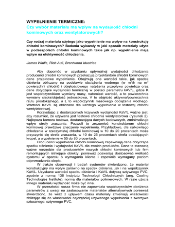 WYPEŁNIENIE TERMICZNE: Czy wybór materiału ma wpływ na wydajność chłodni kominowych oraz wentylatorowych? Czy rodzaj materiału użytego jako wypełnienie ma wpływ na konstrukcję chłodni kominowych? Badania wykazały w jaki sposób materiały użyte w podzespołach chłodni kominowych takie jak np. wypełnienie mają wpływ na efektywność chłodzenia. James Wallis, Rich Aull, Brentwood Idustries Aby dopomóc w uzyskaniu optymalnej wydajności chłodzenia producenci chłodni kominowych przekazują projektantom chłodni kominowych dane projektowe wypełnienia. Obejmują one wartości takie, jak spadek ciśnienia obliczany na podstawie obciążenia wodnego (w m3/h na m2 powierzchni chłodni) i objętościowego natężenia przepływu powietrza oraz dane dotyczące wydajności termicznej w postaci parametru kAV/L, gdzie K jest współczynnikiem wymiany masy, natomiast wartość, a to powierzchnia wymiany ciepła/objętość jednostkowa, V to objętość aktywna/powierzchnia rzutu prostokątnego, a L to współczynnik masowego obciążenia wodnego. Wartości KaV/L są obliczane dla każdego wypełnienia w testowej chłodni wentylatorowej. Korzystając z dostarczonych krzywych wydajności KaV/L ważne jest, aby rozumieć, że używana jest testowa chłodnia wentylatorowa (rysunek 2). Najlepsza komora testowa, dostarczająca danych badawczych, zminimalizuje wpływ strefy zraszania. Pozwoli to zrozumieć konstruktorom chłodni kominowej prawdziwe znaczenie wypełnienia. Przykładowo, dla całkowitego chłodzenia w rzeczywistej chłodni kominowej w 10 do 20 procentach może przyczynić się strefa zraszania, w 10 do 25 procentach strefa opadających kropel, a wypełnienie w 55 do 80 procentach. Producenci wypełnienia chłodni kominowej zapewniają dane dotyczące spadku ciśnienia i wydajności KaV/L dla swoich produktów. Dane te stanowią ważne narzędzie dla producentów nowych chłodni kominowych lub firm remontujących istniejące obiekty, ponieważ pozwalają dostosować wielkość systemu w oparciu o wymagania klienta i zapewnić wymagany poziom odprowadzania ciepła. W trakcie obserwacji i badań systemów stwierdzono, że materiał konstrukcyjny ma wpływ zarówno na spadek ciśnienia, jak i na współczynnik KaV/L. Uzyskane wartości spadku ciśnienia i KaV/L dotyczą sztywnego PVC, zgodnie z normą 136 Instytutu Technologii Chłodniczych (ang. Cooling Technologies Institute), normą dla materiałów polimerowych. W razie użycia innego materiału wydajność może być inna. W przeszłości nasza firma nie zapewniała współczynników obniżenia parametrów z uwagi na zastosowanie materiałów alternatywnych ponieważ stwierdzono, że wraz z upływem czasu materiały zmieniają właściwości zbliżając się do właściwości najczęściej używanego wypełnienia z tworzywa sztucznego: sztywnego PVC. W niniejszym artykule omówione zostaną dane badawcze potwierdzające potrzebę obniżenia parametrów w przypadku wypełnień z tworzyw sztucznych cechujących się niską energią powierzchniową. Ocena przydatności polimerów o powierzchniowej do chłodni kominowych niskiej energii Nowa chłodnia kominowa wyposażona w wypełnienie ze sztywnego PVC będzie wymagała około 30 dni pracy przed osiągnięciem optymalnej wydajności. Jest to głównie spowodowane koniecznością kondycjonowania wypełnienia termicznego odpowiedzialnego za maksymalnie 80 procent całkowitego chłodzenia, polegającego na całkowitym zwilżeniu powierzchni wypełnienia. Wypełnienie może być wyposażone w czynniki aktywne powierzchniowo lub może być zabezpieczone przed utlenianiem, co utrudnia powstawanie warstwy wilgotnej. Nasze zalecenie dla klientów to uruchamianie prób kwalifikacyjnych dla nowych lub remontowanych chłodni kominowych po upływie 30 do 60 dni od ich rozruchu, co pozwoli zmierzyć ich rzeczywistą wydajność długoterminową. Niektóre utrzymujące się warstwy procesowe utrzymujące mogą ograniczać powstawanie warstwy wody na wypełnieniach termicznych chłodni kominowej. Co więcej, zastosowanie alternatywnych tworzyw sztucznych może obniżyć wydajność wypełnienia przez utrudnianie tworzenia się warstwy wodnej (rys. 1). Dynamika nawilżania Wysoka energia powierzchniowa = wypełnienie hydrofilowe (nawilżanie) Niska energia powierzchniowa = wypełnienie hydrofobowe (brak nawilżania) Wetting=nawilżanie Nonwetting=brak nawilżania Adhesive = Przyczepność High-energy surface (Easy to adhere) = Warstwa o wysokiej energii powierzchniowej (wysoka przyczepność) Low-energy surface (Hard to adhere) = warstwa o niskiej energii powierzchniowej (niska przyczepność) Rysunek 1. Oprócz niektórych warstw poprocesowych, które mogą utrudniać powstawanie warstwy wodnej na wypełnieniu chłodni kominowej, użycie tworzyw sztucznych może obniżyć wydajność termiczną wypełnienia przez opór stawiany podczas tworzenia warstwy wodnej. W efekcie powstaje zjawisko braku zwilżania, obserwowane w tworzywach sztucznych cechujących się niską energią powierzchniową. Grupa polimerów o niskiej energii powierzchniowej może cechować się tak niską energią powierzchniową, że woda będzie ściekać, mocno utrudniając tworzenie odpowiedniej warstwy wodnej. Tabela 1. Względna energia powierzchniowa różnych materiałów Powierzchnia Energia powierzchniowa (dyny/cm) Polimery o wysokiej energii powierzchniowej ABS 42 Poliwęglany 42 PVC 40 Polimery o niskiej energii powierzchniowej Polietylen 31 Polipropylen 29 Teflon (DuPont) 18 Przeprowadzono badania polegające na porównaniu wartości KaV/L oraz spadku ciśnienia dla wypełnień chłodni kominowej wykonanych ze sztywnego polichlorku winylu (RPVC) oraz z polipropylenu (PP). Tworzywo RPVC cechowała o 38% wyższa energia powierzchniowa w porównaniu z polipropylenem. Ta wysoka energia powierzchniowa sprawia, że sztywne PVC jest bardzie podatne na tworzenie się warstwy wodnej. W tabeli 2 zamieszczono typowe ch