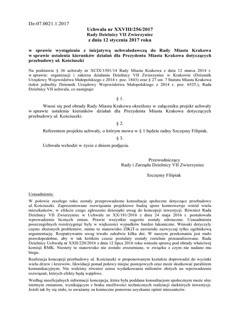 Dz-07.0021.1.2017 Uchwała nr XXVIII/256/2017 Rady Dzielnicy VII Zwierzyniec z dnia 12 stycznia 2017 roku w sprawie wystąpienia z inicjatywą uchwałodawczą do Rady Miasta Krakowa w sprawie ustalenia kierunków działań dla Prezydenta Miasta Krakowa dotyczących przebudowy ul. Kościuszki Na podstawie § 36 uchwały nr XCIX/1501/14 Rady Miasta Krakowa z dnia 12 marca 2014 r. w sprawie: organizacji i zakresu działania Dzielnicy VII Zwierzyniec w Krakowie (Dziennik Urzędowy Województwa Małopolskiego z 2014 r. poz. 1843) oraz § 27 ust. 7 Statutu Miasta Krakowa (tekst jednolity Dziennik Urzędowy Województwa Małopolskiego z 2014 r. poz. 6525.), Rada Dzielnicy VII uchwala, co następuje: § 1. Wnosi się pod obrady Rady Miasta Krakowa określony w załączniku projekt uchwały w sprawie ustalenia kierunków działań dla Prezydenta Miasta Krakowa dotyczących przebudowy ul. Kościuszki. § 2. Referentem projektu uchwały, o którym mowa w § 1 będzie radny Szczęsny Filipiak. § 3. Uchwała wchodzi w życie z dniem podjęcia. Przewodniczący Rady i Zarządu Dzielnicy VII Zwierzyniec Szczęsny Filipiak Uzasadnienie: W połowie zeszłego roku zostały przeprowadzone konsultacje społeczne dotyczące przebudowy ul. Kościuszki. Zaprezentowane rozwiązania projektowe budzą spore kontrowersje wśród wielu mieszkańców, w efekcie czego zgłoszono dziesiątki uwag do koncepcji inwestycji. Również Rada Dzielnicy VII Zwierzyniec w Uchwale nr XX/181/2016 z dnia 24 maja 2016 r. postulowała wprowadzenie licznych zmian. Prawie wszystkie sugestie zostały odrzucone. Uzasadnienia poszczególnych rozstrzygnięć były w większości wypadków bardzo lakoniczne. Wnioski dotyczyły często złożonych problemów, mimo to stanowisko ZIKiT-u zawierało zazwyczaj tylko ogólnikową argumentację. Rozpatrywanie uwag trwało zaledwie kilka dni. W naszym przekonaniu jest mało prawdopodobne, aby w tak krótkim czasie postulaty zostały rzetelnie przeanalizowane. Rada Dzielnicy Uchwałą nr XXII/220/2016 z dnia 12 lipca 2016 roku wniosła sprawę pod obrady właściwej komisji RMK. Niestety to stanowisko nie zostało zrozumiane, w związku z czym nie nadano mu biegu. Realizacja koncepcji przebudowy ul. Kościuszki w proponowanym kształcie doprowadzi do wycinki wielu drzew i krzewów, likwidacji ponad połowy miejsc postojowych oraz może skutkować paraliżem komunikacyjnym. Nie widzimy również sensu wydatkowania milionów złotych na wprowadzenie rozwiązań, których efekty będą wątpliwe. Według nieoficjalnych informacji koncepcja, która była poddana konsultacjom społecznym może ulec istotnym zmianom, wynikającym z braku możliwości technicznych realizacji niektórych inwestycji. Jeżeli tak by się stało, to uważamy za konieczne ponowne uzyskanie opinii mieszańców. Załącznik do Uchwały nr XXVIII/256/2017 Rady Dzielnicy VII Zwierzyniec z dnia 12 stycznia 2017 r. UCHWAŁA NR …….. Rady Miasta Krakowa z dnia …….. w sprawie ustalenia kierunków działań dla Prezydenta Miasta Krakowa dotyczących przebudowy ul. Kościuszki Na podstawie art. 18 ust. 2 pkt 2 ustawy z dnia 8 marca 1990 r. o samorządzie gminnym (tekst jednolity: Dz. U. z 2016 poz. 446) Rada Miasta Krakowa uchwala, co następuje: § 1. Ustala się kierunki działań dla Prezydenta Miasta Krakowa dotyczące przebudowy ul. Kościuszki, które polegają na: 1) przeprowadzeniu ponownej analizy uwag zgłoszonych w ramach konsultacji społecznych, 2) zorganizowaniu kolejnych konsultacji społecznych, które uwzględniałyby modyfikacje zamierzenia inwestycyjnego wynikające z braku możliwości technicznych realizacji pierwotnej koncepcji przebudowy, w przypadku jeżeli istotne zmiany zostaną dokonane. § 2. Zobowiązuje się Prezydenta Miasta Krakowa do wykonania § 1 pkt. 1 w ciągu dwóch miesięcy od dnia wejścia w życie uchwały. § 3. Uchwała wchodzi w życie z dniem podjęcia. Uzasadnienie: W połowie zeszłego roku zostały przeprowadzone konsultacje społeczne dotyczące przebudowy ul. Kościuszki. Zaprezentowane rozwiązania projektowe budzą spore kontrowersje wśród wielu mieszkańców, w efekcie czego zgłoszono dziesiątki uwag do koncepcji inwestycji. Również Rada Dzielnicy VII Zwierzyniec w Uchwale nr XX/181/2016 z dnia 24 maja 2016 r. postulowała wprowadzenie licznych zmian. Prawie wszystkie sugestie zostały odrzucone. Uzasadnienia poszczególnych rozstrzygnięć były w większości wypadków bardzo lakoniczne. Wnioski dotyczyły często złożonych problemów, mimo to stanowisko ZIKiT-u zawierało zazwyczaj tylko ogólnikową argumentację. Rozpatrywanie uwag trwało zaledwie kilka dni. W naszym przekonaniu jest mało prawdopodobne, aby w tak krótkim czasie postulaty zostały rzetelnie przeanalizowane. Rada Dzielnicy w Uchwałą nr XXII/220/2016 z dnia 12 lipca 2016 roku wniosła sprawę pod obrady właściwej komisji RMK. Niestety to stanowisko nie zostało zrozumiane, w związku z czym nie nadano mu biegu. Realizacja koncepcji przebudowy ul. Kościuszki w proponowanym kształcie doprowadzi do wycinki wielu drzew i krzewów, likwidacji ponad połowy miejsc postojowych oraz może skutkować paraliżem komunikacyjnym. Nie widzimy również sensu wydatkowania milionów złotych na wprowadzenie rozwiązań, których efekty będą wątpliwe. Według nieoficjalnych informacji koncepcja, które była poddana konsultacjom społecznym może ulec istotnym zmianom wynikającym z braku możliwości technicznych realizacji niektórych inwestycji. Jeżeli tak by się stało, to uważamy za konieczne ponowne uzyskanie opinii mieszańców.