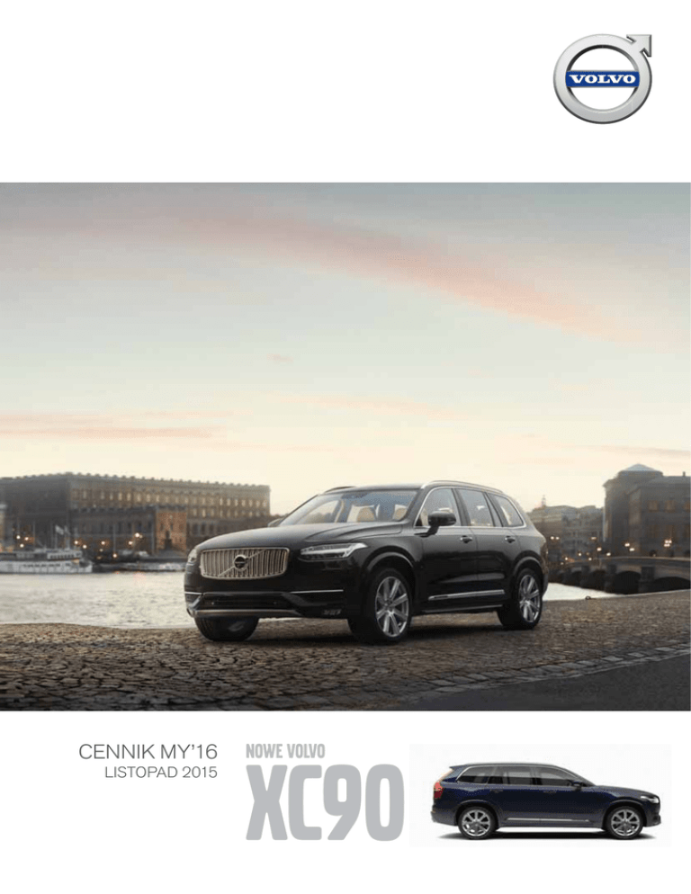VOLVO XC90 | 1 CENNIK MY’16 LISTOPAD 2015 NOWE VOLVO XC90 VOLVO XC90 | 2 VOLVO XC90 | 3 SPIS TREŚCI Jednostki napędowe 05 Wyposażenie standardowe 06 DESIGN 08 Plug-In Hybrid 10 Bezpieczeństwo 11 Komfort 11 Funkcjonalność 13 Multimedia 14 Wykończenie wnętrza 16 Tapicerki 17 Lakiery 23 Koła 24 Promocyjne pakiety wyposażenia 26 Wybrane Systemy Bezpieczeństwa 28 Volvo On Call 30 Promocyjne pakiety gwarancyjne 31 Akcesoria 32 Dane techniczne 34 VOLVO XC90 | 4 VOLVO XC90 | 5 SILNIKI DIESLA Silnik Skrzynia biegów (litr/KM) Cena w zł z VAT Kinetic** Momentum Inscription DESIGN** D4 FWD 2.0/190 automatyczna Geartronic, 8 biegów 229 900 257 300 277 700 278 700 D5 AWD 2.0/225 automatyczna Geartronic, 8 biegów 245 800 273 200 293 600 294 600 Polestar Performance dla XC90 D5 Oprogramowanie Polestar zmienia charakterystykę układu napędowego, zwiększa moc oraz moment obrotowy Twojego Volvo. SILNIKI BENZYNOWE Silnik Skrzynia biegów (litr/KM) Cena w zł z VAT Kinetic** Momentum Inscription DESIGN** T5 AWD 2.0/254 automatyczna Geartronic, 8 biegów 264 500 291 900 312 300 313 300 T6 AWD 2.0/320 automatyczna Geartronic, 8 biegów 276 200 303 600 324 000 325 000 Polestar Performance dla XC90 T6 Oprogramowanie Polestar zmienia charakterystykę układu napędowego, zwiększa moc oraz moment obrotowy Twojego Volvo. PLUG-IN HYBRID Silnik T8 AWD wersja 7-miejscowa (litr/KM) 2.0/320+80 Skrzynia biegów automatyczna Geartronic, 8 biegów Cena w zł z VAT Kinetic** Momentum Inscription - 344 700 360 300 WERSJA 7-MIEJSCOWA Trzeci rząd siedzeń (wersja 7-miejscowa) Chowane siedzenia z regulacją wzdłużną (120 mm) dla drugiego rzędu siedzeń i funkcja łatwego wejścia. Dopłata w zł z VAT 7 600 DESIGN** 361 300 VOLVO XC90 | 6 WYPOSAŻENIE STANDARDOWE Opis wyposażenia BEZPIECZEŃSTWO oraz WŁAŚCIWOŚCI JEZDNE – 7 poduszek powietrznych: dla kierowcy i pasażera, dwie poduszki boczne (dwukomorowe), kurtyny powietrzne (IC), poduszka chroniąca kolana kierowcy – CITY SAFETY - Układ wspomagania hamowania dla różnicy prędkości pomiędzy pojazdami sięgającej 50 km/h – Unikanie lub łagodzenie skutków zderzeń z innymi samochodami na skrzyżowaniach - rozwiązanie wprowadzone po raz pierwszy na świecie – Unikanie lub łagodzenie skutków zderzeń z pieszymi i rowerzystami do prędkości 40km/h. System działa również w ciemności – DRIVER ALERT CONTROL - układ ostrzegający o dekoncentracji kierowcy – LDW (LANE DEPARTURE WARNING) - system ostrzegania o niekontrolowanej zmianie pasa ruchu – RSI (ROAD SIGN INFORMATION) - układ informowania o znakach drogowych – Napęd na wszystkie koła AWD (All WHEEL DRIVE) Haldex 5 generacji z system Instant Traction™ (dla silnika D5AWD, T6AWD, T5AWD) – ESC (ELECTRONIC STABILITY CONTROL) - układ elektronicznej kontroli stabilności i trakcji – SIPS (SIDE IMPACT PROTECTION SYSTEM) system zabezpieczeń przed skutkami uderzeń bocznych – WHIPS (WHIPLASH PROTECTION SEATING SYSTEM) system zabezpieczeń przed urazami kręgosłupa szyjnego – ABS (ANTI-LOCK BRAKE SYSTEM) z elektronicznym układem rozdziału sił hamowania (EBD – Electronic Brake Distribution) – CTC (CORNER TRACTION CONTROL) - kontrola trakcji w zakręcie – TSA (TRAILER STABILITY ASSIST) system stabilizacji pojazdu w czasie holowania przyczepy – EBA (EMERGENCY BRAKE ASSISTANCE) - układ wspomagania nagłego hamowania – EBL (EMERGENCY BRAKE LIGHTS) - ostrzeganie innych użytkowników drogi o gwałtownym hamowaniu – RSC (ROLL STABILITY CONTROL) - układ stabilizacji przechyłu – Fotele pochłaniające energię zderzenia – Regulacja pasów bezpieczeństwa w pierwszym i drugim rzędzie siedzeń – System mocowania fotelika ISOFIX dla zewnętrznych miejsc tylnej kanapy – Przednie pasy bezpieczeństwa z elektrycznymi napinaczami łagodzącymi skutki kolizji – Napinacze pasów bezpieczństwa (również dla 3-go rzędu siedzeń) – Zwalnianie pedału hamulca - rozwiązanie wprowadzone po raz pierwszy na świecie – Tempomat – Czujnik deszczu – Autoalarm Volvo Guard z czujnikiem przechyłu oraz ruchu – Zdalnie sterowany zamek centralny – Centralna blokada schowka – Immobilizer – Wyłącznik poduszki powietrznej pasażera – Elektryczny hamulec postojowy – Funkcja Auto Hold – System monitorowania ciśnienia w oponach WNĘTRZE – System Audio High Performance - 9" centralny ekran dotykowy o dużej powierzchni - moc 330W - 10 głośników - złącze AUX / USB – Sensus Connect Infotainment System wraz z zestawem głośnomówiacym Bluetooth. Udostępnianie połączenia internetowego poprzez Wi-Fi lub Bluetooth – Fotele komfortowe z tapicerką tekstylną R100 – 8" graficzny wyświetlacz zegarów – Wykończenie wnętrza CHARCOAL – ECC (ELECTRONIC CLIMATE CONTROL) - kilimatyzacja elektroniczna 2-strefowa – Pólautomatyczna roleta bagażnika – Automatycznie przyciemniane lusterko wsteczne – Trójramienna, skórzana kierownica – Sterowanie audio z kierownicy – Dywaniki tekstylne – Podświetlane lusterka wewnętrzne dla kierowcy i pasażera – Skórzane pokrycie dźwigni zmiany biegów – Komputer pokładowy z komunikatami w języku polskim – Wskaźnik temperatury zewnętrznej – Trójdzielna kanapa tylna (dzielona w proporcjach 40/20/40) – Gniazdo 12V w tylnej części konsoli centralnej – Podłokietnik przedni – Podłokietnik z uchwytami na kubki dla trzeciego rzędu foteli (dla wersji 7-miejscowej) – Schowek w konsoli centralnej i w przednich drzwiach – Uchwyty na kubki z przodu – Podświetlane lusterko wewnętrzne dla pasażera – Lampki do czytania z przodu i z tyłu – Ręcznie składane zagłówki tylnej kanapy VOLVO XC90 | 7 WYPOSAŻENIE STANDARDOWE NADWOZIE – Koła ze stopów lekkich 18", podwójne 6-ramienne, Sparkling Silver – Elektrycznie regulowane i podgrzewane lusterka zewnętrzne – Barwione szyby – Krata wlotu powietrza z pionowymi żebrami w kolorze czarnym – Chromowane obramowa