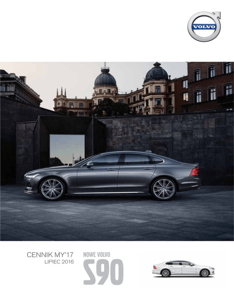 VOLVO S90 | 1 CENNIK MY’17 LIPIEC 2016 S90 NOWE VOLVO VOLVO S90 | 2 VOLVO S90 | 3 SPIS TREŚCI Jednostki napędowe 05 Wyposażenie standardowe 06 DESIGN 08 Plug-In Hybrid 09 Bezpieczeństwo 10 Komfort 10 Funkcjonalność 12 Multimedia 13 Wykończenie wnętrza 15 Tapicerki 16 Lakiery 24 Koła 25 Promocyjne pakiety wyposażenia 26 Wybrane Systemy Bezpieczeństwa 28 Volvo On Call 30 Akcesoria 32 Dane techniczne 34 VOLVO S90 | 4 VOLVO S90 | 5 SILNIKI DIESLA Silnik (litr/KM) Skrzynia biegów Cena w zł z VAT Kinetic* Momentum Inscription DESIGN* D3 FWD* 2.0/150 manualna, 6 biegów 171 600 193 700 213 800 207 200 D3 FWD* 2.0/150 automatyczna Geartronic, 6 biegów 181 200 203 300 223 400 216 800 D4 FWD* 2.0/190 manualna, 6 biegów 177 600 199 700 219 800 213 200 D4 FWD 2.0/190 automatyczna Geartronic, 8 biegów 187 200 209 300 229 400 222 800 D4 AWD* 2.0/190 automatyczna Geartronic, 8 biegów 198 200 220 300 240 400 233 800 D5 AWD 2.0/235 automatyczna Geartronic, 8 biegów – 233 200 250 100 243 700 Polestar Performance dla V90 D5 AWD Oprogramowanie Polestar zmienia charakterystykę układu napędowego, zwiększa moc oraz moment obrotowy Twojego Volvo. * silnik/wersja dostępna w produkcji od 14 listopada 2016 roku SILNIKI BENZYNOWE Silnik (litr/KM) Skrzynia biegów Cena w zł z VAT Kinetic Momentum Inscription DESIGN* T5 FWD 2.0/254 automatyczna Geartronic, 8 biegów – 218 900 235 800 229 400 T6 AWD 2.0/320 automatyczna Geartronic, 8 biegów – 274 400 291 300 284 900 PAKIET SERWISOWY VOLVO CARE Powyższe ceny zawierają pakiet serwisowy Volvo Care na okres 3 lat lub 100.000 km ( w zależności od tego, który warunek zostanie wcześniej spełniony), pokrywający koszty okresowych przeglądów, wliczając w to oryginalne części Volvo, olej oraz robociznę. Pakiet obejmuje czynności przewidziane zakresem przeglądów okresowych Volvo. Więcej informacji na temat Volvo Care, dodatkowego pakietu Care+ oraz zakresu przeglądów okresowych znajdą Państwo u Autoryzowanego Dealera Volvo. VOLVO S90 | 6 WYPOSAŻENIE STANDARDOWE Opis wyposażenia BEZPIECZEŃSTWO oraz WŁAŚCIWOŚCI JEZDNE – 7 poduszek powietrznych: dla kierowcy i pasażera, dwie poduszki boczne (dwukomorowe), kurtyny powietrzne (IC), poduszka chroniąca kolana kierowcy – CITY SAFETY - Układ wspomagania hamowania dla różnicy prędkości pomiędzy pojazdami sięgającej 50 km/h – Unikanie lub łagodzenie skutków zderzeń z innymi samochodami na skrzyżowaniach - rozwiązanie wprowadzone po raz pierwszy na świecie – Unikanie lub łagodzenie skutków zderzeń z pieszymi i rowerzystami oraz zwięrzętami do prędkości 40km/h. System działa również w ciemności – SYSTEM BEZPIECZEŃSTWA INTELLISAFE ASSIST zawiera: - Active Cruise Control (ACC) - aktywny tempomat - Pilot Assist II generacji - wspomaganie kierowania przy prędkości do 130 km/h, nie wymagające obecności pojazdu z przodu - Lane Keeping Aid (LKA) - układ utrzymania pasa ruchu - Queue Assist - funkcjonalność ACC wspomagająca jazdę w korkach: samodzielne zatrzymanie i ruszenie za pojazdem - Distance Alert - układ ostrzegania o zbyt małej odległości od poprzedzającego pojazdu – DRIVER ALERT CONTROL - układ ostrzegający o dekoncentracji kierowcy – LDW (LANE DEPARTURE WARNING) - system ostrzegania o niekontrolowanej zmianie pasa ruchu – RSI (ROAD SIGN INFORMATION) - układ informowania o znakach drogowych – Napęd na wszystkie koła AWD (All WHEEL DRIVE) Borg Warner 5 generacji z system Instant Traction™ (dla silnika D4AWD, D5AWD, T6AWD) – ESC (ELECTRONIC STABILITY CONTROL) - układ elektronicznej kontroli stabilności i trakcji – SIPS (SIDE IMPACT PROTECTION SYSTEM) system zabezpieczeń przed skutkami uderzeń bocznych – WHIPS (WHIPLASH PROTECTION SEATING SYSTEM) system zabezpieczeń przed urazami kręgosłupa szyjnego – ABS (ANTI-LOCK BRAKE SYSTEM) z elektronicznym układem rozdziału sił hamowania (EBD – Electronic Brake Distribution) – CTC (CORNER TRACTION CONTROL) - kontrola trakcji w zakręcie – TSA (TRAILER STABILITY ASSIST) system stabilizacji pojazdu w czasie holowania przyczepy – EBA (EMERGENCY BRAKE ASSISTANCE) - układ wspomagania nagłego hamowania – EBL (EMERGENCY BRAKE LIGHTS) - ostrzeganie innych użytkowników drogi o gwałtownym hamowaniu – RSC (ROLL STABILITY CONTROL) - układ stabilizacji przechyłu – Regulacja pasów bezpieczeństwa w pierwszym i drugim rzędzie siedzeń – Przednie pasy bezpieczeństwa z elektrycznymi napinaczami łagodzącymi skutki kolizji – Napinacze pasów bezpieczństwa – Zwalnianie pedału hamulca - rozwiązanie wprowadzone po raz pierwszy na świecie – Czujnik deszczu – Autoalarm Volvo Guard z czujnikiem przechyłu oraz ruchu – Zdalnie sterowany zamek centralny – Centralna blokada schowka – Immobilizer – Wyłącznik poduszki powietrznej pasażera – Elektryczny hamulec postojowy – Funkcja Auto Hold WNĘTRZE – System Audio High Performance - centralny wyświetlacz o przekątnej 9 cala - moc 330 W - 10 głośników - złącze AUX / USB – Sensus Connect Infotainment System wraz z zestawem głośnomówiacym Bluetooth. – Fotele komfortowe z tapicerką tekstylną R100 – 8" graficzny wyświetlacz zegarów – Wykończenie wnętrza CHARCOAL – ECC (ELECTRONIC CLIMATE CONTROL) - kilimatyzacja elektroniczna 2-strefowa – Trójramienna, skórzana kierownica – Sterowanie audio z kierownicy – Dywaniki tekstylne – Podświetlane lusterka wewnętrzne dla kierowcy i pasażera – Skórzane pokrycie dźwigni zmiany biegów – Komputer pokładowy z komunikatami w języku polskim – Wskaźnik temperatury zewnętrznej – Kanapa tylna (dzielona w proporcjach 40/60) – Gniazdo 12V w tylnej części konsoli centralnej – Podłokietnik przedni – Schowek w konsoli centralnej i w przednich drzwiach – Uchwyty na kubki z przodu – Lampki do czytania z przodu i z tyłu – Ręcznie składane zagłówki tylnej kanapy VOLVO S90 | 7 WYPOSAŻENIE STANDA