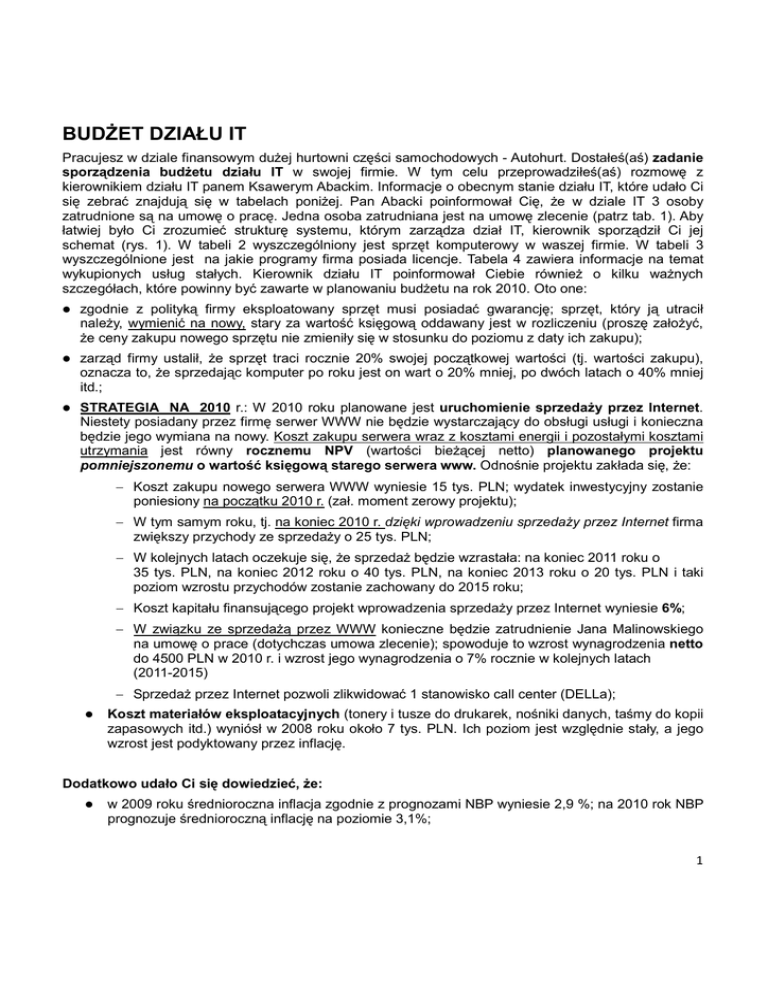 BUDśET DZIAŁU IT Pracujesz w dziale finansowym duŜej hurtowni części samochodowych - Autohurt. Dostałeś(aś) zadanie sporządzenia budŜetu działu IT w swojej firmie. W tym celu przeprowadziłeś(aś) rozmowę z kierownikiem działu IT panem Ksawerym Abackim. Informacje o obecnym stanie działu IT, które udało Ci się zebrać znajdują się w tabelach poniŜej. Pan Abacki poinformował Cię, Ŝe w dziale IT 3 osoby zatrudnione są na umowę o pracę. Jedna osoba zatrudniana jest na umowę zlecenie (patrz tab. 1). Aby łatwiej było Ci zrozumieć strukturę systemu, którym zarządza dział IT, kierownik sporządził Ci jej schemat (rys. 1). W tabeli 2 wyszczególniony jest sprzęt komputerowy w waszej firmie. W tabeli 3 wyszczególnione jest na jakie programy firma posiada licencje. Tabela 4 zawiera informacje na temat wykupionych usług stałych. Kierownik działu IT poinformował Ciebie równieŜ o kilku waŜnych szczegółach, które powinny być zawarte w planowaniu budŜetu na rok 2010. Oto one: zgodnie z polityką firmy eksploatowany sprzęt musi posiadać gwarancję; sprzęt, który ją utracił naleŜy, wymienić na nowy, stary za wartość księgową oddawany jest w rozliczeniu (proszę załoŜyć, Ŝe ceny zakupu nowego sprzętu nie zmieniły się w stosunku do poziomu z daty ich zakupu); zarząd firmy ustalił, Ŝe sprzęt traci rocznie 20% swojej początkowej wartości (tj. wartości zakupu), oznacza to, Ŝe sprzedając komputer po roku jest on wart o 20% mniej, po dwóch latach o 40% mniej itd.; STRATEGIA NA 2010 r.: W 2010 roku planowane jest uruchomienie sprzedaŜy przez Internet. Niestety posiadany przez firmę serwer WWW nie będzie wystarczający do obsługi usługi i konieczna będzie jego wymiana na nowy. Koszt zakupu serwera wraz z kosztami energii i pozostałymi kosztami utrzymania jest równy rocznemu NPV (wartości bieŜącej netto) planowanego projektu pomniejszonemu o wartość księgową starego serwera www. Odnośnie projektu zakłada się, Ŝe: − Koszt zakupu nowego serwera WWW wyniesie 15 tys. PLN; wydatek inwestycyjny zostanie poniesiony na początku 2010 r. (zał. moment zerowy projektu); − W tym samym roku, tj. na koniec 2010 r. dzięki wprowadzeniu sprzedaŜy przez Internet firma zwiększy przychody ze sprzedaŜy o 25 tys. PLN; − W kolejnych latach oczekuje się, Ŝe sprzedaŜ będzie wzrastała: na koniec 2011 roku o 35 tys. PLN, na koniec 2012 roku o 40 tys. PLN, na koniec 2013 roku o 20 tys. PLN i taki poziom wzrostu przychodów zostanie zachowany do 2015 roku; − Koszt kapitału finansującego projekt wprowadzenia sprzedaŜy przez Internet wyniesie 6%; − W związku ze sprzedaŜą przez WWW konieczne będzie zatrudnienie Jana Malinowskiego na umowę o prace (dotychczas umowa zlecenie); spowoduje to wzrost wynagrodzenia netto do 4500 PLN w 2010 r. i wzrost jego wynagrodzenia o 7% rocznie w kolejnych latach (2011-2015) − SprzedaŜ przez Internet pozwoli zlikwidować 1 stanowisko call center (DELLa); Koszt materiałów eksploatacyjnych (tonery i tusze do drukarek, nośniki danych, taśmy do kopii zapasowych itd.) wyniósł w 2008 roku około 7 tys. PLN. Ich poziom jest względnie stały, a jego wzrost jest podyktowany przez inflację. Dodatkowo udało Ci się dowiedzieć, Ŝe: w 2009 roku średnioroczna inflacja zgodnie z prognozami NBP wyniesie 2,9 %; na 2010 rok NBP prognozuje średnioroczną inflację na poziomie 3,1%; 1 w 2009 roku płace w branŜy IT zgodnie z prognozami GUS wzrosną o 7%, a płace wysoko specjalizowanych administratorów wzrosną o 9%; zakłada się, Ŝe w roku 2010 tempo wzrostu płac będzie mniejsze o 0,75 punktu procentowego; dział IT potrzebuje posiadać pewien budŜet na niespodziewane inwestycje, rozbudowę i serwis sprzętu pensja netto stanowi około 70% kosztu zatrudnienia pracownika. Proszę sporządzić budŜet firmy Autokar na 2010 rok uwzględniając powyŜsze informacje. Table 1: Stan zatrudnienia w dziale IT w roku 2008 Lp. Nazwisko, imię Stanowisko Data zawarcia umowy Miesięczne wynagrodzenie netto w 2009 r. 1 Abacki, Ksawery Kierownik działu IT 12.10.1997 7500 2 Kowalski, Zenon Administrator baz danych oraz systemów UNIX i linux 27.02.2001 6500 3 Malinowski, Jan Deweloper stron www i aplikacji webowych (umowa zlecenie) 19.12.2008 3500 4 Iksińska, Katarzyna Administrator systemów Windows oraz wsparcie dla uŜytkowników 31.11.2002 4500 Rysunek 1: Schemat struktury informatycznej firmy Autohurt. 2 Table 2: Sprzęt komputerowy posiadany przez firmę Autohurt Lp. Nazwa sprzętu Sztuk Data zakupu Termin wygaś. Gwarancji Cena brutto zakupu PLN 1 Serwer bazodanowy (Oracle) IBM Power System 1 2007-12-17 2010-12-17 45000 2 Serwer aplikacyjny (ERP) IBM Power System 1 2009-12-17 2010-12-16 25000 3 Serwer aplikacyjny (CRM), HP Integrity 1 2008-05-10 2010-05-10 30000 4 Fire wall 1 2008-04-18 2011-04-17 3000 5 Serwer www, Sun Fire 1 2009-06-30 2012-06-29 10000 6 Stacja robocza call center, DELL 2 2007-07-12 2010-07-11 3500 7 Stacja robocza call center, HP 2 2008-03-30 2010-03-29 3000 8 Laptop, Lenovo 5 2009-01-12 2011-01-11 2500 9 Laptop, HP 5 2009-02-12 2011-02-11 3600 10 Laptop, Acer 5 2008-12-30 2011-12-29 2000 11 Laptop, Asus 5 2009-09-11 2010-09-10 1600 12 Serwer poczty, DELL 1 2009-07-12 2012-07-12 4000 13 Zestaw komputerowy TRIO (komputer, drukarka, monitor) 3 2009-11-10 2011-11-09 3500 14 Zestaw komputerowy IBM 3 2008-03-04 2011-03-03 4000 15 Drukarka Samsung 2 2008-10-09 2010-10-09 500 16 Drukarka OKI (igłowa do faktur) 2 2009-05-14 2012-05-13 300 17 Drukarka OKI (igłowa do faktur) 3 2009-10-28 2012-10-12 300 3 Table 3: Licencjonowane oprogramowanie Lp. Nazwa L-ba sztuk oprogramowania Data zakupu Termin wygaśnięcia licencji Cena brutto zakupu PLN 1 AIX (IBM) 2 Tak jak serwer Tak jak serwer 7000 2 Oracle (IBM) 1 Tak jak serwer Tak jak serwer 4500 3 ERP (IBM) 1 Tak jak serwer Tak jak serwer 5000 4 HP-UX 1 Tak jak serwer Tak jak serwer 9000 5 CRM 1 Tak jak serwer Roczna licencja 2000 6 ERP