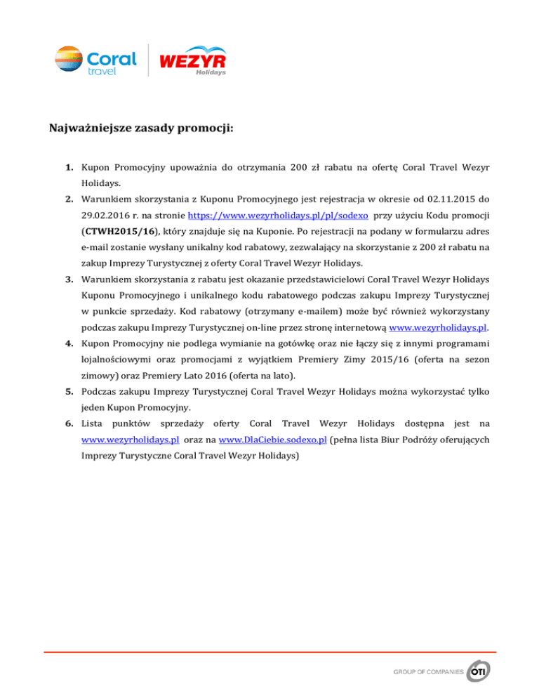 Najważniejsze zasady promocji: 1. Kupon Promocyjny upoważnia do otrzymania 200 zł rabatu na ofertę Coral Travel Wezyr Holidays. 2. Warunkiem skorzystania z Kuponu Promocyjnego jest rejestracja w okresie od 02.11.2015 do 29.02.2016 r. na stronie https://www.wezyrholidays.pl/pl/sodexo przy użyciu Kodu promocji (CTWH2015/16), który znajduje się na Kuponie. Po rejestracji na podany w formularzu adres e-mail zostanie wysłany unikalny kod rabatowy, zezwalający na skorzystanie z 200 zł rabatu na zakup Imprezy Turystycznej z oferty Coral Travel Wezyr Holidays. 3. Warunkiem skorzystania z rabatu jest okazanie przedstawicielowi Coral Travel Wezyr Holidays Kuponu Promocyjnego i unikalnego kodu rabatowego podczas zakupu Imprezy Turystycznej w punkcie sprzedaży. Kod rabatowy (otrzymany e-mailem) może być również wykorzystany podczas zakupu Imprezy Turystycznej on-line przez stronę internetową www.wezyrholidays.pl. 4. Kupon Promocyjny nie podlega wymianie na gotówkę oraz nie łączy się z innymi programami lojalnościowymi oraz promocjami z wyjątkiem Premiery Zimy 2015/16 (oferta na sezon zimowy) oraz Premiery Lato 2016 (oferta na lato). 5. Podczas zakupu Imprezy Turystycznej Coral Travel Wezyr Holidays można wykorzystać tylko jeden Kupon Promocyjny. 6. Lista punktów sprzedaży oferty Coral Travel Wezyr Holidays dostępna jest na www.wezyrholidays.pl oraz na www.DlaCiebie.sodexo.pl (pełna lista Biur Podróży oferujących Imprezy Turystyczne Coral Travel Wezyr Holidays)