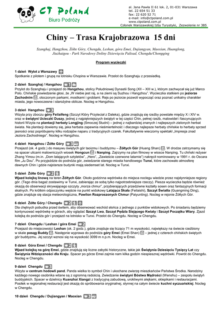 al. Jana Pawła II 61 lok. 2, 01-031 Warszawa tel. 22 654 51 33 fax: 22 620 52 71 e-mail: [email protected] www.ctpoland.com.pl Członek Warszawskiej Izby Turystyki, Zezwolenie nr 385 Chiny – Trasa Krajobrazowa 15 dni Szanghaj, Hangzhou, Żółte Góry, Chengdu, Leshan, góra Emei, Dujiangyan, Maoxian, Huanglong, Jiuzhaigou - Park Narodowy Doliny Dziewięciu Palisad, Chengdu/Chongqing Program wycieczki 1 dzień Wylot z Warszawy Spotkanie z pilotem i grupą na lotnisku Chopina w Warszawie. Przelot do Szanghaju z przesiadką. 2 dzień Szanghaj / Hangzhou Przylot do Szanghaju i przejazd do Hangzhou, stolicy Południowej Dynastii Song (XII – XIII w.), którym zachwycał się już Marco Polo. Chińskie powiedzenie głosi, że „W niebie jest raj, a na ziemi są Suzhou i Hangzhou”. Wycieczka statkiem po jeziorze Zachodnim , otoczonym parkami, mostkami i groblami. Rejs po jeziorze pozwoli wypocząć oraz poznać unikalny charakter miasta, jego nowoczesne i starożytne oblicze. Nocleg w Hangzhou. 3 dzień Hangzhou Wizyta przy zboczu góry Feilaifeng (Szczyt Który Przyleciał z Daleka), gdzie znajdują się rzeźby powstałe między X i XIV w. oraz w świątyni Ucieczki Duszy, jednej z najpiękniejszych świątyń w tej części Chin, pełnej rzeźb, malowideł i fascynujących historii Wizyta na plantacji herbaty Longjing (Smoczej Studni) – jednej z najbardziej znanych i najlepszych zielonych herbat świata. Na plantacji dowiemy się, jaka herbata zapewnia nieśmiertelność i dlaczego najlepsze herbaty chińskie to herbaty sprzed jasności oraz popróbujemy kilku rodzajów naparu z tradycyjnych czarek. Fakultatywnie wieczorny spektakl „Impresja znad Jeziora Zachodniego”. Nocleg w Hangzhou. 4 dzień Hangzhou / Żółte Góry Przejazd (ok. 4 godz.) do masywu świętych gór taoizmu i buddyzmu – Żółtych Gór (Huang Shan) . W drodze zatrzymamy się na spacer ulicami malowniczych wiosek Hongcun i Nanping. Zajrzymy na plan filmowy w wiosce Nanping. Tu chiński reżyser Zhang Yimou (m.in. „Dom latających sztyletów”, „Hero”, „Zawieście czerwone latarnie”) nakręcił nominowany w 1991 r. do Oscara film „Ju Dou”. Po przyjeździe do podnóża gór, zwiedzanie starego miasta handlowego Tunxi, które zachowało atmosferę dawnych Chin i gdzie najstarsze budynki mają siedemset lat. Nocleg w Tunxi. 5 dzień Żółte Góry Wjazd kolejką linową na teren Żółtych Gór. Około godzinna wędrówka do miejsca noclegu wiedzie przez najsłynniejsze regiony gór. (Tego dnia bagaż zostawimy w Tunxi, zabierając ze sobą tylko najpotrzebniejsze rzeczy). Piesza wycieczka będzie również okazją do obserwacji skrywającego szczyty „morza chmur”, przybierających przedziwne kształty sosen oraz fantazyjnych formacji skalnych. Po krótkim odpoczynku wejście na punkt widokowy Latająca Skała (Feilaishi), Szczyt Światła (Guangming Ding), gdzie znajduje się stacja meteorologiczna, Pawilon Rozproszonych Chmur (Paiyunting). Nocleg w rejonie Żółtych Gór. 6 dzień Żółte Góry / Chengdu Dla chętnych pobudka przed świtem, aby obserwować wschód słońca z jednego z punktów widokowych. Po śniadaniu będziemy kontynuować wędrówkę w górach, aby oglądać Szczyt Lwa, Szczyt Pędzla Siejącego Kwiaty i Szczyt Początku Wiary. Zjazd kolejką do podnóża gór i przejazd na lotnisko w Tunxi. Przelot do Chengdu. Nocleg w Chengdu. 7 dzień Chengdu / Leshan / góra Emei Przejazd do miejscowości Leshan (ok. 2 godz.), gdzie znajduje się liczący 71 m wysokości, największy na świecie rzeźbiony w skale posąg Buddy . Następnie wyprawa do podnóża góry Emei (Emei Shan) – jednej z czterech chińskich świętych gór buddyzmu. Jej szczyt wznosi się na wysokość 3099 m n.p.m. Nocleg w Emei. 8 dzień Góra Emei / Chengdu Wjazd kolejką na górę Emei, gdzie znajdują się liczne zabytki historyczne, takie jak Świątynia Dziesięciu Tysięcy Lat czy Świątynia Wdzięczności dla Kraju. Spacer po górze Emei zajmie nam kilka godzin niespiesznej wędrówki. Powrót do Chengdu. Nocleg w Chengdu. 9 dzień Chengdu Wizyta w centrum hodowli pand. Panda wielka to symbol Chin i ukochane zwierzę mieszkańców Państwa Środka. Narodziny każdego nowego osobnika witane są z ogromną radością. Zwiedzanie świątyni Bóstwa Mądrości (Wenshu) – zespołu świątyń buddyjskich. Spacer w dzielnicy Kuanzhai Xiangzi z tradycyjną zabudową, urokliwymi alejkami, sklepikami i restauracjami. Posiłek w regionalnej restauracji jest okazją do spróbowania oryginalnej, słynnej na całym świecie kuchni syczuańskiej. Nocleg w Chengdu. 10 dzień Chengdu / Dujiangyan / Maoxian Przejazd do Dujiangyan i zwiedzanie tamtejszego systemu irygacyjnego , którego początki sięgają III w. p.n.e. i który wciąż działa, regulując rzekę Min. Jeśli czas pozwoli spacer po starannie zrekonstruowanym w tradycyjnym stylu centrum. Dalszy przejazd do Maoxian (ok. 4 godz.). Trasa prowadzi przez okolice parku leśnego Longchi i prefekturę Aba, a także urokliwe miasteczka, zamieszkałe przez ludność tybetańską. Nocleg w Maoxian. 11 dzień Maoxian / Huanglong / Jiuzhaigou Przejazd do doliny Huanglong przez rdzennie tybetańskie tereny północnego Syczuanu (ok. 3 godz.). Scenerię doliny Huanglong stanowią liczne tarasowe sadzawki otoczone przez górskie szczyty i lodowce. Wycieczkę rozpoczniemy wjazdem kolejką do jednego z najwyżej położonych miejsc, aby przejść do górnej świątyni. Ścieżka w dół (ok. 2 godz.) poprowadzi nas przez fantastyczne krajobrazy Stawu Odbijającego Księżyc, Stawu Azalii i Mostu Witającego Nieśmiertelnych. Dalszy przejazd (ok. 2 godz.) do Jiuzhaigou, czyli doliny Dziewięciu Palisad. Nocleg w Jiuzhaigou. 12 dzień Park Narodowy Doliny Dziewięciu Palisad Całodniowy pobyt na terenie Parku Narodowego Doliny Dziewięciu Palisad . Jego piękna sceneria z setkami jezior, licznymi wodospadami, skalistymi wierzchołkami gór i lasami, a także malowniczo
