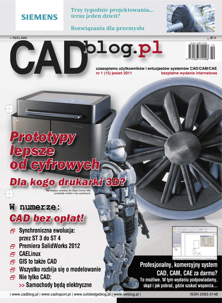 Trzy tygodnie projektowania... teraz jeden dzień? Rozwiązania dla przemysłu REKLAMA czasopismo użytkowników i entuzjastów systemów CAD/CAM/CAE nr 1 (15) jesień 2011 bezpłatne wydanie internetowe Prototypy lepsze od cyfrowych Dla kogo drukarki 3D? Na okładce: drukarka 3D Objet Connex 350 i przykłady modeli z niej uzyskanych W numerze: CAD bez opłat! przez ST 3 do ST 4 Premiera SolidWorks 2012 CAELinux GIS to także CAD Wszystko rozbija się o modelowanie Nie tylko CAD: >> Samochody będą elektryczne Profesjonalny, komercyjny system CAD, CAM, CAE za darmo? To możliwe. W tym wydaniu podpowiadamy, skąd i jak pobrać, gdzie szukać wsparcia... | www.cadblog.pl | www.cadraport.pl | www.solidedgeblog.pl | www.swblog.pl | ISSN 2083-3148 Naszych specjalistów znajdą Państwo na stoisku Siemens (nr 218) podczas targów Toolex i Wirtotechnologia 2011 CADblog.pl W numerze fot.: Objet, BibusMenos Od redakcji 4 Czterdzieści i cztery Zasoby on-line 5 Konkurs „Go, Gadżet Go!” 5 Cortona 3D czyli o PLM inaczej... 5 Jest ZWCAD 2012 beta! 5 Od szkicu 2D do modelu 3D 5 SolidWorks 2012 – projektowanie, które jest siłą napędową biznesu Nasza okładka Nowa drukarka 3D (urządzenie do szybkiego prototypowania) Objet Connex 350 i przykłady CADblog.pl wersja w pdf modeli z niej uzyskanych Więcej o szybkim prototypowaniu na stronie 14. Strefa OpenSource 6 CAELinux darmowa platforma dla inżynierów Ktoś stwierdził niegdyś, iż ,,próba przekonania, że można sensownie CADować na Linuksie, jest raczej z góry skazana na niepowodzenie’’. Miast wdawać się w polemikę z autorem owego stwierdzenia, zaproponuję w jaki sposób można to robić – i to w zupełności za darmo – całkowicie legalnie (...) Temat numeru 9 CAD 2D i 3D dostajemy za darmo Gdyby ktoś zechciał prześledzić i zebrać w jednym opracowaniu wszystkie dostępna edycja papierowa premiery, wszelkie nowości, pojawiające się dodatki i usprawnienia wprowadzane ISSN 2083-3032 przez uznanych światowych dostawców rozwiązań CAD w ciągu całego kalendarzowego roku, znacznie przekroczyłby łamy nie tylko niniejszego artykułu, CADblog.pl www.cadblog.pl Czasopismo i blog użytkowników systemów CAD, CAM, CAE, dostępna wersja papierowa i wydanie elektroniczne w plikach pdf nakład wydania papierowego: 1000 egzemplarzy szacowana liczba pobrań wydania pdf: 4000 redaktor naczelny: Maciej Stanisławski [email protected] kom.: 602 336 579 adres redakcji: ul. Jeździecka 21c/43, 05-077 Warszawa (Wesoła), tel./faks: 22 401 27 38 prenumerata: [email protected] wydawca: Studio Graficzne Stanisławski ul. Pilicka 22, 02-613 Warszawa opracowanie graficzne, DTP: [email protected] druk i oprawa: LOTOS Poligrafia Sp. z o.o. www.lotos-poligrafia.pl oddano do druku: 27.09.2011 r. CADblog.pl jest tytułem prasowym zarejestrowanym w krajowym rejestrze dzienników i czasopism na podstawie postanowienia Sądu Okręgowego Warszawa VII Wydział Cywilny rejestrowy Ns Rej. Pr. 244/09 z dnia 31.03.2009 poz. Pr 15934 Redakcja nie zwraca materiałów nie zamówionych oraz zastrzega sobie prawo do zmian, skracania i adjustacji tekstów. Wszelkie prawa zastrzeżone. Redakcja udziela zgody na wykorzystanie (w tym przedruk materiałów lub ich części) po uprzednim kontakcie. Publikowane artykuły odzwierciedlają (chociaż nie zawsze) poglądy redakcji. ale... większości czasopism o tematyce inżynierskiej (...) Druk 3D 14 Myszki i węże Od kiedy Charles Hull odkrył możliwość punktowego utwardzania powłok polimerowych laserem niskiej mocy, rozpoczął się prawdziwy rozwój technologii szybkiego prototypowania (...) GIS to także CAD 18 CAD dla geodety cz. I Nie tylko CAD... 23 Samochody będą elektryczne Strefa Solid Edge 28 Przez ST 3 do ST 4 Strefa SolidWorks 34 „Nie odejdziemy od Parasolida” Z innej perspektywy, czyli pytania o CAD... 40 Wszystko rozbija się o modelowanie... Strefa historyczna 42 Rozświetlić mrok Za treść ogłoszeń reklamowych redakcja nie odpowiada. edycja pdf wydanie 1(15) 2011 CADblog.pl 3 CADblog.pl Od redakcji 4 edycja pdf wydanie 1(15)2011 CADblog.pl nie miałyby szansy pojawić się w postaci drukowanej – pismo musiałoby liczyć grubo ponad 100 stron, a część z informacji zdążyłaby się zdezaktualizować, przy cyklu wydawniczym zakładającym jedno wydanie kwartalne. Wszystko jednak wskazuje na to, iż częstotliwość tą uda się zwiększyć, a to za sprawą sponsorów i reklamodawców. I w tym miejscu wypada złożyć podziękowania: po pierwsze – stałemu i stale rosnącemu gronu Czytelników, za okazywane zainteresowanie i... cierpliwość. Po drugie – Reklamodawcom i Sponsorom, szczególnie tym, którzy są z CADblog.pl od początku, za okazane zaufanie i wiarę w powodzenie tego przedsięwzięcia. W imieniu zespołu Życzę miłej lektury Maciej Stanisławski Warszawa, dn. 26.09.2011 r. CADblog.pl wersja w pdf Pamiętam dobrze czasopismo CADALYST sprzed kilku lat. W swojej biblioteczce powinienem gdzieś nawet mieć, liczący około 60 stron, egzemplarz. Ze smutkiem przyjąłem informację o tym, iż przestało ukazywać się w postaci papierowej i z tym większą radością powitałem fakt, iż po rocznej przerwie zaczęło ukazywać się na nowo. Otrzymałem zamówiony egzemplarz promocyjny (cena regularna to 9,99 USD; wcześniej tytuł był bezpłatny!) i z wielkim zdziwieniem skonstatowałem, iż jego objętość zmniejszyła się o blisko połowę (32 strony z okładką). A jednak nie w objętości, lecz w treści i w sieciowych zasobach tkwi siła tego jednego z najstarszych anglojęzycznych tytułów poświęconych szeroko rozumianej tematyce CAD. Łatwo domyśleć się, dlaczego o tym piszę. Po blisko roku od momentu ogłoszenia, iż przygotowuję papierową wersję tego, co oferowałem Państwu do tej pory jedynie w postaci on-line, owa zapowiedź doczekała się realizacji. W tzw. międzyczasie zmieniła się koncepcja czasopisma, jego zawartości, układu