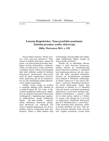 Teraźniejszość – Człowiek – Edukacja 2012 Nr 1(57) Lucyna Kopciewicz, Nauczycielskie poniżanie. Szkolna przemoc wobec dziewcząt, Difin, Warszawa 2011, s. 192 Nauczycielskie poniżanie. Szkolna przemoc wobec dziewcząt autorstwa L. Kopciewicz to książka, która jątrzy, zmusza do pytań, a po przeczytaniu powoduje intrygujące uczucie dyskomfortu i niedowierzania: czy takie rzeczy wciąż są możliwe w polskiej szkole? Lektura tej monografii daje także unikalny asumpt do dyskusji dotyczących zastosowania klasycznych teorii do analiz współczesnej rzeczywistości społecznej, jak też do zastanowienia się nad metodologią badań jakościowych i granic interpretacji. Autorka zwraca uwagę na przełom w socjologii edukacji, który dokonał się w późnych latach 80. XX wieku. Z klasycznym podejściem badawczym, skupionym na analizach nierówności klasowych, wynikających z kapitalistycznej organizacji społeczeństwa, zaczęły konkurować analizy – jak pisze autorka – „małych” różnic: etnicznych, kastowych, seksualnych, płciowych, czy cielesnych. Ten zwrot w naukach społecznych, za Z. Kwiecińskim, nazywa somatyzacją nauk społecznych. Zatem w jakim punkcie tego ewolucyjnego rozwoju badań nad somatyzacją współczesnej kultury sytuuje się Nauczycielskie poniżanie? Wydaje się, że zakreślając obowiązujący w pracy horyzont teoretyczny, autorka zmierza do skonfrontowania przeciwstawnych tendencji w badaniach nad socjalizacją płciową, tak aby stanowiły dla siebie nawzajem komentarz. Zaczyna od szczegółowego przeglądu teorii praktyk P. Bourdieu, zaznaczając, że bardzo ważne jest w tym ujęciu założenie o cielesnym charakterze poznawania świata społecznego. Należy tutaj powtórzyć za autorką, że u P. Bourdieu ciało jest przede wszystkim konstruktem społecznym, co jest nawet bardziej radykalnym twierdzeniem o „naturze” ciała niż to, które można znaleźć u J. Butler. Co więcej, ciało sprzęga się w tej teorii ze społecznymi strukturami klasowymi, jako że P. Bourdieu pisze o „ciele klasy”. Ciało ucieleśnia klasy społeczne, obiektywizując określony ich gust; ciało poprzez pozornie naturalne cechy fizyczne oraz wygląd zewnętrzny wyraża klasę 150 Wojciech SIEGIEŃ społeczną; ciało jest klasowo zdeterminowane, odtwarza społeczną strukturę klasową. Oczywiście, istota tego rekonstrukcji sprowadza się do odtworzenia hierarchii społecznej, z hegemonią właściwości dominującej klasy społecznej. Trzeba powiedzieć, że przykład badań P. Bourdieu nad ubiorem, przytoczony przez autorkę jako egzemplifikacja różnic w ucieleśnianiu właściwości klasy ludowej i średniej, przedstawia się dzisiaj osobliwie. Jest tak dlatego, że w opisie konsekwentnie stosowane są pojęcia klasy ludowej i klasy średniej, jako przeciwstawnych sobie. Te różnice wydają się skrajnie esencjalizowane, co prowadzi do wypreparowania typów idealnych, modelowych przedstawicieli poszczególnych klas. To z kolei pozwala na przywołanie przez autorkę wniosków P. Bourdieu, jakoby kobiety z klas ludowych, inaczej niż te ze średnich, nie zdawały sobie sprawy z handlowej wartości urody. Dlatego są częściej zaniedbane. W związku ze swymi badaniami nad Kabylami jest P. Bourdieu czasem uważany za etnologa. Polscy etnolodzy nie zgodziliby się jednak z takimi wnioskami P. Bourdieu dotyczącymi klas ludowych, które, na marginesie, zwykło się nazywać społeczeństwami typu tradycyjnego. Bogata tradycja polskiej etnografii regionalnej, z opisami bardzo zróżnicowanej mody ludowej dowodzi raczej wagi, jaką dawniej przywiązywano do mody i urody właśnie. Innymi słowy, miało znaczenie to, czy ktoś chodził w postołach, czy w butach z giemzy. Piszę o tym także dlatego, że przegląd teorii P. Bourdieu już od pierwszych stron książki zdaje się implikować nieprzystawalność klasycznych teorii do aktualnej rzeczywistości. Jest tak choćby w przypadku pojęć klasy ludowej, średniej czy wyższej. Pola znaczeniowe tych kategorii są dzisiaj tak rozmyte, że użycie ich do opisu rzeczywistości w warunkach późnego kapitalizmu staje się coraz bardziej nieadekwatne. Do płynnej rzeczywistości bardziej przystają płynne kategorie, takie chociażby jak „prekariat”. Następnie autorka przechodzi do prezentacji prac M. Foucaulta, podkreślając znaczenie pojęcia biowładzy. Tutaj przenosimy się na poziom dużych formacji dyskursywnych. Wraz z postępującym rozwojem kapitalizmu mieliśmy do czynienia z rozwojem dyskursów służących rozwojowi technik dyscyplinowania ciał. Celem był wzrost wydajności i produktywności ciał. Co podkreśla autorka, a co jest bardzo istotne dla analiz materiału zawartych w pracy, to podniesiona przez M. Foucaulta kwestia upłciowienia ciał. Chodzi o obowiązującą jeszcze obecnie, a nie archaiczną tendencję do nadawania ciału określonej płci. Otóż każde ciało musi posiadać płeć, która ma być „prawdziwa”. Jak pisze cytowany M. Foucault, odtąd przypisujemy bez wyjątku każdemu jedną płeć i tylko jedną. Być może, właśnie wraz z tym nakazem pojawia się tendencja do wzmacniania granic płciowych i redukcji niejasności związanych z przepuszczalnością kategorii płci, co tak sugestywnie pokazuje autorka w analitycznej części monografii. Szczegółowe przedstawienie koncepcji P. Bourdieu i M. Foucaulta posłużyło autorce za kanwę, na której dokonuje kluczowych dla dalszych analiz rewizji, Lucyna Kopciewicz, Nauczycielskie poniżanie. Szkolna przemoc wobec dziewcząt... a te stanowią o właściwej mocy krytycznego aparatu analitycznego. Rewidujące spojrzenie ogniskuje się bowiem nie na ogólnej kategorii upłciowionego ciała czy seksualności, co zazwyczaj sprowadza się do milczącego uznania ciała męskiego jako wzorca do analiz. Tutaj chodzi o ciała kobiece lub ciała niemęskie. Przedstawione dalej prace S. Lee Bartky są przykłade