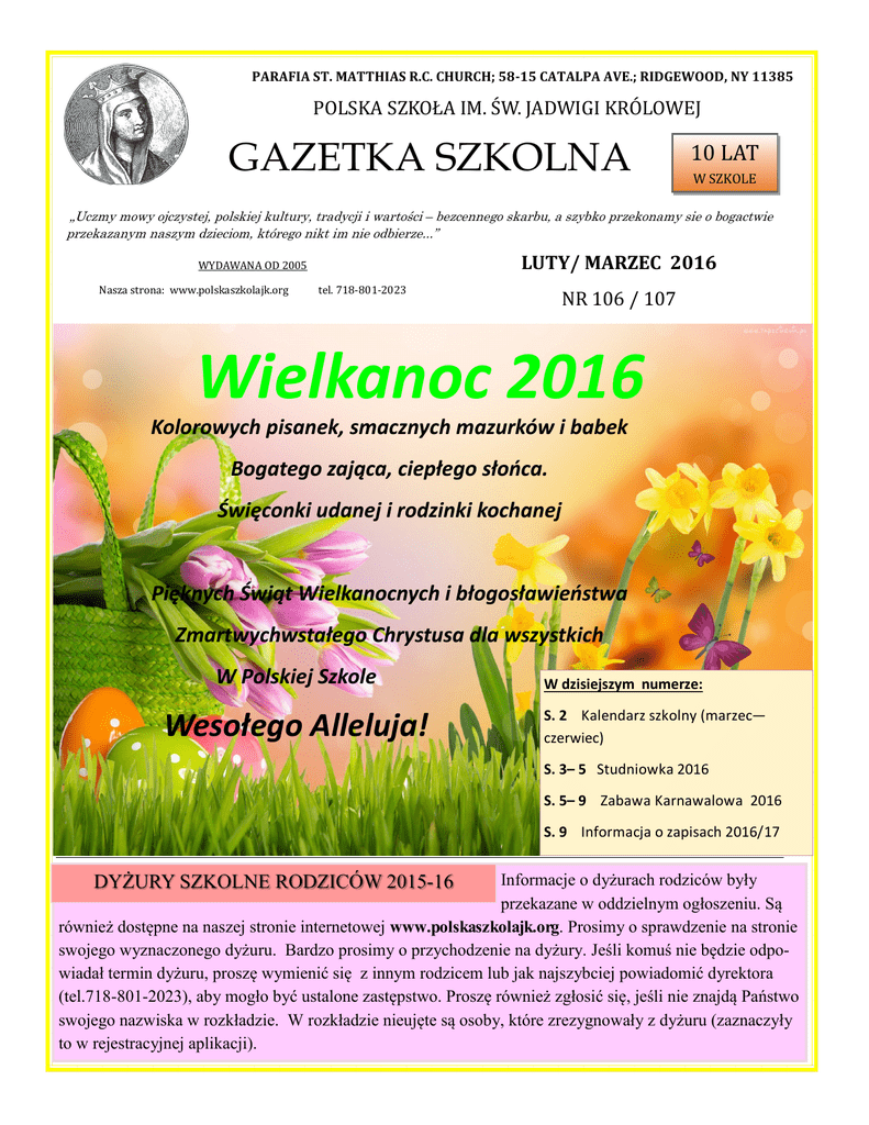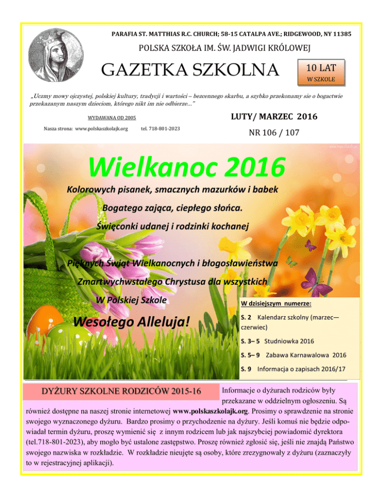 PARAFIA ST. MATTHIAS R.C. CHURCH; 58-15 CATALPA AVE.; RIDGEWOOD, NY 11385 POLSKA SZKOŁA IM. SW. JADWIGI KROLOWEJ GAZETKA SZKOLNA 10 LAT W SZKOLE „Uczmy mowy ojczystej, polskiej kultury, tradycji i wartości – bezcennego skarbu, a szybko przekonamy sie o bogactwie przekazanym naszym dzieciom, którego nikt im nie odbierze...” LUTY/ MARZEC 2016 WYDAWANA OD 2005 Nasza strona: www.polskaszkolajk.org tel. 718-801-2023 NR 106 / 107 Wielkanoc 2016 Kolorowych pisanek, smacznych mazurków i babek Bogatego zająca, ciepłego słońca. Święconki udanej i rodzinki kochanej Pięknych Świąt Wielkanocnych i błogosławieństwa Zmartwychwstałego Chrystusa dla wszystkich W Polskiej Szkole Wesołego Alleluja! W dzisiejszym numerze: S. 2 Kalendarz szkolny (marzec— czerwiec) S. 3– 5 Studniowka 2016 S. 5– 9 Zabawa Karnawalowa 2016 S. 9 Informacja o zapisach 2016/17 DYŻURY SZKOLNE RODZICÓW 2015-16 Informacje o dyżurach rodziców były przekazane w oddzielnym ogłoszeniu. Są również dostępne na naszej stronie internetowej www.polskaszkolajk.org. Prosimy o sprawdzenie na stronie swojego wyznaczonego dyżuru. Bardzo prosimy o przychodzenie na dyżury. Jeśli komuś nie będzie odpowiadał termin dyżuru, proszę wymienić się z innym rodzicem lub jak najszybciej powiadomić dyrektora (tel.718-801-2023), aby mogło być ustalone zastępstwo. Proszę również zgłosić się, jeśli nie znajdą Państwo swojego nazwiska w rozkładzie. W rozkładzie nieujęte są osoby, które zrezygnowały z dyżuru (zaznaczyły to w rejestracyjnej aplikacji). GAZETKA SZKOLNA NR 106-107 STR. 2 9:00 do 9:55 10:00 do 14:00 14:00 do 14:55 Religia Zajęcia lekcyjne Kółka art./ Religia R- religia; RŁ – religia łączona; MARZEC 5 R/K 6 12 R/K 19 R/K 26 2 Pierwsza Spowiedź Św. godz. 14:15 w kościele. Zebranie Komitetu Rodzicielskiego i Trójek Klasowych (rozliczenie, matura, dzień matki, dzień dziecka) – godz. 12:00 w kafeterii 9 Międzyszkolny KONKURS opowiadania baśni i legend w Fundacji Kościuszkowskiej – godz. 9:30. Przerwa Świąteczna - Wielkanoc K R/K 16 R Lekcje do 12:00 23 K 30 *Kalendarz może ulec zmianie R/K MAJ 7 Lekcje do 13:00 RŁ 21 R/K KOMUNIA ŚW. Nie ma lekcji religii. Klasa 2a, 2b, 2c nie ma lekcji w tym dniu. Konferencja klasyfikacyjna RP Uroczysta akademia DZIEŃ MATKI -poczęstunek dla mam -12:30, Rozpoczęcie przedstawienia z dziećmi – 13:00 Rozdanie dyplomów i nagród z konkursów szkolnych -13:30 UROCZYSTE ZAKOŃCZENIE ROKU SZKOLNEGO DLA KLASY 8-mej i 11-tej – godz. 12:30 Zakończenie religii i kółek – ostatnie zajęcia 28 Wolne K – kółka art. KWIECIEŃ WIELCY POLACY – JP II – przygotowanie do prezentacji. wolne 14 / LUTY — MARZEC 2016 Egzamin dla dzieci komunijnych – godz. 8:00 MATURA 2016 - pisemna godz. 9:00 Lekcje prowadzone wg planu MATURA 2016 - ustna godz. 12:00 Religia (klasa popołudniowa) o 12:00 – 13:00 Rekolekcje komunijne godz. 9:00 – 14:30 ZAPISY kl. 0-11. godz. 9:00 – 15:00. Szczegółowe informacje będą przesłane w folderach. CZERWIEC 5 Lekcje do13:00 DZIEŃ DZIECKA Zebranie RP – godz. 13:00 11 UROCZYSTE ZAKOŃCZENIE ROKU SZKOLNEGO 2015/16 - godz. 10:00 18 Zapisy otwarte dla nowych uczniów oraz na religię - godz. 9:00 – 13:00 w kafeterii Memorial Day Weekend. Zjazd Nauczycieli na Florydzie. *Kalendarz może ulec zmianie GAZETKA SZKOLNA NR 106-107 / LUTY — MARZEC 2016 STR. 3 STUDNIÓWKA 2016 STR. 4 GAZETKA SZKOLNA NR 106-107 / LUTY — MARZEC 2016 W dniu 6 lutego 2016 roku o godz. 19:00 rozpoczął się w „Astoria Manor” w NY bal studniówkowy. Wzięło w nim udział 10 naszych uczniów, którzy w kwietniu przystąpią do matury. W ciągu 11 lat nauki przeżyli wiele miłych, radosnych chwil w Polskiej Szkole. Studniówka – to jedno z ostatnich wydarzeń, w których mogą uczestniczyć - mamy nadzieję, że niezapomniane wrażenia z balu pozostaną w ich pamięci na zawsze. Zanim dotarli na bal, mieli okazje raz jeszcze pobyć wspólnie poza klasą oraz zrobić piękne pamiątkowe zdjęcia w okolicach NY. W pełnej gali, odświętnie ubrani – prezentowali się wspaniale. Całkowicie wypełniona sala bankietowa „pękała w szwach”, ledwie mieściła całą młodzież maturalną tańczącą poloneza. Po części oficjalnej rozpoczął się bal. Nikt nie siedział – wszyscy wspaniale się bawili. Pełni wzruszenia, przybyli na bal zaproszeni nauczyciele byli bardzo dumni z naszej młodzieży. Nasi maturzyści z wych. klasy p. Bożeną Pukowiec: Komaniecki Patrycja, Milewski Karolina, Malecki Jakub, Oledzka Natalia, Paul Bartlomiej, Szymanowska Karolina, Wicik Julie, Wolinski Michael, Womoczyl Alicia, Zabiega Nicola A oto jak uczniowie wspominają studniówkę: Bartek P: Gdy limuzyna pojawiła się pr zed szkołą, wszyscy uczniowie zaczęli się śmiać. J a też sobie pomyślałem, że to przesada – przecież to tylko studniówka organizowana przez polską szkołę w Ameryce. Nigdy się nie spodziewałem, że tej nocy zauważę, jak wielka jest siła Polonii w Ameryce!!! Gdy dojechaliśmy do restauracji “Astoria Manor”, panował tylko jeden język – język polski! Przed salą stało ponad dwieście polskiej młodzieży z szerokimi uśmiechami. Nawet przy tańczeniu tradycyjnego polskiego poloneza (z filmu “Pan Tadeusz”), uśmiechy nie ginęły. Kiedy DJ powiedział, że już czas na rozpoczęcie imprezy, zdziwiłem się, że wszyscy wstali do pierwszej piosenki. A potem już tylko wspólna zabawa! Wszyscy się fantastycznie bawili i wszyscy śpiewali do każdej piosenki. Było widać, że dla wszystkich uczestników – maturzystów, nauczycieli i rodziców Polska – ojczyzna - jest ważna. Było też widać, że jest wiele organizacji pomagających Polakom w Nowym Jorku, na przykład Unia Kredytowa, która ufundowała czeki po 25 dolarów dla każdego z nas, maturzystów 2016! Po studniówce wiem już, że Polacy w USA to siła! GAZETKA SZKOLNA NR 106-107 STR. 5 / LUTY — MARZEC 2016 Jakub 