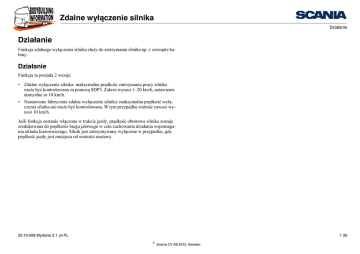 Zdalne wyłączenie silnika Działanie Działanie Funkcja zdalnego wyłączenia silnika służy do zatrzymania silnika np. z zewnątrz kabiny. Działanie Funkcja ta posiada 2 wersje: • Zdalne wyłączenie silnika: maksymalna prędkość zatrzymania pracy silnika może być kontrolowana za pomocą SDP3. Zakres wynosi 1–20 km/h, ustawienie domyślne to 10 km/h. • Nastawione fabrycznie zdalne wyłączenie silnika: maksymalna prędkość wyłączenia silnika nie może być kontrolowana. W tym przypadku wartość zawsze wynosi 10 km/h. Jeśli funkcja zostanie włączona w trakcie jazdy, prędkość obrotowa silnika zostaje zredukowana do prędkości biegu jałowego w celu zachowania działania wspomagania układu kierowniczego. Silnik jest zatrzymywany wyłącznie w przypadku, gdy prędkość jazdy jest mniejsza od wartości nastawy. 22:10-008 Wydanie 2.1 pl-PL 1 (8) © Scania CV AB 2015, Sweden Zdalne wyłączenie silnika Działanie Włączanie Podczas aktywacji należy spełnić poniższe warunki: • Przełącznik EXT jest aktywny (jeśli przełącznik EXT ustawiony jest na wartość „Jest”) Gdy warunek ten jest spełniony, funkcję można aktywować za pomocą BIC (konfiguracja interfejsu zabudowy) i zewnętrznej sieci CAN. Z lub bez przełącznika EXT (kontrola sekwencyjna) • Z przełącznikiem EXT: Aktywacja przełącznika EXT musi nastąpić po ustawieniu kluczyka zapłonu w położenie jazdy. Tylko wtedy wybrana funkcja może być aktywowana. • Bez przełącznika EXT: Funkcja może być aktywowana poprzez doprowadzenie sygnału do wybranego styku lub poprzez zewnętrzną sieć CAN. 22:10-008 Wydanie 2.1 pl-PL 2 (8) © Scania CV AB 2015, Sweden Zdalne wyłączenie silnika Warunki dla podwozia Warunki dla podwozia Data produkcji pojazdu Miejsce produkcji Södertälje Zwolle Angers São Bernardo do Campo Numer seryjny podwozia 2014-11-17 2105883 5371386 9192404 2015-02-02 3872427 - Przygotowanie fabryczne Opcja Funkcjonalność BCI W razie potrzeby Wiązka przewodów zabudowy z kabiny do ramy Wiązka przewodów zabudowy w ramie 22:10-008 Wydanie 2.1 pl-PL Alternatywa Jest Kod wersji 5837A 7+7+7-stykowa 2m 8m 12 m 2411F 3023A 3023D 3023C 3 (8) © Scania CV AB 2015, Sweden Zdalne wyłączenie silnika Warunki dla podwozia Parametry, które można zmieniać za pomocą SDP3 W przypadku braku dostępu do SDP3 należy skontaktować się z dealerem firmy Scania. Parametry są regulowane w funkcji oprogramowania SDP3. Parametr Limit prędkości jazdy dla zdalnego wyłączenia silnika Przełącznik EXTa Objaśnienie Jeśli prędkość jest niższa od wybranej prędkości, silnik zostanie wyłączony. Kontroluje, czy przełącznik EXT będzie aktywny, czy nie Możliwa wartość 1–20 km/h Fabryczna 10 km/h Grupa Zespół napędowy Brak 2 położenia Ze sprężyną Ze sprężyną Adaptacja zabudowy a. Ustawienie tego parametru ma wpływ na wszystkie funkcje zależne od przełącznika EXT. Dodatkowe informacje na temat parametrów podano w części pt. „Parametry regulowane”. 22:10-008 Wydanie 2.1 pl-PL 4 (8) © Scania CV AB 2015, Sweden Zdalne wyłączenie silnika Typ sygnału i aktywacja funkcji Typ sygnału i aktywacja funkcji Przykład aktywacji funkcji Typ włączenia BIC (Bodywork Interface Configuration) Ustawienie fabryczne zewnętrznej sieci CAN Zewnętrzna sieć CAN ustawiona w SDP3 Sposób włączenia Przez styk złącza C259 lub inny sygnał w BIC. BodyworkEngineRequest2. EngineShutdown BodyworkEngineRequest2. EmergencyEngineShutdown 22:10-008 Wydanie 2.1 pl-PL 5 (8) © Scania CV AB 2015, Sweden Zdalne wyłączenie silnika Typ sygnału i aktywacja funkcji Przykład podłączenia z wykorzystaniem BICT, podłączenia zasilania +24 V i podłączenia do masy +24 V 2 17 3 Poniższy opis przedstawia podłączenie wewnątrz kabiny. Informacje na temat podłączenia z wykorzystaniem przedłużającej wiązki przewodów w podwoziu zamieszczono w dokumencie pt. „Wiązka przewodów kabiny i ramy” (22:10-080). Wykonaj następujące czynności: 1 3 1. Podłącz przewód włączania do dowolnego styku wejściowego złącza C259. C259 2. Z wykorzystaniem BICT (narzędzie do konfiguracji interfejsu zabudowy) funk- cja jest przypisywana do wybranego styku. C259 344 947 1 - 10 Funkcja może być aktywowana. Aktywacja poprzez zasilanie +24 V Informacje dotyczące części oraz miejsc wykonywania połączeń 1 Na przykład włącznik Podłączony do dowolnego styku złącza C259 2 Bezpiecznik 5A Mont. przez producenta nadwozia Przekrój poprzeczny przewodu min. 0,75 mm² Mont. przez producenta nadwozia 3 Przewód elektryczny Części można zakupić u dealera firmy Scania. 1 2 3 C259 C259 344 948 1 - 10 Aktywacja przez połączenie do masy 22:10-008 Wydanie 2.1 pl-PL 6 (8) © Scania CV AB 2015, Sweden Zdalne wyłączenie silnika Typ sygnału i aktywacja funkcji Sposób włączenia Podłączenie zasilania +24 V do wybranego styku złącza C259 lub Połączenie do masy wybranego styku złącza C259 BCI master C-pin (1–10), High or low 1 2 Remote engine shutdown or BCI master C-pin (1–10), High or low 1 2 Activate emergency engine shutdown remotely 344 953 Typ sygnału Styk (BWE) W BICT 1. Styk wybrany do aktywacji funkcji 2. Działanie: Ustawienie fabryczne Włącz zdalne wyłączenie silnika lub Zdalne wy- łączenie silnika. 22:10-008 Wydanie 2.1 pl-PL 7 (8) © Scania CV AB 2015, Sweden Zdalne wyłączenie silnika Typ sygnału i aktywacja funkcji Podłączenie za pośrednictwem zewnętrznej sieci CAN Poniższy opis przedstawia podłączenie wewnątrz kabiny. Informacje na temat podłączenia z wykorzystaniem przedłużającej wiązki przewodów w podwoziu zamieszczono w dokumencie pt. „Wiązka przewodów kabiny i ramy” (22:10-080). Aby dokonać podłączenia przez zewnętrzną sieć CAN, należy spełnić następujące warunki: C493 • Pojazd musi być wyposażony w BCI, kod wersji 5837A • Parametr dla zewnętrznej sieci CAN jest aktywowany 3 C493 340 792 Podłączenie wykon