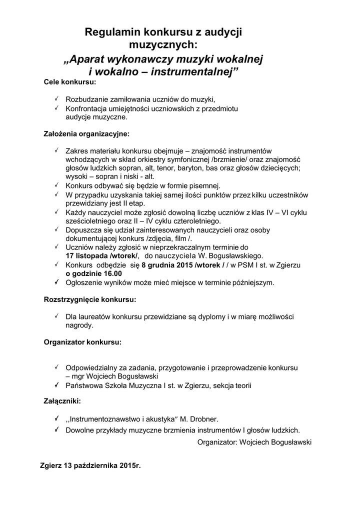 Regulamin konkursu z audycji muzycznych: „Aparat wykonawczy muzyki wokalnej i wokalno – instrumentalnej” Cele konkursu: Rozbudzanie zamiłowania uczniów do muzyki, Konfrontacja umiejętności uczniowskich z przedmiotu audycje muzyczne. Założenia organizacyjne: Zakres materiału konkursu obejmuje – znajomość instrumentów wchodzących w skład orkiestry symfonicznej /brzmienie/ oraz znajomość głosów ludzkich sopran, alt, tenor, baryton, bas oraz głosów dziecięcych; wysoki – sopran i niski - alt. Konkurs odbywać się będzie w formie pisemnej. W przypadku uzyskania takiej samej ilości punktów przez kilku uczestników przewidziany jest II etap. Każdy nauczyciel może zgłosić dowolną liczbę uczniów z klas IV – VI cyklu sześcioletniego oraz II – IV cyklu czteroletniego. Dopuszcza się udział zainteresowanych nauczycieli oraz osoby dokumentującej konkurs /zdjęcia, film /. Uczniów należy zgłosić w nieprzekraczalnym terminie do 17 listopada /wtorek/, do nauczyciela W. Bogusławskiego. Konkurs odbędzie się 8 grudnia 2015 /wtorek / / w PSM I st. w Zgierzu o godzinie 16.00 Ogłoszenie wyników może mieć miejsce w terminie późniejszym. Rozstrzygnięcie konkursu: Dla laureatów konkursu przewidziane są dyplomy i w miarę możliwości nagrody. Organizator konkursu: Odpowiedzialny za zadania, przygotowanie i przeprowadzenie konkursu – mgr Wojciech Bogusławski Państwowa Szkoła Muzyczna I st. w Zgierzu, sekcja teorii Załączniki: ,,Instrumentoznawstwo i akustyka” M. Drobner. Dowolne przykłady muzyczne brzmienia instrumentów I głosów ludzkich. Organizator: Wojciech Bogusławski Zgierz 13 października 2015r.