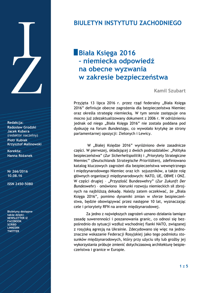 BIULETYN INSTYTUTU ZACHODNIEGO Biała Księga 2016 – niemiecka odpowiedź na obecne wyzwania w zakresie bezpieczeństwa Kamil Szubart Redakcja: Radosław Grodzki Jacek Kubera (redaktor naczelny) Piotr Kubiak Krzysztof Malinowski Korekta: Hanna Różanek Nr 266/2016 10.08.16 ISSN 2450-5080 Biuletyny dostępne także dzięki: NEWSLETTER IZ FACEBOOK SCRIBD LINKEDIN TWITTER Przyjęta 13 lipca 2016 r. przez rząd federalny „Biała Księga 2016” definiuje obecne zagrożenia dla bezpieczeństwa Niemiec oraz określa strategię niemiecką. W tym sensie zastępuje ona mocno już zdezaktualizowany dokument z 2006 r. W odróżnieniu jednak od niego „Biała Księga 2016” nie została poddana pod dyskusję na forum Bundestagu, co wywołało krytykę ze strony parlamentarnej opozycji: Zielonych i Lewicy. W „Białej Księdze 2016” wyróżniono dwie zasadnicze części. W pierwszej, składającej z dwóch podrozdziałów: „Polityka bezpieczeństwa” (Zur Sicherheitspolitik) i „Priorytety Strategiczne Niemiec” (Deutschlands Strategische Prioritäten), zdefiniowano katalog kluczowych zagrożeń dla bezpieczeństwa wewnętrznego i międzynarodowego Niemiec oraz ich sojuszników, a także rolę głównych organizacji międzynarodowych: NATO, UE, OBWE i ONZ. W części drugiej – „Przyszłość Bundeswehry” (Zur Zukunft Der Bundeswehr) – omówiono kierunki rozwoju niemieckich sił zbrojnych na najbliższą dekadę. Należy zatem oczekiwać, że „Biała Księga 2016”, pomimo dynamiki zmian w sferze bezpieczeństwa, będzie obowiązywać przez następne 10 lat, wyznaczając cele i priorytety RFN na arenie międzynarodowej. Za jedno z największych zagrożeń uznano działania łamiące zasadę suwerenności i poszanowania granic, co odnosi się bezpośrednio do sytuacji wzdłuż wschodniej flanki NATO, związanej z rosyjską agresją na Ukrainie. Zdecydowano się więc na jednoznaczne wskazanie Federacji Rosyjskiej jako tego podmiotu stosunków międzynarodowych, który przy użyciu siły lub groźby jej wykorzystania próbuje zmienić dotychczasową architekturę bezpieczeństwa i granice w Europie. 1z5 W związku z tym podkreślono trwałość wspólnoty euroatlantyckiej oraz zobowiązań sojuszniczych w ramach art. 4 i art. 5 Traktatu waszyngtońskiego, co jest zgodne z niemiecką polityką bezpieczeństwa i co zostało zaprezentowane na szczycie NATO w Warszawie. Szczególną uwagę – obok zobowiązań sojuszniczych – poświęcono konfliktowi hybrydowemu. Uznano, że zobowiązania sojusznicze Berlina muszą opierać się również na trzecim – po odstraszaniu konwencjonalnym i zwiększeniu zdolności reagowania na konflikt hybrydowy – filarze, a więc odstraszaniu nuklearnym. Wyraźnie zadeklarowano, że choć RFN popiera działania na rzecz rozbrojenia nuklearnego, to broń nuklearna pozostanie jednym z najważniejszych elementów doktryny militarnej mocarstw nuklearnych. Sojusz Atlantycki, w tym Niemcy muszą być zdolne do jej wykorzystania w ramach szerokiego wachlarza środków odstraszania przeciwko potencjalnemu agresorowi. Zdecydowano się zatem odwołać do polityki nuklearnej NATO (NATO Nuclear Sharing), zakładającej udostępnianie przez USA taktycznych ładunków jądrowych niektórym państwom członkowskim. Kończy to de facto dyskusję polityczną, zainicjowaną umową koalicyjną pomiędzy CDU/CSU a FDP z 2009 r., na temat wycofania z terytorium Niemiec amerykańskich taktycznych bomb jądrowych B61, składowanych w bazie sił powietrznych w Büchel. W dokumencie wiele miejsca poświęcono cyberbezpieczeństwu. Jest to efekt rosnącego znaczenia nowych technologii, wykorzystywanych także przez organizacje terrorystyczne i międzynarodowe grupy hakerskie. Ataki w cyberprzestrzeni mogą być wymierzone w infrastrukturę polityczno-wojskową oraz w „cele miękkie”, a więc elementy infrastruktury krytycznej. „Sieć” jest też wykorzystywana przez organizacje terrorystyczne do kolportowania materiałów propagandowych. Dzięki temu można dotrzeć do nieograniczonej liczby odbiorców bez podejmowania ryzyka dekonspiracji. Do największych zagrożeń, ujętych w „Białej Księdze 2016”, należy terroryzm organizacji islamskich, przede wszystkim Al-Kaidy i tzw. Państwa Islamskiego (PI). Aktywność PI to z jednej strony wzrost zagrożenia terrorystycznego na terytorium Niemiec, a z drugiej – konieczność włączenia się Niemiec do międzynarodowej koalicji antyterrorystycznej. Zagrożenie ze strony komórek islamistycznych działających na terytorium RFN przekłada się też na wzrost atrakcyjności populistycznych ruchów społecznych (PEGIDA i HoGeSa) i skrajnych partii politycznych (AfD), co zaostrza w Niemczech dyskurs polityczny. Niepokojące są również informacje Federalnego Urzędu Ochrony Konstytucji i Federalnego Urzędu Kryminalnego, że około 800 niemieckich obywateli i stałych rezydentów wyjechało na Bliski Wschód i do Afryki Północnej w określonym celu – aby dołączyć do PI lub Al-Kaidy. Biorąc pod uwagę atrakcyjność ideologii dżihadu, trend ten w najbliższych latach będzie się nasilał i dlatego należy uznać to zjawisko za jedno z największych zagrożeń dla bezpieczeństwa wewnętrznego RFN. Wymaga to podjęcia przez niemieckie władze szeroko zakrojonych działań, w tym profilaktycznych, obejmujących także ludność napływową (uchodźców). Mimo implementacji przez rząd niemiecki Willkommenskultur, w „Białej Księdze 2016” podkreślono, że niekontrolowane migracje mogą wpłynąć na bezpieczeństwo RFN i jej sojuszników, zwłaszcza dysponujących mniejszymi zasobami finansowymi, materialnymi i ludzkimi. W dokumencie stwierdzono, że frustracja społeczna wynikająca z braku życiowych perspektyw, utrudnionego dostępu do edukacji i rynku pracy może prowadzić do radykalizacji nastrojów wśród młodych ludzi, co sprzyjać będzie 2z5 planom lokalnych komórek terrorystycznych doty