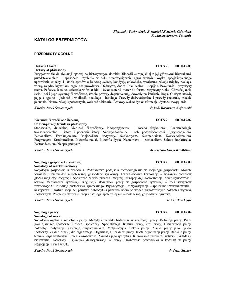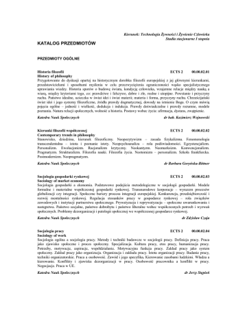 Kierunek: Technologia śywności i śywienie Człowieka Studia stacjonarne I stopnia KATALOG PRZEDMIOTÓW PRZEDMIOTY OGÓLNE 00.00.02.01 Historia filozofii ECTS 2 History of philosophy Przygotowanie do dyskusji opartej na historycznym dorobku filozofii europejskiej z jej głównymi kierunkami, przedstawicielami i sposobami myślenia w celu przezwycięŜenia ograniczoności wąsko specjalistycznego uprawiania wiedzy. Historia sporów o budowę świata, kondycję człowieka, wzajemne relacje między nauką a wiarą, między kryteriami tego, co: prawdziwe i fałszywe, dobre i złe, realne i utopijne. Powstanie i przyczyny ruchu. Państwo idealne, ucieczka w świat idei i świat materii; materia i forma, przyczyny ruchu. Chrześcijański świat idei i jego systemy filozoficzne, źródła prawdy dogmatycznej, dowody na istnienie Boga. O czym mówią pojęcia ogólne – jedność i wielkość, dedukcja i indukcja. Prawdy doświadczalne i prawdy rozumne, modele poznania. Natura relacji społecznych, wolność a historia. Postawy wobec Ŝycia: afirmacja, dystans, zwątpienie. Katedra Nauk Społecznych dr hab. Kazimierz Wojnowski 00.00.02.02 Kierunki filozofii współczesnej ECTS 2 Contemporary trends in philosophy Stanowisko, dziedzina, kierunek filozoficzny. Neopozytywizm – zasada fizykalizmu. Fenomenologia transcendentalna – istota i poznanie istoty. Neopsychoanaliza – rola podświadomości. Egzystencjalizm. Personalizm. Ewolucjonizm. Racjonalizm krytyczny. Neokantyzm. Neomarksizm. Konwencjonalizm. Pragmatyzm. Strukturalizm. Filozofia nauki. Filozofia Ŝycia. Neotomizm – personalizm. Szkoła frankfurcka. Postmodernizm. Neopragmatyzm. Katedra Nauk Społecznych dr Barbara Goryńska-Bittner 00.00.02.03 Socjologia gospodarki rynkowej ECTS 2 Sociology of market economy Socjologia gospodarki a ekonomia. Podstawowe podejścia metodologiczne w socjologii gospodarki. Modele formalne i materialne współczesnej gospodarki rynkowej. Transnarodowe korporacje – wyrazem procesów globalizacji czy integracji. Społeczne bariery procesu integracji europejskiej. Konkurencja, przedsiębiorczość i rozwój mentalności rynkowej. Regulacja stosunków pracy w gospodarce rynkowej – rola związków zawodowych i instytucji partnerstwa społecznego. Prywatyzacja i reprywatyzacja – społeczne uwarunkowania i następstwa. Państwo socjalne, państwo dobrobytu i państwo liberalne wobec współczesnych potrzeb i wyzwań społecznych. Problemy dezorganizacji i patologii społecznej we współczesnej gospodarce rynkowej. Katedra Nauk Społecznych dr Zdzisław Czaja 00.00.02.04 Socjologia pracy ECTS 2 Sociology of work Socjologia ogólna a socjologia pracy. Metody i techniki badawcze w socjologii pracy. Definicja pracy. Praca jako zjawisko społeczne i proces społeczny. Specjalizacja. Kultura pracy, etos pracy, humanizacja pracy. Potrzeby, motywacje, aspiracje, współdziałanie. Motywacyjna funkcja pracy. Zakład pracy jako system społeczny. Zakład pracy jako organizacja. Organizacja i zakładu pracy. Istota organizacji pracy. Badanie pracy, techniki organizatorskie. Praca a osobowość. Zawód i jego specyfika. Kierowanie zasobami ludzkimi. Władza a kierowanie. Konflikty i zjawiska dezorganizacji w pracy. Osobowość pracownika a konflikt w pracy. Negocjacje. Praca w UE. Katedra Nauk Społecznych dr Jerzy Stępień PRZEDMIOTY PODSTAWOWE 06.10.00 Chemia ogólna ECTS 8 General chemistry Budowa atomu – jądro, struktura elektronowa, liczby kwantowe, orbitale atomowe. Właściwości pierwiastków a połoŜenie w układzie okresowym. Wiązanie chemiczne – hybrydyzacja orbitali atomowych, orbitale molekularne. Elektrolity, stan równowagi, dysocjacja elektrolityczna. Iloczyn jonowy wody, skala pH. Teorie kwasów i zasad. Typy reakcji chemicznych. Równowagi jonowe i równowagi kwasowo-zasadowe. Mieszaniny buforowe. Procesy utleniania i redukcji. Klasyfikacja i ogólna charakterystyka związków nieorganicznych. Reaktywność związków a ich budowa chemiczna. Związki kompleksowe. Pierwiastki biologicznie czynne. Stany skupienia materii. Właściwości fazy gazowej, ciekłej i stałej, równowagi fazowe. Woda – struktura i właściwości fizykochemiczne. Woda w przyrodzie. Roztwory, mieszaniny, układy koloidalne, stęŜenia. Dyfuzja, osmoza, sorpcja. Kinetyka chemiczna. Zmiany wielkości fizykochemicznych w czasie. Kataliza. Elementy termodynamiki. Wykorzystanie absorpcji promieniowania elektromagnetycznego w spektroskopii. Analiza jakościowa i ilościowa. Techniki analityczne – miareczkowe, spektrofotometryczne, elektrochemiczne, chromatograficzne. Katedra Chemii dr Jadwiga Grabarkiewicz-Szczęsna 06.10.01 ECTS 2 Ekonomia Economy Prawa i myślenie ekonomiczne. Problem rzadkości dóbr. Rynek, podstawowe kategorie rynkowe. Przedsiębiorstwo, konsument. Koszty i dochody. Funkcje mechanizmu rynkowego. Podstawowe problemy makroekonomiczne: inflacja, bezrobocie, wzrost gospodarczy. Mierniki oceny działalności gospodarczej: produkt narodowy, produkt krajowy, dochód narodowy. Determinanty dochodu narodowego. Równowaga gospodarcza. Procesy dostosowawcze prowadzące do osiągnięcia równowagi. Globalny popyt i podaŜ. Polityka fiskalna. BudŜet państwa. Pieniądz i polityka monetarna. Rola banku centralnego w gospodarce. Makroekonomia polityki otwartej. Cykliczny rozwój gospodarki. Rola państwa w gospodarce. Systemy mieszane. Gospodarka światowa. Finanse międzynarodowe. Integracja gospodarcza. Makroekonomiczne problemy rozwoju rolnictwa. Katedra Ekonomii dr Michał Trzęsowski 06.10.02 Matematyka ECTS 10 Mathematics Liczby zespolone. Wektory, macierze i wyznaczniki. Macierz odwrotna. Rozwiązywanie układów równań. Granica i ciągłość funkcji, asymptoty. Pochodna funkcji i jej zastosowania. Całka nieoznaczona, całkowanie przez podstawienie i przez części. Całkowanie funkcji wymiernych, niewymiernych i trygonometrycznych. Całka oznaczona i jej zastosowania. Całki niewłaściwe. Funkcj