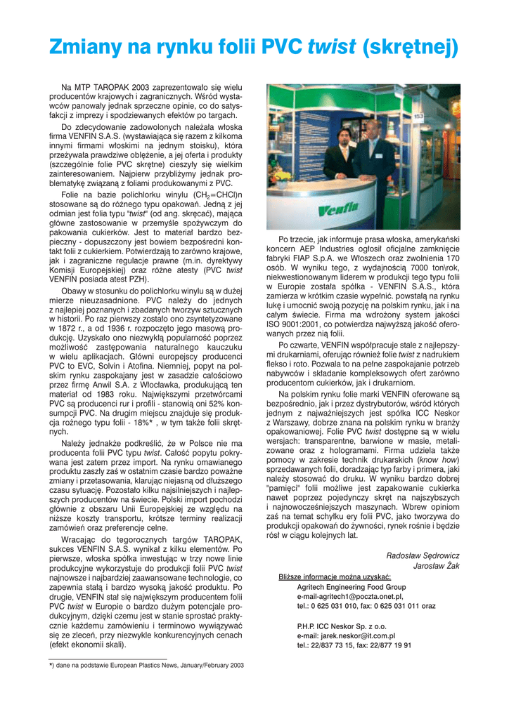 Zmiany na rynku folii PVC twist (skrętnej) Na MTP TAROPAK 2003 zaprezentowało się wielu producentów krajowych i zagranicznych. Wśród wystawców panowały jednak sprzeczne opinie, co do satysfakcji z imprezy i spodziewanych efektów po targach. Do zdecydowanie zadowolonych należała włoska firma VENFIN S.A.S. (wystawiająca się razem z kilkoma innymi firmami włoskimi na jednym stoisku), która przeżywała prawdziwe oblężenie, a jej oferta i produkty (szczególnie folie PVC skrętne) cieszyły się wielkim zainteresowaniem. Najpierw przybliżymy jednak problematykę związaną z foliami produkowanymi z PVC. Folie na bazie polichlorku winylu (CH2=CHCl)n stosowane są do różnego typu opakowań. Jedną z jej odmian jest folia typu "twist" (od ang. skręcać), mająca główne zastosowanie w przemyśle spożywczym do pakowania cukierków. Jest to materiał bardzo bezpieczny - dopuszczony jest bowiem bezpośredni kontakt folii z cukierkiem. Potwierdzają to zarówno krajowe, jak i zagraniczne regulacje prawne (m.in. dyrektywy Komisji Europejskiej) oraz różne atesty (PVC twist VENFIN posiada atest PZH). Obawy w stosunku do polichlorku winylu są w dużej mierze nieuzasadnione. PVC należy do jednych z najlepiej poznanych i zbadanych tworzyw sztucznych w historii. Po raz pierwszy zostało ono zsyntetyzowane w 1872 r., a od 1936 r. rozpoczęto jego masową produkcję. Uzyskało ono niezwykłą popularność poprzez możliwość zastępowania naturalnego kauczuku w wielu aplikacjach. Główni europejscy producenci PVC to EVC, Solvin i Atofina. Niemniej, popyt na polskim rynku zaspokajany jest w zasadzie całościowo przez firmę Anwil S.A. z Włocławka, produkującą ten materiał od 1983 roku. Największymi przetwórcami PVC są producenci rur i profili - stanowią oni 52% konsumpcji PVC. Na drugim miejscu znajduje się produkcja rożnego typu folii - 18%* , w tym także folii skrętnych. Należy jednakże podkreślić, że w Polsce nie ma producenta folii PVC typu twist. Całość popytu pokrywana jest zatem przez import. Na rynku omawianego produktu zaszły zaś w ostatnim czasie bardzo poważne zmiany i przetasowania, klarując niejasną od dłuższego czasu sytuację. Pozostało kilku najsilniejszych i najlepszych producentów na świecie. Polski import pochodzi głównie z obszaru Unii Europejskiej ze względu na niższe koszty transportu, krótsze terminy realizacji zamówień oraz preferencje celne. Wracając do tegorocznych targów TAROPAK, sukces VENFIN S.A.S. wynikał z kilku elementów. Po pierwsze, włoska spółka inwestując w trzy nowe linie produkcyjne wykorzystuje do produkcji folii PVC twist najnowsze i najbardziej zaawansowane technologie, co zapewnia stałą i bardzo wysoką jakość produktu. Po drugie, VENFIN stał się największym producentem folii PVC twist w Europie o bardzo dużym potencjale produkcyjnym, dzięki czemu jest w stanie sprostać praktycznie każdemu zamówieniu i terminowo wywiązywać się ze zleceń, przy niezwykle konkurencyjnych cenach (efekt ekonomii skali). *) dane na podstawie European Plastics News, January/February 2003 Po trzecie, jak informuje prasa włoska, amerykański koncern AEP Industries ogłosił oficjalne zamknięcie fabryki FIAP S.p.A. we Włoszech oraz zwolnienia 170 osób. W wyniku tego, z wydajnością 7000 ton\rok, niekwestionowanym liderem w produkcji tego typu folii w Europie została spółka - VENFIN S.A.S., która zamierza w krótkim czasie wypełnić. powstałą na rynku lukę i umocnić swoją pozycję na polskim rynku, jak i na całym świecie. Firma ma wdrożony system jakości ISO 9001:2001, co potwierdza najwyższą jakość oferowanych przez nią folii. Po czwarte, VENFIN współpracuje stale z najlepszymi drukarniami, oferując również folie twist z nadrukiem flekso i roto. Pozwala to na pełne zaspokajanie potrzeb nabywców i składanie kompleksowych ofert zarówno producentom cukierków, jak i drukarniom. Na polskim rynku folie marki VENFIN oferowane są bezpośrednio, jak i przez dystrybutorów, wśród których jednym z najważniejszych jest spółka ICC Neskor z Warszawy, dobrze znana na polskim rynku w branży opakowaniowej. Folie PVC twist dostępne są w wielu wersjach: transparentne, barwione w masie, metalizowane oraz z hologramami. Firma udziela także pomocy w zakresie technik drukarskich (know how) sprzedawanych folii, doradzając typ farby i primera, jaki należy stosować do druku. W wyniku bardzo dobrej "pamięci" folii możliwe jest zapakowanie cukierka nawet poprzez pojedynczy skręt na najszybszych i najnowocześniejszych maszynach. Wbrew opiniom zaś na temat schyłku ery folii PVC, jako tworzywa do produkcji opakowań do żywności, rynek rośnie i będzie rósł w ciągu kolejnych lat. Radosław Sędrowicz Jarosław Żak Bliższe informacje można uzyskać: Agritech Engineering Food Group [email protected], tel.: 0 625 031 010, fax: 0 625 031 011 oraz P.H.P. ICC Neskor Sp. z o.o. e-mail: [email protected] tel.: 22/837 73 15, fax: 22/877 19 91