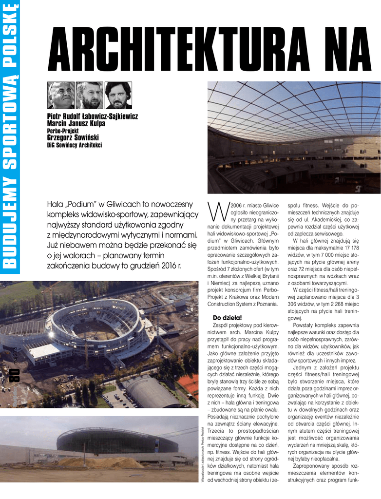 BUDUJEMY SPORTOWĄ POLSKĘ Architektura na Piotr Rudolf Łabowicz-Sajkiewicz Marcin Janusz Kulpa Perbo-Projekt Grzegorz Sowiński DiG Sowińscy Architekci W Hala „Podium” w Gliwicach to nowoczesny kompleks widowisko-sportowy, zapewniający najwyższy standard użytkowania zgodny z międzynarodowymi wytycznymi i normami. Już niebawem można będzie przekonać się o jej walorach – planowany termin zakończenia budowy to grudzień 2016 r. 2006 r. miasto Gliwice ogłosiło nieograniczony przetarg na wykonanie dokumentacji projektowej hali widowiskowo-sportowej „Podium” w Gliwicach. Głównym przedmiotem zamówienia było opracowanie szczegółowych założeń funkcjonalno-użytkowych. Spośród 7 złożonych ofert (w tym m.in. oferentów z Wielkiej Brytanii i Niemiec) za najlepszą uznano projekt konsorcjum firm PerboProjekt z Krakowa oraz Modern Construction System z Poznania. Wizualizacje i zdjęcia arch. Perbo-Projekt Builder 80 maj 2016 Do dzieła! Zespół projektowy pod kierownictwem arch. Marcina Kulpy przystąpił do pracy nad programem funkcjonalno-użytkowym. Jako główne założenie przyjęto zaprojektowanie obiektu składającego się z trzech części mogących działać niezależnie, którego bryłę stanowią trzy ściśle ze sobą powiązane formy. Każda z nich reprezentuje inną funkcję. Dwie z nich – hala główna i treningowa – zbudowane są na planie owalu. Posiadają nieznacznie pochylone na zewnątrz ściany elewacyjne. Trzecia to prostopadłościan mieszczący głównie funkcje komercyjne dostępne na co dzień, np. fitness. Wejście do hali głównej znajduje się od strony ogródków działkowych, natomiast hala treningowa ma osobne wejście od wschodniej strony obiektu i ze- społu fitness. Wejście do pomieszczeń technicznych znajduje się od ul. Akademickiej, co zapewnia rozdział części użytkowej od zaplecza serwisowego. W hali głównej znajdują się miejsca dla maksymalnie 17 178 widzów, w tym 7 000 miejsc stojących na płycie głównej areny oraz 72 miejsca dla osób niepełnosprawnych na wózkach wraz z osobami towarzyszącymi. W części fitness/hali treningowej zaplanowano miejsca dla 3 306 widzów, w tym 2 268 miejsc stojących na płycie hali treningowej. Powstały kompleks zapewnia najlepsze warunki oraz dostęp dla osób niepełnosprawnych, zarówno dla widzów, użytkowników, jak również dla uczestników zawodów sportowych i innych imprez. Jednym z założeń projektu części fitness/hali treningowej było stworzenie miejsca, które działa poza godzinami imprez organizowanych w hali głównej, pozwalając na korzystanie z obiektu w dowolnych godzinach oraz organizację eventów niezależnie od otwarcia części głównej. Innym atutem części treningowej jest możliwość organizowania wydarzeń na mniejszą skalę, których organizacja na płycie głównej byłaby nieopłacalna. Zaproponowany sposób rozmieszczenia elementów konstrukcyjnych oraz program funk- podium Znamiennym kształtem charakteryzuje się dach o rozpiętości 123,30 m, o układzie linowym, tzw. paraboloidzie hiperbolicznej. Hala Podium zlokalizowana jest na terenach sportowych Politechniki Śląskiej, co tworzy świetne zaplecze dla tego typu inwestycji. Bezpośrednie sąsiedztwo stanowią park i tereny ogródków działkowych. Obiekt zlokalizowany jest na skarpie dawnego stadionu lekkoatletycznego. Zaprojektowano go na osi podłużnej, obróconej o kąt 70° na zachód od kierunku północy. Teren ten jest położony w niewielkiej odległości od centrum miasta – 1,6 km od rynku na gliwickiej starówce. Realizowana inwestycja umożliwia szybkie i dogodne połączenia z większością dużych miast regionu: Zabrzem, Katowicami, Rudą Śląską czy Sosnowcem. Głównym założeniem architektonicznym był układ widowni w postaci Od hokeja po widowisko Przyjęte rozwiązania umożliwiają przeprowadzenie imprez sportowych, w tym zawodów hokejowych, lekkoatletycznych oraz dyscyplin halowych, jak tenis, siatkówka, koszykówka, boks i inne. Obiekt jest w pełni dostosowany do organizacji imprez masowych, koncertów, kongresów i konwencji oraz wszelkich wydarzeń o charakterze wystawienniczo-targowym. Możliwości wykorzystania areny głównej oraz hali treningowej są bardzo różnorodne – to m.in. hokej na lodzie, łyżwiarstwo, lekkoatletyka, koszykówka, siatkówka, piłka ręczna, halowa piłka nożna, tenis, badminton, zapasy, boks, sztuki walki, koncerty, przedstawienia i imprezy targowe. Kompleks zapewnia warunki do zastosowania niezbędnych urządzeń sportowych i przeprowadzenia maj 2016 Owal wpisany w koło owalu wpisanego w koło, który implikuje najlepszy kształt widowni, wpływający na odbiór wizualny, a tym samym zapewnia wszelkie niezbędne wymagania bezpieczeństwa, przede wszystkim uzyskanie najkrótszego czasu ewakuacji widzów z widowni i budynku. Znamiennym kształtem charakteryzuje się dach o rozpiętości 123,30 m, o układzie linowym, tzw. paraboloidzie hiperbolicznej (krzywej siodłowej), która jest paralelą układu zastosowanego w Paraboleum Macieja Nowickiego i Williama Deitricka w Raleigh. Owalne kształty budynku wkomponowano w ortogonalny układ ścian – dominant przestrzennych, placów, schodów, murków oporowych i elementów małej architektury, będących również architekturą. Od strony ul. Akademickiej zaprojektowano skarpę – zieleniec ozdobiony ścieżkami i schodami prowadzącymi na koronę placu. 81 Tomasza Barbackiego, który obecnie kieruje nadzorem autorskim. Builder cjonalny, zostały przyjęte z myślą o zapewnieniu jak największej elastyczności kompleksu. Za główne determinanty projektowe uznaliśmy szeroko rozumiane problemy bezpieczeństwa budynku i widzów, a także warunki organizacji i obserwacji wydarzeń, które wpływają na układ funkcjonalny obiektu. Nie mniej istotne były aktualne wymogi federacji sportowych, które zadecydowały o rozmiarach areny sportowej, sposobie orga