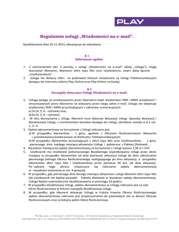 Regulamin usługi „Wiadomości na e-mail”. Opublikowany dnia 25.11.2013, obowiązuje do odwołania. §1 Informacje ogólne. 1. Z zastrzeżeniem pkt. 2 poniżej, z usługi „Wiadomości na e-mail” (dalej „Usługa"), mogą skorzystać Abonenci, Abonenci ofert typu Mix oraz Użytkownicy, zwani dalej łącznie „Użytkownikami”. 2. Usługa nie dotyczy ofert na podstawie których świadczone są Usługi Telekomunikacyjne dostępu do Internetu (oferty Play Online oraz Play Online na Kartę). §2 Szczegóły dotyczące Usługi Wiadomości na e-mail. 1. Usługa polega na przekazywaniu przez Operatora kopii wiadomości SMS i MMS wysyłanych i otrzymywanych przez Abonenta na wskazany przez niego adres e-mail. Usługa nie obejmuje wiadomości SMS i MMS przychodzących z zakresów numeracyjnych: a) 5x (4, 5, 6 - cyfrowe) oraz, b) 6x (4, 5, 6 - cyfrowe). 2. W celu skorzystania z Usługi, Abonent musi dokonać aktywacji Usługi. Sposoby aktywacji i dezaktywacji Usługi, z rozróżnieniem kanałów dostępu do Usługi, określone zostały w § 3 ust. 1, 2 i 4. 3. Opłata abonamentowa za korzystanie z Usługi naliczana jest: a) W przypadku Abonentów - z góry, zgodnie z Okresem Rozliczeniowym Abonenta i przedstawiana każdorazowo na Rachunku Telekomunikacyjnym. b) W przypadku Abonentów korzystających z ofert typu Mix oraz Użytkowników - z góry, pierwszego dnia każdego miesiąca aktywności Usługi i pobierana z Pakietu Złotówek. 4. Wysokość miesięcznej opłaty abonamentowej za korzystanie z Usługi wynosi 1,99 zł z VAT. 5. Użytkownik ma możliwość jednorazowego Bezpłatnego wypróbowania Usługi przez okres trwający w przypadku Abonentów od dnia pierwszej aktywacji Usługi do dnia zakończenia pierwszego pełnego Okresu Rozliczeniowego następującego po dniu aktywacji, a przypadku Abonentów ofert typu Mix i Użytkowników przez pierwsze 30 dni, od dnia aktywacji. Po upływie tego okresu rozpoczyna się naliczanie opłaty abonamentowej w wysokości wskazanej w ust. 4 powyżej. 6. W przypadku, gdy pierwszego dnia danego miesiąca aktywności usługi Abonent ofert typu Mix lub Użytkownik nie będzie posiadał Pakietu Złotówek w wysokości opłaty abonamentowej, Usługa będzie automatycznie dezaktywowana w przeciągu 24 godzin. 7. W przypadku dezaktywacji Usługi, opłata abonamentowa za Usługę naliczana jest za cały Okres Rozliczeniowy w którym nastąpiła dezaktywacja Usługi. 8. W przypadku, gdy Abonent aktywuje Usługę w trakcie trwania Okresu Rozliczeniowego opłata abonamentowa naliczana jest proporcjonalnie do pozostałych dni w danym Okresie Rozliczeniowym oraz za kolejny pełen Okres Rozliczeniowy. P4 Sp. z o.o. ul. Taśmowa 7, 02-677 Warszawa, XIII Wydział Gospodarczy Krajowego Rejestru Sądowego Sąd Rejonowy dla m. st. Warszawy KRS 0000217207 REGON 015808609 NIP 951-21-20-077 Kapitał zakładowy 48 456 500,00 PLN §3 Aktywacja i dezaktywacja Usługi Wiadomości na e-mail. 1. Aby skorzystać z Usługi, należy ją aktywować poprzez: 2. 3. 4. 5. 6. a) Wysłanie z Numeru MSISDN, który ma być objęty Usługą, bezpłatnej wiadomości b) SMS na numer 8010 o treści: START, c) za pośrednictwem strony http://www.24.play.pl po zalogowaniu się na konto danego d) Numeru MSISDN i przejściu do zakładki Usługi Dodatkowe, c. kontakt telefoniczny z Obsługą Klienta, e) wybranie i zatwierdzenie na klawiaturze telefonu kodu: i. *111*484*1# dla Abonentów usługi „Wiadomości na email” ii.*111*504*1# dla Abonentów oferty Mix i Użytkowników usługi „Wiadomości na email” Po dokonaniu jednej z czynności opisanych w ust. 1 powyżej na Numer MSISDN, którego dotyczyła aktywacja Usługi, Operator przesyła zwrotną wiadomość SMS potwierdzającą aktywację Usługi wraz z prośbą o zdefiniowanie adresu e-mail, na który mają być przekazywane kopie przychodzących oraz wychodzących wiadomości SMS i MMS. Użytkownik musi odesłać Bezpłatną wiadomość SMS na numer 8010 z podanym adresem email. Po zdefiniowaniu adresu e-mail, na który mają być przekazywane kopie przychodzących oraz wychodzących wiadomości SMS i MMS, użytkownik otrzyma na Numer MSISDN, którego dotyczyła aktywacja Usługi, zwrotną wiadomość SMS z zapytaniem czy na podanym adresie e-mail użytkownik chce skonfigurować Usługę. Użytkownik musi odesłać Bezpłatną wiadomość SMS na numer 8010 o treści TAK, nie później niż w ciągu 12-tu godzin od otrzymania wiadomości SMS, o której mowa w zdaniu poprzedzającym. W przypadku braku zdefiniowania adresu e-mail przez użytkownika Usługa jest aktywna do momentu dezaktywacji Usługi, a adres e-mail użytkownik może zmienić zgodnie z ust. 4 poniżej. Usługa może być aktywna wyłącznie na jednym adresie e-mail dla danego Numeru MSISDN. Aby w trakcie aktywności Usługi dokonać zmiany adresu e-mail , na który mają być przekazywane kopie wiadomości SMS i MMS należy z Numeru MSISDN objętego Usługą wysłać Bezpłatną wiadomość SMS na numer 8010 o treści: „NOWY” i podać nowy adres email na którym ma działać usługa (np. NOWY [email protected]). Po wykonaniu tej czynności użytkownik otrzyma na Numer MSISDN, zwrotną wiadomość SMS z zapytaniem czy na nowo podany adres e-mail użytkownik chce skonfigurować Usługę. Użytkownik musi odesłać Bezpłatną wiadomość SMS na numer 8010 o treści TAK, nie później niż w ciągu 12-tu godzin od otrzymania wiadomości SMS, o której mowa w zdaniu poprzedzającym. Aby wszystkie wiadomości SMS wysyłane na adres e-mail, były przekazywane w jednym wspólnym mailu raz w tygodniu, należy wysyłać z Numeru MSISDN objętego Usługą Bezpłatną wiadomość SMS na numer 8010 o treści: TYDZIEN. Po wykonaniu tej czynności, użytkownik na Numer MSISDN otrzyma wiadomość SMS z potwierdzeniem uruchomienia tej funkcjonalności. Od tego momentu wszystkie otrzymane i wysyłane SMSy użytkownik otrzyma zbiorczo w każdy poniedziałek danego Okresu Rozliczeniow