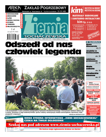 WSZYSTKO NA REMONT WSZYSTKO NA BUDOWĘ SOCHACZEW BROCHÓW IŁÓW NOWA SUCHA RYBNO TERESIN MŁODZIESZYN 2 zł (w tym 5% VAT) Nr 20 (1133) 21.05.2013 r. ISSN 1231-7179 Numer indeksu 328 006 Odszedł od nas człowiek legenda W NUMERZE Nowa Mleczarnia str. 5 Jacyków w Sochaczewie str. 10 Jubileusz proboszcza str. 11 Biała sobota str. 16 Strażackie awanse str. 17 P.H.U Czesław Tarczyk Sochaczew, ul. Trojanowska 58 tel. 46 862-88-32 , tel./fax 46 862-19-61 tel. 501 236 928, [email protected] STROPY TERIWA Gazobeton 24x24x59 - 6.95 zł 6.70 zł ■■W poniedziałek w samo południe pożegnaliśmy Sylwestra Rozdżestwieńskiego. Uroczystości żałobne odbyły się w Iłowie. Zmarłemu w jego ostatniej drodze, oprócz rodziny, towarzyszyły władze samorządowe, sportowcy, setki przyjaciół i znajomych więcej na stronach 2,3,4 FOT. TOMASZ ERTMAN Bloczki bet. - 2.95 zł Płyta gips - 16 zł Kostka bet. granitowa duży wybór dobra cena Zestawy kominowe (kamionka) Duży wybór cegieł klinkierowych Ogrodzenia panelowe NOWA STRONA INTERNETOWA „ZIEMI SOCHACZEWSKIEJ” CZEKA NA TWOJE OGŁOSZENIE Szukaj nas pod adresem www.ziemia-sochaczewska.pl Do końca maja ogłoszenia drobne za darmo 2 POŻEGNANIE 21 maja 2013 nr 20 (1133) [email protected] ZIEMIA SOCHACZEWSKA Niebo zapłakało Sylwester Rozdżestwieński (17.05.1941-15.05.2013) Nauczyciel, wychowawca, trener, sportowiec, spiker, komentator i dziennikarz sportowy Absolwent LO im. Fryderyka Chopina (1959) oraz wydziału nauczycielskiego warszawskiej Akademii Wychowania Fizycznego (1977) Przy mikrofonie poprowadził od 1969 roku grubo ponad 1000 imprez sportowych różnej rangi Odznaczony między innymi: Złotym Krzyżem Zasługi, Złotym Krzyżem Zasługi dla ZHP, odznaką „Zasłużony dla sportu szkolnego”, Złotym medalem „Zasłużony dla Pożarnictwa” Honorowy Obywatel Gminy Iłów Kościół w Iłowie wypełniła, oprócz rodziny i władz samorządowych, niezliczona ilość znajomych, przyjaciół, sportowców, współpracowników z różnych instytucji i 16 pocztów sztandarowych. Wyróżniała się także kilkusetosobowa grupa młodzieży. Przed nabożeństwem ciało zmarłego spoczywało w otwartej trumnie. Każdy, kto czuł taką potrzebę, mógł się z nim pożegnać. Dokładnie w chwili zakończenia uroczystości w kościele, deszcz ustał i wyszło piękne słońce, w którym trumnę odprowadzono na miejscowy cmentarz. Towarzyszył jej kilkusetmetrowy kondukt. FOT. TOMASZ ERTMAN ■■W poniedziałek w samo południe Sylwka żegnały tłumy. Jakby zrządzeniem losu, tuż po rozpoczęciu Mszy żałobnej lunął rzęsisty deszcz, a niebo przecinały błyskawice. Wchodzących na cmentarz witał sygnał trąbki i poczty sztandarowe. Jako pierwszy głos zabrał poseł Maciej Małecki, który żałował, że Sylwek nie poprowadzi kolejnych imprez, z których był tak dobrze znany. O tym, jak Sylwester związany był z gminą Iłów, opowiadał wójt Roman Kujawa. Przypo- mniał liczne zasługi zmarłego, zwłaszcza dla sportu młodzieżowego. Kolejnym, który przypominał dokonania S. Rozdżestwieńskiego, był dr Jerzy Krupa, a następnie burmistrz Piotr Osiecki. - Nie bez powodu ceremonii tej towarzyszy tak ogromna ilość pocztów sztandarowych ze szkół. Pan Sylwester kochał sport, a przede wszystkim kochał młodzież, dla której przez lata bezinteresownie działał. Jako przedstawiciel środowiska sportowego głos zabrał głęboko poruszony Zenon Grąbczewski. W swojej emocjonalnej wypowiedzi nawiązał do tego, jak wielką rolę w jego życiu odegrał Sylwek. KONDOLENCJE Ze smutkiem przyjąłem wiadomość o śmierci Z głębokim żalem przyjęliśmy wiadomość o śmierci legendarnego komentatora, sportowca, dziennikarza i wychowawcy młodzieży, wiceprzewodniczącego Sochaczewskiej Rady Sportu Sylwestra Rozdżestwieńskiego, wybitnego znawcy sportu i znakomitego dziennikarza, ale przede wszystkim wspaniałego nauczyciela, wychowawcy, trenera i dobrego, życzliwego kolegi. Łączę się w bólu z Rodziną Zmarłego, wierząc głęboko, że Pan Bóg przyjmie Go do Nieba. Sylwku, zawody sportowe w Sochaczewie już nie będą takie same. Będzie nam brakowało Twojego głosu. Maciej Małecki Poseł na Sejm RP ZS-599 Poruszeni do głębi, z ogromnym żalem przyjęliśmy wiadomość o śmierci Ś.P. Sylwestra Rozdżestwieńskiego Bez Niego świat sportu nie będzie już taki sam... 15 maja zmarł nagle wieloletni nauczyciel, działacz i wybitny dziennikarz sportowy, komentator licznych imprez Sylwestra Rozdżestwieńskiego Sylwester Rozdżestwieński Rodzinie i przyjaciołom Sylwestra Rozdżestwieńskiego słowa otuchy i szczere wyrazy współczucia przekazują: Burmistrz Sochaczewa Piotr Osiecki wraz z pracownikami Urzędu Miejskiego Szczere wyrazy współczucia wszystkim Jego bliskim przekazują: Przewodnicząca Rady Miejskiej Jolanta Gonta wraz z radnymi ZS-584 ZS-585 Z głębokim żalem i smutkiem żegnamy Z głębokim żalem i smutkiem żegnamy Ś.P. Ś.P. Sylwestra Rozdżestwieńskiego SYLWESTRA ROZDŻESTWIEŃSKIEGO Łącząc się w bólu, składamy wyrazy szczerego współczucia rodzinie i bliskim. Starosta Sochaczewski Tadeusz Koryś, Wicestarosta Janusz Ciura wraz z Zarządem Powiatu Przewodnicząca Rady Powiatu Halina Pędziejewska oraz radni Rady Powiatu Zostawia po sobie pamięć, o jakiej może marzyć każdy z nas, szacunek, uznanie, wdzięczność, poczucie utraty Kogoś naprawdę ważnego i dla wielu bardzo bliskiego. Był prawdziwym autorytetem w świecie sportu. Rodzinie i najbliższym wyrazy głębokiego współczucia i żalu składają Radni Gminy, Wójt i pracownicy Gminy Sochaczew ZS-587 ZS-590 nauczyciela naszej szkoły w latach 1979 - 1984 Rodzinie i Bliskim Zmarłego wyrazy współczucia składają Dyrekcja, Rada Pedagogiczna, Pracownicy i Uczniowie Szkoły Podstawowej nr 4 ZS-589 ZIEMIA SOCHACZEWSKA POŻEGNANIE [email protected] 3 21 maja 2013 nr 20 (1133) Pod jego słowami mogłoby się podpi