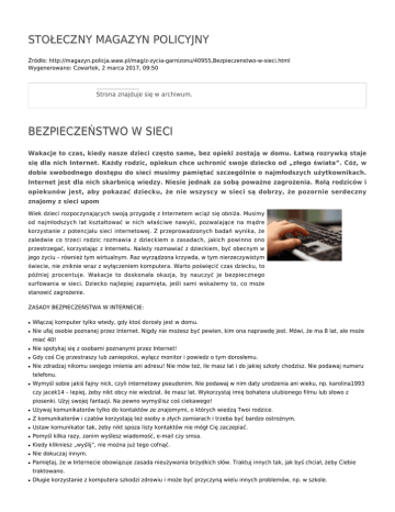STOŁECZNY MAGAZYN POLICYJNY Źródło: http://magazyn.policja.waw.pl/mag/z-zycia-garnizonu/40955,Bezpieczenstwo-w-sieci.html Wygenerowano: Czwartek, 2 marca 2017, 09:50 Strona znajduje się w archiwum. BEZPIECZEŃSTWO W SIECI Wakacje to czas, kiedy nasze dzieci często same, bez opieki zostają w domu. Łatwą rozrywką staje się dla nich Internet. Każdy rodzic, opiekun chce uchronić swoje dziecko od „złego świata”. Cóż, w dobie swobodnego dostępu do sieci musimy pamiętać szczególnie o najmłodszych użytkownikach. Internet jest dla nich skarbnicą wiedzy. Niesie jednak za sobą poważne zagrożenia. Rolą rodziców i opiekunów jest, aby pokazać dziecku, że nie wszyscy w sieci są dobrzy, że pozornie serdeczny znajomy z sieci upom Wiek dzieci rozpoczynających swoją przygodę z Internetem wciąż się obniża. Musimy od najmłodszych lat kształtować w nich właściwe nawyki, pozwalające na mądre korzystanie z potencjału sieci internetowej. Z przeprowadzonych badań wynika, że zaledwie co trzeci rodzic rozmawia z dzieckiem o zasadach, jakich powinno ono przestrzegać, korzystając z Internetu. Należy rozmawiać z dzieckiem, być obecnym w jego życiu – również tym wirtualnym. Raz wyrządzona krzywda, w tym nierzeczywistym świecie, nie zniknie wraz z wyłączeniem komputera. Warto poświęcić czas dziecku, to później procentuje. Wakacje to doskonała okazja, by nauczyć je bezpiecznego surfowania w sieci. Dziecko najlepiej zapamięta, jeśli sami wskażemy to, co może stanowić zagrożenie. ZASADY BEZPIECZEŃSTWA W INTERNECIE: ● Włączaj komputer tylko wtedy, gdy ktoś dorosły jest w domu. ● Nie ufaj osobie poznanej przez Internet. Nigdy nie możesz być pewien, kim ona naprawdę jest. Mówi, że ma 8 lat, ale może mieć 40! ● Nie spotykaj się z osobami poznanymi przez Internet! ● Gdy coś Cię przestraszy lub zaniepokoi, wyłącz monitor i powiedz o tym dorosłemu. ● Nie zdradzaj nikomu swojego imienia ani adresu! Nie mów też, ile masz lat i do jakiej szkoły chodzisz. Nie podawaj numeru telefonu. ● Wymyśl sobie jakiś fajny nick, czyli internetowy pseudonim. Nie podawaj w nim daty urodzenia ani wieku, np. karolina1993 czy jacek14 – lepiej, żeby nikt obcy nie wiedział, ile masz lat. Wykorzystaj imię bohatera ulubionego filmu lub słowo z piosenki. Użyj swojej fantazji. Na pewno wymyślisz coś ciekawego! ● Używaj komunikatorów tylko do kontaktów ze znajomymi, o których wiedzą Twoi rodzice. ● Z komunikatorów i czatów korzystają też osoby o złych zamiarach i trzeba być bardzo ostrożnym. ● Ustaw komunikator tak, żeby nikt spoza listy kontaktów nie mógł Cię zaczepiać. ● Pomyśl kilka razy, zanim wyślesz wiadomość, e-mail czy smsa. ● Kiedy klikniesz „wyślij”, nie można już tego cofnąć. ● Nie dokuczaj innym. ● Pamiętaj, że w Internecie obowiązuje zasada nieużywania brzydkich słów. Traktuj innych tak, jak byś chciał, żeby Ciebie traktowano. ● Długie korzystanie z komputera szkodzi zdrowiu i może być przyczyną wielu innych problemów, np. w szkole. ● Nie zapominaj o sporcie i innych rozrywkach, nie związanych z komputerami i Internetem. Wykorzystano materiały Fundacji Dzieci Niczyje podkom. Ewa Szymańska-Sitkiewicz ZAŁĄCZNIKI DO STRONY Stołeczny Magazyn Policyjny - nr 07/2013 2.61 MB Ocena: 0/5 (0) Tweetnij
