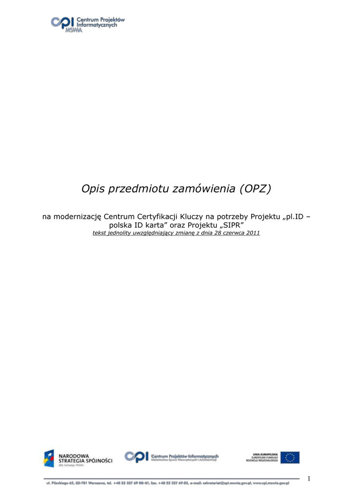 Opis przedmiotu zamówienia (OPZ) na modernizację Centrum Certyfikacji Kluczy na potrzeby Projektu „pl.ID – polska ID karta” oraz Projektu „SIPR” tekst jednolity uwzględniający zmianę z dnia 28 czerwca 2011 1 Wstęp Przedmiotem zamówienia jest modernizacja Centrum Certyfikacji MSWiA zapewniająca generowanie certyfikatów infrastruktury i certyfikatów użytkowników na potrzeby pl.ID i SIPR. W ramach zamówienia Wykonawca: opracuje dwa dokumenty polityki certyfikacji na podstawie wytycznych dostarczonych przez Zamawiającego, uruchomi mechanizmy zarządzania cyklem życia certyfikatów w oparciu o protokół Simple Certificate Enrollment Protocol, dostarczy dwa nowe urzędy certyfikacji zawierające co najmniej cztery serwery sprzętowe wraz z systemami operacyjnymi, cztery moduły kryptograficzne HSM, macierz dyskową, oprogramowanie bazy danych, oprogramowanie realizujące funkcjonalność klastra niezawodnościowego oraz oprogramowanie realizujące funkcjonalność centrum certyfikacji, serwery usług OCSP i SCEP działające w konfiguracji HA z możliwością balansowania ruchu, dostarczy podsystem backupu realizujący funkcjonalność wykonywania kopii bezpieczeństwa (backup), dostarczy dwa przełączniki sieciowe 24 portowe Gigabit Ethernet, dostarczy dwa urządzenia balansujące ruchem dla usług OCSP oraz SCEP, dostarczy aplikacje do zarządzania cyklem życia certyfikatów w oparciu o protokół SCEP oraz OCSP, dostarczy trzy kompletne stanowiska operatorskie przeznaczone do rejestracji oraz obsługi wniosków o wydanie certyfikatów oraz do personalizacji kart współpracujące z dwoma budowanymi urzędami certyfikacji każde wyposażone w komputer PC z systemem operacyjnym, monitor, dwa czytniki kart kryptograficznych, drukarkę do personalizacji graficznej i elektronicznej kart, drukarkę igłową do wydruku kopert utajnionych z kodami do kart, drukarkę do wydruku etykiet samoprzylepnych, drukarkę laserową do wydruku dokumentacji, licencje oprogramowania z funkcjonalnością personalizacji kart dostarczy i skonfiguruje moduł serwera czasu, dostarczy sejf dostarczy szafę Rack włączy nowe urzędy certyfikacji w strukturę drzewa zaufania Centrum Certyfikacji MSWiA, wdroży całe rozwiązanie oraz zapewni wsparcie eksploatacyjne przez okres 6 miesięcy od momentu wskazanego przez Zamawiającego, będzie świadczył usługi gwarancji przez okres 36 miesięcy, przeprowadzi niezbędny instruktaż dla pracowników Zamawiającego. Wymagania I. Wdrożenie dwóch nowych urzędów certyfikacji (CA): 1. Wykonawca wdroży w ramach systemu dwa urzędy certyfikacji: - urząd do generacji kluczy dla urządzeń infrastruktury (w szczególności pl.ID), - urząd do generacji kluczy dla urzędników obsługujących aplikacje lokalne (w szczególności dla projektów pl.ID i SIPR). 2. Urząd dla infrastruktury zapewni w ramach dostarczonej licencji możliwość wydawania nielimitowanej liczby certyfikatów i rejestracji nieograniczonej liczby użytkowników. 3. Urząd dla operatorów zapewni w ramach dostarczonej licencji możliwość wydawania nielimitowanej liczby certyfikatów i rejestracji nieograniczonej liczby użytkowników. 4. CA muszą: - generować certyfikaty klucza publicznego w standardzie X.509 oraz CVC (Card Verifying Certificate) - generować listy CRL/ARL, 2 - umożliwiać obsługę protokołu SCEP, - umożliwiać weryfikację statusu certyfikatów w oparciu o OCSP. 5. System musi gromadzić z zachowaniem zasady niezaprzeczalności i rozliczalności informacje audytowe umożliwiające odtworzenie historii wszystkich operacji wykonywanych w systemie. 6. System musi umożliwiać przeglądanie informacji audytowych w systemie oraz ich eksport z zachowaniem zasad poufności, rozliczalności i niezaprzeczalności. 7. System musi umożliwiać generowanie certyfikatów na podstawie elektronicznych wniosków w formacie PKCS#10. 8. System musi obsługiwać karty kryptograficzne z wykorzystaniem PKCS#11 lub Microsoft CryptoAPI/CSP. 9. Serwerowa część Systemu musi działać w oparciu o przynajmniej jeden z systemów operacyjnych: RedHat, Novell SuSe, Microsoft Windows. 10. System będzie pozwalał wprowadzać polskie znaki diakrytyczne oraz będzie je poprawnie obsługiwał w generowanych certyfikatach z użyciem kodowania w standardzie UTF8. 11. System musi zapewnić mechanizm bezpiecznej automatycznej archiwizacji kluczy przeznaczonych do celów ochrony poufności (szyfrowania) oraz mechanizmy bezpiecznego odtwarzania kluczy z archiwum. 12. System musi prowadzić ewidencję podmiotów (osób) na potrzeby których obsługiwane są wnioski o certyfikaty, generowane są certyfikaty i personalizowane są karty. Na potrzeby prowadzenia takiej ewidencji system musi umożliwić wprowadzenie minimum następujących danych: Imię osoby. Nazwisko osoby. Identyfikator osoby (np. PESEL lub numer służbowy). Organizacja (Np. Gmina). Jednostka organizacyjna (np. wydział lub departament). Stanowisko. Telefon. Fax. Adres e-mail. Ponadto system musi automatycznie rejestrować dodatkowe dane takie jak: Kiedy informacja została zarejestrowana w Systemie. Kto zarejestrował w Systemie dana informację. System musi umożliwić przeglądanie i modyfikowanie rejestru oraz posiadać mechanizmy wyszukiwania rekordów z danymi spełniającymi zadane kryteria. 13. a) System musi posiadać funkcjonalność umożliwiającą administratorowi konfigurację mechanizmu automatycznego powiadamiania subskrybentów drogą e-mailową, którym wydano certyfikaty na zadaną ilość dni przed wygaśnięciem danego certyfikatu o fakcie zbliżania się okresu końca ważności certyfikatu. b) Administrator musi móc selektywnie z dokładnością do zdefiniowanej w systemie polityki wydawania certyfikatów określić możliwość takiego powiadamiania i zdefiniować sposób i treść komunikatu powiadomienia. Powiadomienia muszą być wysyłane na adres e-mail subskrybenta bądź wnioskodawcy według