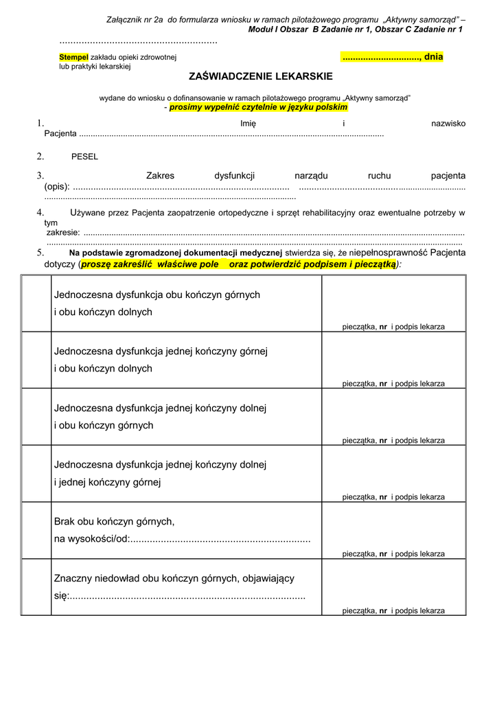 Załącznik nr 2a do formularza wniosku w ramach pilotażowego programu „Aktywny samorząd” – Moduł I Obszar B Zadanie nr 1, Obszar C Zadanie nr 1 ......................................................... .............................., dnia Stempel zakładu opieki zdrowotnej lub praktyki lekarskiej ZAŚWIADCZENIE LEKARSKIE wydane do wniosku o dofinansowanie w ramach pilotażowego programu „Aktywny samorząd” - prosimy wypełnić czytelnie w języku polskim 1. Imię i Pacjenta .................................................................................................................................... 2. nazwisko PESEL 3. Zakres dysfunkcji narządu ruchu pacjenta (opis): ..................................................................................... ....................................... ............................. ............................................................................................................. 4. Używane przez Pacjenta zaopatrzenie ortopedyczne i sprzęt rehabilitacyjny oraz ewentualne potrzeby w tym zakresie: ..................................................................................................................................................................... .................................................................................................................................................................................... 5. Na podstawie zgromadzonej dokumentacji medycznej stwierdza się, że niepełnosprawność Pacjenta dotyczy (proszę zakreślić właściwe pole oraz potwierdzić podpisem i pieczątką): Jednoczesna dysfunkcja obu kończyn górnych i obu kończyn dolnych pieczątka, nr i podpis lekarza Jednoczesna dysfunkcja jednej kończyny górnej i obu kończyn dolnych pieczątka, nr i podpis lekarza Jednoczesna dysfunkcja jednej kończyny dolnej i obu kończyn górnych pieczątka, nr i podpis lekarza Jednoczesna dysfunkcja jednej kończyny dolnej i jednej kończyny górnej pieczątka, nr i podpis lekarza Brak obu kończyn górnych, na wysokości/od:................................................................. pieczątka, nr i podpis lekarza Znaczny niedowład obu kończyn górnych, objawiający się:..................................................................................... pieczątka, nr i podpis lekarza Inne schorzenia:.................................................................... pieczątka, nr i podpis lekarza Str. 2 załącznika nr 2a do formularza wniosku – dotyczy formularzy wniosków – Moduł I Obszar C Zadanie nr 1 6. Ponadto (pole obowiązkowe w przypadku Pacjenta ubiegającego się o dofinansowanie w ramach obszaru C programu) - na podstawie zgromadzonej dokumentacji medycznej stwierdza się, że: proszę zakreślić właściwe pola 1. Pacjent może poruszać się na wózku inwalidzkim o napędzie ręcznym: tak nie 2. Korzystanie z wózka o napędzie elektrycznym jest niewskazane, gdyż może spowodować wstrzymanie lub pogorszenie procesu rehabilitacji lub wpłynie niekorzystnie na sprawność kończyn górnych: tak nie 3. Przeciwwskazania do korzystania z wózka o napędzie elektrycznym (np. utraty przytomności, epilepsja): .................................................................. ......................................... ................................................................................... ............................................ ............................... brak przeciwwskazań pieczątka, nr i podpis lekarza Dotyczy wyłącznie Wnioskodawców ubiegających się o zwiększenie kwoty dofinansowania na zakup wózka inwalidzkiego o napędzie elektrycznym Pacjent z uwagi na ograniczenia funkcjonalne, stan i zakres dysfunkcji narządu ruchu powodującej niepełnosprawność wymaga zakupu wózka inwalidzkiego o napędzie elektrycznym z ponadstandardowym wyposażeniem, w tym: (proszę zakreślić właściwe pola ) niestandardowe sterowniki umożliwiające sterowanie wózkiem za pomocą jedynie władnych części ciała jak np.: ręki, palca, brody, stopy, warg lub wdechu i wydechu powietrza itp. urządzenia umożliwiające prowadzenie wózka także przez osobę towarzyszącą (hamulec, sterownik itp.) niestandardowe siedzisko (np. z windą podnoszącą, rehabilitacyjne, zapewniające maksymalną stabilizację, przeciwodleżynowe, itp.) specjalne, regulowane (w tym elektrycznie i w różnych płaszczyznach): podnóżki, podłokietniki lub oparcia nadgarstków kliny zapobiegające zsuwaniu się Pacjenta z wózka lub podpórki boczne, peloty piersiowe zagłówek stabilizujący głowę i szyję (w kształcie litery U) specjalne pasy bezpieczeństwa (np. dwupunktowe zapinane na biodrach, czteropunktowe) taki sposób, aby wózek był indywidualnie dopasowany do sylwetki Pacjenta (np. w przypadku niestandardowego wzrostu czy wagi Pacjenta) inne elementy i urządzenia (np. umożliwiające podłączenia joysticka wózka do komputera i posługiwanie się nim jak myszką), jakie: ........................................, dnia .............. (miejscowość ) (data) ............................................... pieczątka, nr i podpis lekarza Str. 3 załącznika nr 2a do formularza wniosku – dotyczy formularzy wniosków – Moduł I Obszar C Zadanie nr 3 i 4 ......................................................... .............................., dnia Stempel zakładu opieki zdrowotnej lub praktyki lekarskiej ZAŚWIADCZENIE LEKARSKIE wydane do wniosku o dofinansowanie w ramach pilotażowego programu „Aktywny samorząd” - prosimy wypełnić czytelnie w języku polskim 1. Imię i nazwisko Pacjenta ................................................................................................................................. 2. PESEL 3. Stwierdza się, że niepełnosprawność Pacjenta dotyczy (proszę zakreślić właściwe pole potwierdzić podpisem i pieczątką): Amputacja w zakresie ręki pieczątka, nr i podpis lekarza Amputacja w zak