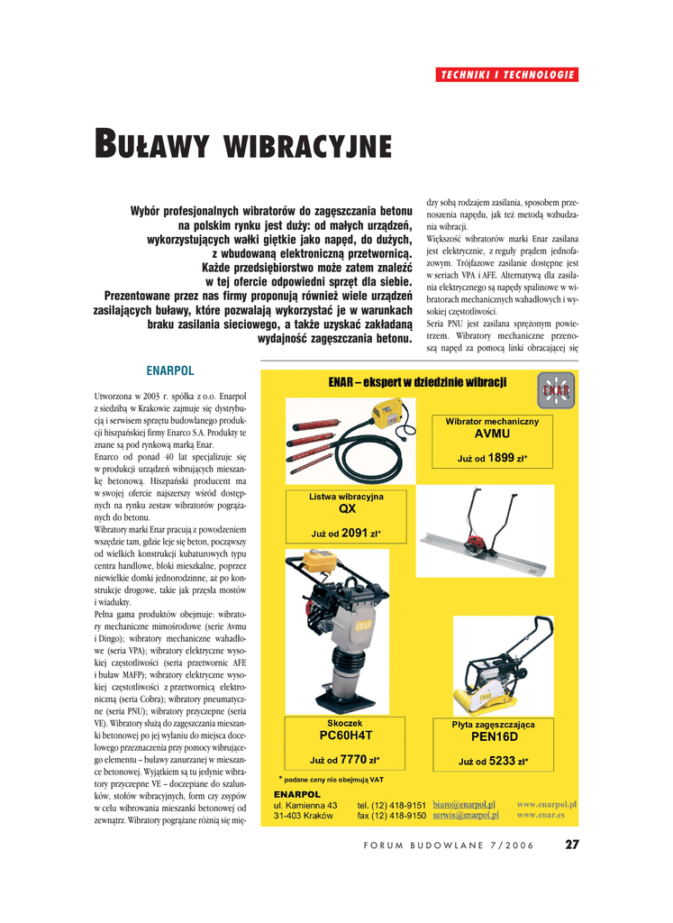 TECHNIKI I TECHNOLOGIE BUŁAWY WIBRACYJNE Wybór profesjonalnych wibratorów do zagęszczania betonu na polskim rynku jest duży: od małych urządzeń, wykorzystujących wałki giętkie jako napęd, do dużych, z wbudowaną elektroniczną przetwornicą. Każde przedsiębiorstwo może zatem znaleźć w tej ofercie odpowiedni sprzęt dla siebie. Prezentowane przez nas firmy proponują również wiele urządzeń zasilających buławy, które pozwalają wykorzystać je w warunkach braku zasilania sieciowego, a także uzyskać zakładaną wydajność zagęszczania betonu. dzy sobą rodzajem zasilania, sposobem przenoszenia napędu, jak też metodą wzbudzania wibracji. Większość wibratorów marki Enar zasilana jest elektrycznie, z reguły prądem jednofazowym. Trójfazowe zasilanie dostępne jest w seriach VPA i AFE. Alternatywą dla zasilania elektrycznego są napędy spalinowe w wibratorach mechanicznych wahadłowych i wysokiej częstotliwości. Seria PNU jest zasilana sprężonym powietrzem. Wibratory mechaniczne przenoszą napęd za pomocą linki obracającej się ENARPOL Utworzona w 2003 r. spółka z o.o. Enarpol z siedzibą w Krakowie zajmuje się dystrybucją i serwisem sprzętu budowlanego produkcji hiszpańskiej firmy Enarco S.A. Produkty te znane są pod rynkową marką Enar. Enarco od ponad 40 lat specjalizuje się w produkcji urządzeń wibrujących mieszankę betonową. Hiszpański producent ma w swojej ofercie najszerszy wśród dostępnych na rynku zestaw wibratorów pogrążanych do betonu. Wibratory marki Enar pracują z powodzeniem wszędzie tam, gdzie leje się beton, począwszy od wielkich konstrukcji kubaturowych typu centra handlowe, bloki mieszkalne, poprzez niewielkie domki jednorodzinne, aż po konstrukcje drogowe, takie jak przęsła mostów i wiadukty. Pełna gama produktów obejmuje: wibratory mechaniczne mimośrodowe (serie Avmu i Dingo); wibratory mechaniczne wahadłowe (seria VPA); wibratory elektryczne wysokiej częstotliwości (seria przetwornic AFE i buław MAFP); wibratory elektryczne wysokiej częstotliwości z przetwornicą elektroniczną (seria Cobra); wibratory pneumatyczne (seria PNU); wibratory przyczepne (seria VE). Wibratory służą do zagęszczania mieszanki betonowej po jej wylaniu do miejsca docelowego przeznaczenia przy pomocy wibrującego elementu – buławy zanurzanej w mieszance betonowej. Wyjątkiem są tu jedynie wibratory przyczepne VE – doczepiane do szalunków, stołów wibracyjnych, form czy zsypów w celu wibrowania mieszanki betonowej od zewnątrz. Wibratory pogrążane różnią się mięFORUM BUDOWLANE 7/2006 27 Wibrator Dingo z paletą buław szkoleni w kwestiach handlowych i serwisowych, służą zatem pomocą i radą w doborze odpowiednich urządzeń. Gwarancja udzielana jest na okres 12 miesięcy, serwis centralny i magazyn części zamiennych znajdują się w siedzibie firmy w Krakowie. Bieżącej obsługi urządzeń dokonuje sieć dystrybutorów w całej Polsce. Fot. Enarco wewnątrz zbrojonego wałka giętkiego. Wibratory wysokiej częstotliwości to buławy zaopatrzone w wewnętrzny silnik elektryczny zasilany z przetwornicy prądem o podwyższonej częstotliwości 200 Hz. Wewnątrz wałka ochronnego znajdują się jedynie przewody elektryczne. Wibratory pneumatyczne to z kolei buławy z wewnętrzną turbiną, poruszaną przy pomocy sprężonego powietrza. Wewnątrz wałka ochronnego znajdują się dwie rurki: jedna doprowadzająca, druga odprowadzająca sprężone powietrze. Nowością w ofercie firmy jest nowy wibrator mechaniczny Dingo, mający w przyszłości zastąpić najbardziej popularny produkt Enarco – wibrator Avmu. Napęd Dingo zamknięty jest w walcowatej obudowie z niezwykle twardego plastiku, odpornego na uderzenia i wstrząsy. Silnik elektryczny jest umieszczony w wewnętrznej obudowie, dodatkowo zabezpieczony z zewnątrz. Napęd został wyposażony w 4 uchwyty: 3 boczne i 1 tylny, pozwalające swobodnie manewrować narzędziem podczas pracy. Na wlocie powietrza umieszczono filtr zabezpieczający wnętrze napędu przed dostawaniem się tam niepożądanych Fot. Enarco TECHNIKI I TECHNOLOGIE Wibrator mechaniczny mimośrodowy Dingo materiałów, takich jak piasek, beton, żwir. Inaczej niż w Avmu zostało też rozwiązane mocowanie wałka giętkiego. W Dingo nic nie wystaje z napędu. Ciekawym rozwiązaniem jest zestaw uchwytów, szczególnie uchwyt tylny, pozwalający na pionową pracę wibratora, dzięki czemu unika się nadmiernego wyginania wałka giętkiego i zaoszczędza jego długość. W związku z tym można efektywnie pracować tym urządzeniem z wałkami krótszymi o 1 m. Podczas gdy standardem w Avmu były wałki o dł. 4 m, w Dingo takim standardem ma być wałek o dł. 3 m. Komfort pracy zapewnia ponadto załączony pasek, a przede wszystkim niska waga urządzenia, ułatwiająca manewrowanie. Dystrybutorzy zostali prze- 28 FORUM BUDOWLANE PERLES Perles oferuje całą gamę wibratorów do zagęszczania betonu: od małych, wykorzystujących wałki giętkie jako napęd buław, do dużych urządzeń, w których do generowania drgań stosuje się bezkomutatorowe elektryczne silniki prądu przemiennego. Na początek przybliżmy buławy z wałkiem giętkim, który przenosi napęd z silnika na wibrator. Jest on napędzany przenośnym silnikiem elektrycznym CMP. Wałek giętki umieszczono w przewodzie gumowym podwójnie zabezpieczonym siatką drucianą i wewnętrznym płaszczem stalowym. Perles oferuje szeroką gamę tego typu buław. Mają 7/2006 one średnice 28, 35 lub 42 mm i długość 3 albo 4 m. Urządzenia te pracują z prędkością obrotową 10000 min-1 i mogą być używane do zagęszczania odpowiednio 8, 10 i 20 m3 betonu/godz. Ich waga mieści się w przedziale od 9 do 12,3 kg. Kolejna grupa to buławy elektroniczne wysokiej częstotliwości z elektronicznym konwerterem 230 V. Urządzenia te mają średnicę od 38 do 65 mm i długość 7 m. Wyposażono je w elektroniczną przetwornic