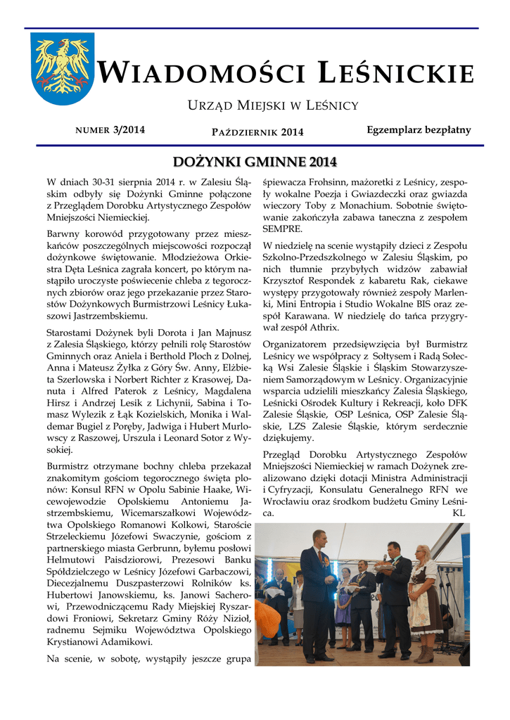 W IADOMOŚCI L EŚNICKIE U RZĄD M IEJSKI W L EŚNICY NUMER 3/2014 P AŹDZIERNIK 2014 Egzemplarz bezpłatny DOŻYNKI GMINNE 2014 W dniach 30-31 sierpnia 2014 r. w Zalesiu Śląskim odbyły się Dożynki Gminne połączone z Przeglądem Dorobku Artystycznego Zespołów Mniejszości Niemieckiej. Barwny korowód przygotowany przez mieszkańców poszczególnych miejscowości rozpoczął dożynkowe świętowanie. Młodzieżowa Orkiestra Dęta Leśnica zagrała koncert, po którym nastąpiło uroczyste poświecenie chleba z tegorocznych zbiorów oraz jego przekazanie przez Starostów Dożynkowych Burmistrzowi Leśnicy Łukaszowi Jastrzembskiemu. Starostami Dożynek byli Dorota i Jan Majnusz z Zalesia Śląskiego, którzy pełnili rolę Starostów Gminnych oraz Aniela i Berthold Ploch z Dolnej, Anna i Mateusz Żyłka z Góry Św. Anny, Elżbieta Szerlowska i Norbert Richter z Krasowej, Danuta i Alfred Paterok z Leśnicy, Magdalena Hirsz i Andrzej Lesik z Lichynii, Sabina i Tomasz Wylezik z Łąk Kozielskich, Monika i Waldemar Bugiel z Poręby, Jadwiga i Hubert Murlowscy z Raszowej, Urszula i Leonard Sotor z Wysokiej. Burmistrz otrzymane bochny chleba przekazał znakomitym gościom tegorocznego święta plonów: Konsul RFN w Opolu Sabinie Haake, Wicewojewodzie Opolskiemu Antoniemu Jastrzembskiemu, Wicemarszałkowi Województwa Opolskiego Romanowi Kolkowi, Staroście Strzeleckiemu Józefowi Swaczynie, gościom z partnerskiego miasta Gerbrunn, byłemu posłowi Helmutowi Paisdziorowi, Prezesowi Banku Spółdzielczego w Leśnicy Józefowi Garbaczowi, Diecezjalnemu Duszpasterzowi Rolników ks. Hubertowi Janowskiemu, ks. Janowi Sacherowi, Przewodniczącemu Rady Miejskiej Ryszardowi Froniowi, Sekretarz Gminy Róży Nizioł, radnemu Sejmiku Województwa Opolskiego Krystianowi Adamikowi. Na scenie, w sobotę, wystąpiły jeszcze grupa śpiewacza Frohsinn, mażoretki z Leśnicy, zespoły wokalne Poezja i Gwiazdeczki oraz gwiazda wieczory Toby z Monachium. Sobotnie świętowanie zakończyła zabawa taneczna z zespołem SEMPRE. W niedzielę na scenie wystąpiły dzieci z Zespołu Szkolno-Przedszkolnego w Zalesiu Śląskim, po nich tłumnie przybyłych widzów zabawiał Krzysztof Respondek z kabaretu Rak, ciekawe występy przygotowały również zespoły Marlenki, Mini Entropia i Studio Wokalne BIS oraz zespół Karawana. W niedzielę do tańca przygrywał zespół Athrix. Organizatorem przedsięwzięcia był Burmistrz Leśnicy we współpracy z Sołtysem i Radą Sołecką Wsi Zalesie Śląskie i Śląskim Stowarzyszeniem Samorządowym w Leśnicy. Organizacyjnie wsparcia udzielili mieszkańcy Zalesia Śląskiego, Leśnicki Ośrodek Kultury i Rekreacji, koło DFK Zalesie Śląskie, OSP Leśnica, OSP Zalesie Śląskie, LZS Zalesie Śląskie, którym serdecznie dziękujemy. Przegląd Dorobku Artystycznego Zespołów Mniejszości Niemieckiej w ramach Dożynek zrealizowano dzięki dotacji Ministra Administracji i Cyfryzacji, Konsulatu Generalnego RFN we Wrocławiu oraz środkom budżetu Gminy Leśnica. KL W IADOMOŚCI L EŚNICKIE S TR . 2 Wybory do rad gmin, rad powiatów i sejmików województw oraz wójtów, burmistrzów i prezydentów miast zarządzone na dzień 16 listopada 2014 r. W tegorocznych wyborach samorządowych w Gminie Leśnica wybieramy: - radnych do Rady Miejskiej w Leśnicy, - Burmistrza Leśnicy, - radnych do Rady Powiatu Strzeleckiego, - radnych do Sejmiku Województwa Opolskiego. Radnych do Rady Miejskiej w Leśnicy wybieramy w piętnastu jednomandatowych okręgach wyborczych, które przedstawiają się następująco: Numer okręgu 1. Granice okręgu Liczba radnych wybieranych w okręgu Miasto Leśnica – ulice: 1 Maja, Bolesława Chrobrego, Dworcowa, Eichendorffa, Kościuszki od nr 1 do nr 13, Ligonia, Ludowa, Niwy, Osiedle, Poprzeczna, Powstańców Śląskich, Strażacka, Strzelecka, Szpitalna, Wargały 1 2. Miasto Leśnica – ulice: Kościelna, Kościuszki nr 19 i nr 21, Ko- 3. 6. Miasto Leśnica – ulice: Górna, Góry Świętej Anny, Mickiewicza, Plac Narutowicza od nr 1 do nr 11 i od nr 22 do nr 29, Plac Targowy, Polna, Porębska, Słowackiego, Trzech Braci Sołectwo Poręba Miasto Leśnica – ulice: Biskupa Schaffrana, Boczna, Goreckiego, Klasztorna, Krasowska, Krótka, Ojca Kanizego, Ojca Teofila, Ojców Kulawy, Prałata Glowatzkiego, Sarnesa, Szkolna, Żeromskiego, Żyrowska Miasto Leśnica – ulice: Brzegowa, Księżowiejska, Młyńska, Nad Potokiem, Nad Wodą, Plac Marka, Stawowa, Zdzieszowicka, Zielona Sołectwo Góra Świętej Anny 7. Sołectwo Wysoka 1 8. Sołectwa: Czarnocin, Dolna 1 9. Sołectwo Kadłubiec 1 10. Sołectwo Lichynia 1 11. Sołectwo Zalesie Śląskie – ulice: XV Lecia, Sławięcicka, Strażac- 12. Sołectwo Zalesie Śląskie – ulice: Dworcowa, Kościelna, Kościuszki, Leśnicka, Padoły, Powstańców Śląskich, Świętej Jadwigi Sołectwo Krasowa 4. 5. 13. 14. 15. Sołectwo Raszowa – ulice: Góry Świętej Anny od nr 1 do nr 94, Kolejowa, Kościelna, Lipowa, Młyńska Sołectwo Raszowa – ulice: Góry Świętej Anny od nr 95 do nr 150, Dworcowa, Kuszówka, Słowackiego, Szkolna Sołectwo Łąki Kozielskie 1 1 1 1 1 1 1 1 1 1 NUMER S TR . 3 3/2014 Wyborcy głosować będą w ośmiu lokalach wyborczych tj. w siedmiu stałych obwodach głosowania i w obwodzie odrębnym utworzonym w Domu Pomocy Społecznej w Strzelcach Opolskich - Filia w Leśnicy. Siedziby obwodowych komisji wyborczych tak, jak dotychczas usytuowane będą: 1. Obwodowa Komisja Wyborcza Nr 1 w Leśnicy Urząd Miejski w Leśnicy, ul. 1 Maja 9, Leśnica W siedzibie tej komisji wyborca dokonuje wyboru radnego z okręgu wyborczego Nr 1 lub Nr 2, lub Nr 3 w zależności od miejsca swojego zamieszkania. 2. Obwodowa Komisja Wyborcza Nr 2 w Leśnicy Szkoła Podstawowa, ul. Zdzieszowicka 23, Leśnica W siedzibie tej komisji wyborca dokonuje wyboru radnego z okręgu wyborczego Nr 4 lub Nr 5 w zależności od miejsca swojego zamieszkania. 7. Obwodowa Komisja Wyborcza Nr 7 w Raszowej Zespół Szkolno