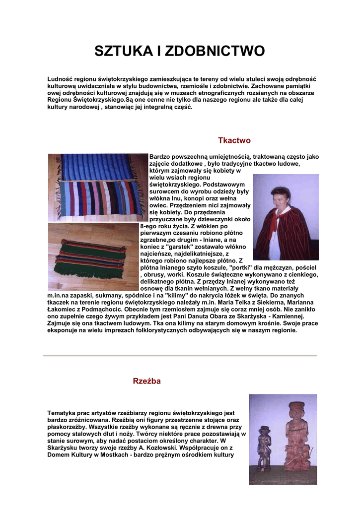 SZTUKA I ZDOBNICTWO Ludność regionu świętokrzyskiego zamieszkująca te tereny od wielu stuleci swoją odrębność kulturową uwidaczniała w stylu budownictwa, rzemiośle i zdobnictwie. Zachowane pamiątki owej odrębności kulturowej znajdują się w muzeach etnograficznych rozsianych na obszarze Regionu Świętokrzyskiego.Są one cenne nie tylko dla naszego regionu ale także dla całej kultury narodowej , stanowiąc jej integralną część. Tkactwo Bardzo powszechną umiejętnością, traktowaną często jako zajęcie dodatkowe , było tradycyjne tkactwo ludowe, którym zajmowały się kobiety w wielu wsiach regionu świętokrzyskiego. Podstawowym surowcem do wyrobu odzieży były włókna lnu, konopi oraz wełna owiec. Przędzeniem nici zajmowały się kobiety. Do przędzenia przyuczane były dziewczynki około 8-ego roku życia. Z włókien po pierwszym czesaniu robiono płótno zgrzebne,po drugim - lniane, a na koniec z "garstek" zostawało włókno najcieńsze, najdelikatniejsze, z którego robiono najlepsze płótno. Z płótna lnianego szyto koszule, "portki" dla mężczyzn, pościel , obrusy, worki. Koszule świąteczne wykonywano z cienkiego, delikatnego płótna. Z przędzy lnianej wykonywano też osnowę dla tkanin wełnianych. Z wełny tkano materiały m.in.na zapaski, sukmany, spódnice i na "kilimy" do nakrycia łóżek w święta. Do znanych tkaczek na terenie regionu świętokrzyskiego należały m.in. Maria Telka z Siekierna, Marianna Łakomiec z Podmąchocic. Obecnie tym rzemiosłem zajmuje się coraz mniej osób. Nie zanikło ono zupełnie czego żywym przykładem jest Pani Danuta Obara ze Skarżyska - Kamiennej. Zajmuje się ona tkactwem ludowym. Tka ona kilimy na starym domowym krośnie. Swoje prace eksponuje na wielu imprezach folklorystycznych odbywających się w naszym regionie. Rzeźba Tematyka prac artystów rzeźbiarzy regionu świętokrzyskiego jest bardzo zróżnicowana. Rzeźbią oni figury przestrzenne stojące oraz płaskorzeźby. Wszystkie rzeźby wykonane są ręcznie z drewna przy pomocy stalowych dłut i noży. Twórcy niektóre prace pozostawiają w stanie surowym, aby nadać postaciom określony charakter. W Skarżysku tworzy swoje rzeźby A. Kozłowski. Współpracuje on z Domem Kultury w Mostkach - bardzo prężnym ośrodkiem kultury ludowej naszego regionu - gdzie wystawia swoje prace. Na zdjęciu obok widzimy dwie rzeźby wykonane przez tego właśnie artystę. Garncarstwo Garncarstwo jest jednym z najstarszych i najbardziej rozpowszechnionych rzemiosł w regionie świętokrzyskim. Ośrodki garncarskie powstawały przede wszystkim tam, gdzie istniało odpowiednie zaplecze surowcowe. Do najciekawszych, wygasłych w okresie międzywojennym oraz istniejących do dzisiaj należą warsztaty z Denkowa, Kątów Denkowskich, Koszar, Chałupek, Odrowąża, Rędocina, Iłży, Skalbmierza, Sobótki i Szczekocin. Obok pozbawionych szkliwa "biskwitów" i popularnych "siwaków" wyrabiane są naczynia pokryte szkliwem, barwy zielonej, miodowej i brunatnej. Garnki, dwojaki, misy i dzbany posiadają tradycyjne formy i charakterystyczne dla warsztatów zdobnictwo. Tradycje lepienia glinianych figur sięgają początku naszego stulecia. Ceramika figuralna zapoczątkowana przez garncarzy iłżeckich i rozwijana w innych ośrodkach Kielecczyzny jest do dzisiaj kontynuowanym działem plastyki ludowej. Do utalentowanych artystów, których prace prezentowane są na wielu wystawach, należą: Stanisław Pastuszkiewicz, Stanisław Kosiarski i jego córka Jadwiga, Konstanty Ciepielewski (Iłża), Stanisław Seweryński (Odrowąż), Andrzej Rokita (Rędocin), Tadeusz Połetek, Helena Kaczmarska (Ostrowiec), Stefan Sowiński (Chałupki). W celu propagowania zanikającego w ostatnich czasach garncarstwa powołano w Chałupkach "Szkółkę Garncarską", prowadzoną przez Wojewódzki Dom Kultury w Kielcach. Otwarto także w tej miejscowości "Ośrodek Tradycji Garncarstwa", w którym prezentowane są wyroby gliniane. Zabawkarstwo Dawniej dzieci, mieszkające we wsiach świętokrzyskich, bawiły się przeważnie zabawkami wykonanymi z naturalnych i łatwo dostępnych surowców, jak: słoma, sitowie, skrawki tkanin, drewno i glina. W ten oto sposób powstawały gliniane: "gwizdawki",fujarki i miniaturowe naczynia wytwarzane przez zawodowych garncarzy oraz zabawki drewniane produkowane w okolicach Łącznej: dwu- i trzykonne bryczki, "kolibki" na biegunach, "karuzelki", motyle i ptaki z ruchomymi skrzydłami, wózki, konie na biegunach. Do znanych wykonawców zabawek ludowych drewnianych należą Stanisław Cisek z Ostojowa, Roman i Piotr Piwowarczykowie z Łącznej. Zabawki ze słomy, sitowia i bibuły wykonuje m.in.Genowefa Kaleta z Mąchocic. Zabawki sprzedawano na targach oraz na odpustach i jarmarkach. Drobne sprzęty drewniane W tradycyjnym modelu samowystarczalnej gospodarki wiejskiej regionu świętokrzyskiego bardzo powszechna była umiejętność obróbki drewna - wyrób drewnianych naczyń dłubanych, w pewnym zakresie ciesielstwo, a nawet stolarstwo; plecionkarstwa - wyrób naczyń ze słomy, wikliny. Wyrobem takich przedmiotów, przede wszystkim na własne potrzeby, zajmowało się wielu gospodarzy. Niemniej jednak w niektórych wsiach świętokrzyskich istniały wyspecjalizowane warsztaty zajmujące się produkcją i sprzedażą, bądź świadczący inne usługi rzemieślnicze. W okolicach Łysej Góry włościanie trudnili się wyrobem przetaków i opałek. W Brzezinach (gm. Masłów) wyrabiano laski i miotły. W okolicach Suchedniowa robiono wrzeciona i przęślice. Na terenie całego regionu wytwarzano drewniane maselnice do wyrobu masła, naczynia na wodę, maglownice do prania bielizny, buty zwane "trepami" oraz łyżki drewniane. Duże ośrodki wyrobu sprzętów drewnianych znajdowały się przeważnie na terenach zalesionych np. w okolicach Rakowa, Bielin czy Łącznej. Do ich wytwarzania wykorzystywano różne gatunki drzew, głównie liściaste. Ł