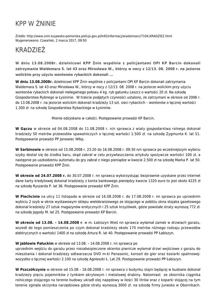 KPP W ŻNINIE Źródło: http://www.znin.kujawsko-pomorska.policja.gov.pl/k45/informacj/wiadomosci/7104,KRADZIEZ.html Wygenerowano: Czwartek, 2 marca 2017, 09:50 KRADZIEŻ W dniu 13.08.2008r. dzielnicowi KPP Żnin wspólnie z policjantami OPI KP Barcin dokonali zatrzymania Waldemara S. lat 43 oraz Mirosława W., którzy w nocy z 12/13. 08. 2008 r. na jeziorze wolickim przy użyciu wontonów rybackich dokonali ... W dniu 13.08.2008r. dzielnicowi KPP Żnin wspólnie z policjantami OPI KP Barcin dokonali zatrzymania Waldemara S. lat 43 oraz Mirosława W., którzy w nocy z 12/13. 08. 2008 r. na jeziorze wolickim przy użyciu wontonów rybackich dokonali nielegalnego połowu 4 kg. ryb gatunku Leszcz o wartości 20 zł. Na szkodę Gospodarstwa Rybnego w Łysininie. W trakcie podjętych czynności ustalono, że zatrzymani w okresie od 2006 r. do 13.08.2008 r. na jeziorze wolickim dokonali kradzieży 13 szt. sieci rybackich – wontonów o łącznej wartości 1.300 zł. na szkodę Gospodarstwa Rybackiego w Łysininie. Mienie odzyskano w całości. Postępowanie prowadzi KP Barcin. W Gączu w okresie od 04.08.2008 do 11.08.2008 r. n/n sprawca z wiaty gospodarstwa rolnego dokonał kradzieży 50 metrów przewodów spawalniczych o łącznej wartości 1.500 zł. na szkodę Zygmunta K. lat 51. Postępowanie prowadzi PP Janowiec Wlkp. W Sarbinowie w okresie od 15.08.2008 r. 23:20 do 16.08.2008 r. 09:30 n/n sprawca po wcześniejszym wybiciu szyby dostał się do środka baru, skąd zabrał w celu przywłaszczenia artykuły spożywcze wartości 100 zł, a następnie po uszkodzeniu automatu do gry zabrał z niego pieniądze w kwocie 2.500 zł na szkodę Marka P. lat 50. Postępowanie prowadzi KPP Żnin. W okresie od 24.07.2008 r. do 30.07.2008 r. nn sprawca wykorzystując bezprawnie uzyskane przez internet dane karty kredytowej dokonał kradzieży z konta bankowego pieniędzy kwocie 1320 euro to jest około 4225 zł na szkodę Ryszarda P. lat 36. Postępowanie prowadzi KPP Żnin. W Piechcinie na ulicy 11 listopada w okresie od 16.08.2008 r. do 17.08.2008 r. nn sprawca po uprzednim wybiciu 2 szyb w oknie wystawowym sklepu wielobranżowego ze stojącego w pobliżu okna stojaka gazetowego dokonał kradzieży 27 sztuk magazynów erotycznych i 25 sztuk krzyżówek, gdzie powstałe straty wynoszą 772 zł. na szkodę Jagody M. lat 25. Postępowanie prowadzi KP Barcin. W okresie od 13.08. – 14.08.2008 r. w m. Łabiszyn Wieś nn sprawca wyłamał zamek w drzwiach garażu, wszedł do tego pomieszczenia po czym dokonał kradzieży około 170 metrów różnego rodzaju przewodów elektrycznych o wartości 1400 zł na szkodę Artura R. lat 40. Postępowanie prowadzi PP Łabiszyn. W Jabłowie Pałuckim w okresie od 13.08. – 14.08.2008 r. nn sprawca po uprzednim wejściu do garażu przez niezabezpieczone okienko piwnicze wyłamał drzwi wejściowe z garażu do mieszkania i dokonał kradzieży odtwarzacza DVD m-ki Panasonic, konsoli do gier oraz kosiarki spalinowejwszystko o łącznej wartości 2.100 na szkodę Agnieszki Ł. Lat 29. Postępowanie prowadzi PP Łabiszyn. W Pszczółczynie w okresie od 15.08 – 16.08.2008 r. nn sprawca z budynku stajni będącej w budowie dokonał kradzieży pięciu pojemników z tynkiem akrylowym i metalowej drabiny. Natomiast ze zbiornika ciągnika rolniczego stojącego na terenie budowy ukradł olej napędowy w ilości 30 litrów oraz z koparki stojącej na tym terenie zginęła skrzynka narzędziowa gdzie straty wynoszą 3000 zł. na szkodę firmy Junesko w Obornikach. Postępowanie prowadzi PP Łabiszyn. Autor: red2.kppz Publikacja: red2.kppz Ocena: 0/5 (0) Tweetnij