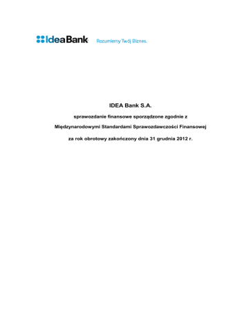IDEA Bank S.A. sprawozdanie finansowe sporządzone zgodnie z Międzynarodowymi Standardami Sprawozdawczości Finansowej za rok obrotowy zakończony dnia 31 grudnia 2012 r. IDEA Bank S.A. Sprawozdanie finansowe za rok zakończony dnia 31 grudnia 2012r. (dane podane w tys. zł) SPIS TREŚCI: 1. Nr strony Zestawienie sprawozdań Banku: 1.1. Rachunek zysków i strat 2 1.2. Sprawozdanie z całkowitych dochodów 3 1.3. Sprawozdanie z sytuacji finansowej 4 1.4. Sprawozdanie z przepływów pieniężnych 5 1.5. Sprawozdanie ze zmian w kapitale własnym 6 2. INFORMACJE OGÓLNE 3. POLITYKA RACHUNKOWOŚCI 12 4. NOTY OBJAŚNIAJĄCE 29 5. 4.1. Przychody i koszty z tytułu odsetek 29 4.2. Przychody i koszty z tytułu prowizji i opłat 29 4.3. Pozostałe przychody i koszty operacyjne 30 4.4. Przychody z udziałów lub akcji, pozostałych papierów wartościowych i innych instrumentów finansowych – dywidendy 31 4.5. Ogólne koszty administracyjne 31 4.6. Wynagrodzenia/świadczenia pracownicze 32 4.7. Utrata wartości i odpisy aktualizacyjne 34 4.8. Podatek dochodowy 36 4.9. Zysk na jedną akcję 37 4.10. Kasa, środki w Banku Centralnym 38 4.11. Należności od Banków 38 4.12. Kredyty i pożyczki udzielone klientom 38 4.13. Instrumenty dłużne w kategorii pożyczek i należności oraz aktywa dostępne do sprzedaży 39 4.14. Udziały w jednostkach stowarzyszonych i zależnych 40 4.15. Wartości niematerialne 41 4.16. Rzeczowe aktywa trwałe 43 4.17. Inne aktywa 44 4.18. Zobowiązania wobec innych banków i instytucji 44 4.19. Zobowiązania z tytułu emisji dłużnych papierów wartościowych 44 4.20. Zobowiązania wobec klientów 45 4.21. Pozostałe zobowiązania 46 4.22. Zobowiązania warunkowe 47 4.23. Kapitał zakładowy 49 4.24. Nieruchomości inwestycyjne 50 4.25. Środki pieniężne i ich ekwiwalenty 50 4.26. Zdarzenia po dacie bilansowej 51 4.27. Wypłacalność 51 4.28. Wartość godziwa aktywów i zobowiązań finansowych 52 4.29. Transakcje z podmiotami powiązanymi 54 4.30. Wynagrodzenie biegłego rewidenta 57 ZARZĄDZANIE RYZYKIEM 57 5.1. Ryzyko kredytowe 57 5.2. Ryzyko operacyjne 64 5.3. Ryzyko rynkowe 65 5.3.1. Ryzyko stopy procentowej 6. 7 65 5.4. Ryzyko płynności 70 5.5. Ryzyko walutowe 74 5.6. Zarządzanie kapitałem 76 Istotne wydarzenia w 2012 roku 77 1 IDEA Bank S.A. Sprawozdanie finansowe za rok zakończony dnia 31 grudnia 2012r. (dane podane w tys. zł) 1.1 RACHUNEK ZYSKÓW I STRAT za rok zakończony 31 grudnia 2012 r. Inform acja dodatkow a 01.01.2011- 31.12.2011 (dane przekształcone) tys. PLN 01.01.201231.12.2012 tys. PLN I. Przychody z tytułu odsetek 4.1 258 505 81 544 II. Koszty z tytułu odsetek 4.1 -187 695 -50 014 70 810 31 530 IV. Przychody z tytułu prow izji i opłat 4.2 202 438 58 476 V. 4.2 -62 948 -12 091 139 490 46 385 266 246 III. Wynik z tytułu odsetek Koszty z tytułu prow izji i opłat VI. Wynik z tytułu prow izji i opłat VII. Wynik z tytułu pozycji w ymiany VIII. Przychody z udziałów lub akcji, pozostałych papierów w artościow ych i innych instrumentów finansow ych 4.4 54 240 767 IX. Pozostałe przychody operacyjne 4.3 14 837 29 820 X. Pozostałe koszty operacyjne 4.3 -9 521 -3 158 5 316 26 662 4.7 -30 576 -15 524 4.5, 4.6 -165 030 -76 312 XIV. Wynik z działalności operacyjnej 74 516 13 754 XV. Zysk (strata) brutto 74 516 13 754 XVI. Podatek dochodow y -4 497 -2 613 70 019 11 141 XI. Pozostałe przychody i koszty operacyjne netto XII. Wynik z tytułu odpisów aktualizujących z tytułu utraty w artości kredytów , pożyczek XIII. Ogólne koszty administracyjne 4.8 XVII. Zysk (strata) netto Zysk na jedną akcję – podstaw ow y zysk za rok obrotow y (PLN) 4.9 1,94 0,42 – rozw odniony zysk za rok obrotow y (PLN) 4.9 1,94 0,42 Noty od 4 do 6 do sprawozdania finansowego załączone na stronach od 29 do 76 stanowią jego integralną część 2 IDEA Bank S.A. Sprawozdanie finansowe za rok zakończony dnia 31 grudnia 2012r. (dane podane w tys. zł) 1.2 SPRAWOZDANIE Z CAŁKOWITYCH DOCHODÓW za rok zakończony 31 grudnia 2012 r. Zysk/ (strata) za okres Wycena aktyw ów finansow ych dostępnych do sprzedaży Podatek odroczony od aktyw ów finansow ych dostępnych do sprzedaży Inne całkow ite dochody netto Całkow ite dochody za okres 01.01.2012 - 31.12.2012 01.01.2011 - 31.12.2011 tys. PLN tys. PLN 70 019 11 141 1 569 -18 -298 0 71 290 3 0 11 126 Noty od 4 do 6 do sprawozdania finansowego załączone na stronach od 29 do 76 stanowią jego integralną część 3 IDEA Bank S.A. Sprawozdanie finansowe za rok zakończony dnia 31 grudnia 2012r. (dane podane w tys. zł) 1.3 SPRAWOZDANIE Z SYTUACJI FINANSOWEJ na dzień 31 grudnia 2012 r. Inform acja dodatkow a 31.12.2012 31.12.2011 tys. PLN tys. PLN AKTYWA Kasa, środki w Banku Centralnym Należności od banków Kredyty i pożyczki udzielone klientom 4.10 4.11 4.12 91 390 176 114 3 304 459 46 918 132 426 1 578 293 Inw estycje w jednostkach zależnych 4.14 820 589 265 525 Instrumenty dłużne 4.13 40 928 23 489 Aktyw a dostępne do sprzedaży 4.13 650 991 413 525 Pochodne instrumenty finansow e Wartości niematerialne Rzeczow e aktyw a trw ałe Nieruchomości inw estycyjne Inne aktyw a 4.15 4.16 4.24 4.17 152 30 878 58 530 41 152 121 737 0 17 687 51 169 0 23 919 5 336 920 2 552 951 4.18 337 346 111 523 Zobow iązania z tytułu emisji dłużnych instrumentów finansow ych Pochodne instrumenty finansow e 4.19 136 119 0 Zobow iązania w obec klientów Pozostałe zobow iązania Rezerw a z tytułu odroczonego podatku dochodow ego 4.20 4.21 4.8 Rezerw y pozostałe 0 3 883 036 64 836 5 527 1 529 366 1 986 566 51 215 844 1 221 SUMA ZOBOWIĄZAŃ 4 428 393 2 151 735 96 936 70 019 741 572 53 289 11 141 336 786 908 527 401 216 5 336 920 2 552 951 SUMA AKTYWÓW ZOBOWIĄZANIA I KAPITAŁ WŁASNY Zobow iązania Zobow iązania w obec innych banków i instytucji finansow ych Kapitał w łasny Kapitał zakładow y Niepodzielony w ynik finansow y Pozostałe kapitały Kapitał w łasny ogółem SUMA ZOBOWIĄZAŃ I KAPITAŁU W
