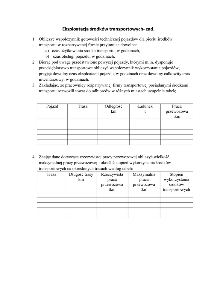 Eksploatacja środków transportowych- zad. 1. Obliczyć współczynnik gotowości technicznej pojazdów dla pięciu środków transportu w rozpatrywanej firmie przyjmując dowolne: a) czas użytkowania środka transportu, w godzinach, b) czas obsługi pojazdu, w godzinach. 2. Biorąc pod uwagę przedstawione powyżej pojazdy, którymi m.in. dysponuje przedsiębiorstwo transportowe obliczyć współczynnik wykorzystania pojazdów, przyjąć dowolny czas eksploatacji pojazdu, w godzinach oraz dowolny całkowity czas inwentarzowy, w godzinach. 3. Zakładając, że pracownicy rozpatrywanej firmy transportowej posiadanymi środkami transportu rozwozili towar do odbiorców w różnych miastach uzupełnić tabelę. Pojazd Trasa Odległość km Ładunek t Praca przewozowa tkm 4. Znając dane dotyczące rzeczywistej pracy przewozowej obliczyć wielkość maksymalnej pracy przewozowej i określić stopień wykorzystania środków transportowych na określonych trasach według tabeli: Trasa Długość trasy Rzeczywista Maksymalna Stopień km praca praca wykorzystania przewozowa przewozowa środków tkm tkm transportowych 5. Obliczyć koszt jednostkowy wozokilometra dla poszczególnych pojazdów samochodowych z firmy transportowej, przewożących na zróżnicowanychtrasach określony ładunek, uwzględniając całkowity koszt własny. Pojazd Trasa Długość trasy km Waga ładunku t Całkowity koszt własny PLN Koszt jednostkowy wozokilometra 6. Wyznaczyć średni dobowy czas pracy i średni dobowy czas jazdy poszczególnych środków transportowych (czas pracy, czas jazdy pojazdu, dni pracy przyjąć w sposób dowolny) Pojazd Czas pracy h Czas jazdy pojazdu h Dni pracy Średni dobowy czas pracy h Współczynnik wykorzystania czasu pracy pojazdu Średni dobowy czas jazdy h 7. Obliczyć odpowiednie wartości przyjmując za dowolne trasę oraz długość trasy. Pojazd Trasa Długość trasy km Czas jazdy pojazdu h Czynności Prędkość Prędkość towarzyszące techniczna eksploatacyjna h pojazdu pojazdu Km/h Km/h 8. Przedstawić i przeanalizować pięć środków transportowych i tras wykonanych przez nie w ciągu miesiąca. Analiza wykorzystania środków transportowych dotyczy: a) Pracy przewozowej b) Maksymalnej pracy przewozowej c) Współczynnika wykorzystania ładowności d) Wskaźnika wykorzystania przebiegu e) Wskaźnika wykorzystania przestrzeni ładunkowej środka transportu Dane potrzebne do obliczeń przyjąć z tabeli poniższej wcześniej uzupełniając odpowiednimi danymi. Lp Nazwa Pojazd 1 Wielkość przewożonego ładunku, kg 1 2 3 4 5 Objętość ładunków przeznaczonych do przewiezienia,m3 Przebieg środków transportowych km Maksymalna ładowność środka transportu, kg Wymiary skrzyni ładunkowej m 1 2 2 3 4 5 1 2 3 4 5 1 2 3 4 5 1 2 3 4 5 Wymiar Długość 1 2 3 4 5 3 4 Przewozy Szerokość 5 6 Wysokość Na podstawie uzyskanych wyników obliczyć wartość średnią (6 ostatnich przewozów) poszczególnych wartości. Uzupełnić poniższą tabelę. Lp Nazwa Pojazd 1 2 3 4 5 1 Praca przewozowa 2 Maksymalna praca przewozowa 3 Współczynnik wykorzystania ładowności 4 Wskaźnik wykorzystania przebiegu 5 Wskaźnik wykorzystania przestrzeni ładunkowej środka transportowego Dokonać analizy zależności obliczonych prac przewozowych dla poszczególnych pojazdów. Wykonaj analizę wielkości uzyskanych wyników. Który z pojazdów osiągnął najlepszy lub najwyższy współczynnik dotyczący: a) Pracy przewozowej b) Maksymalnej pracy przewozowej c) Współczynnika wykorzystania ładowności d) Wskaźnika wykorzystania przebiegu e) Wskaźnika wykorzystania przestrzeni ładunkowej środka transportowego