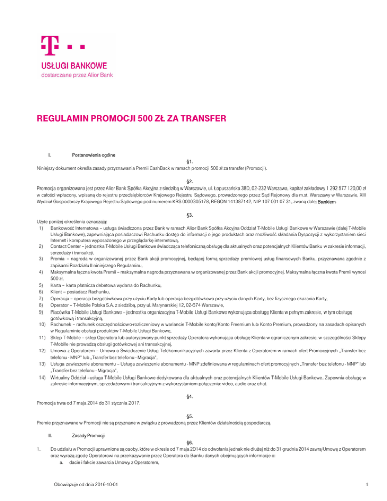 REGULAMIN PROMOCJI 500 ZŁ ZA TRANSFER I. Postanowienia ogólne §1. Niniejszy dokument określa zasady przyznawania Premii CashBack w ramach promocji 500 zł za transfer (Promocji). §2. Promocja organizowana jest przez Alior Bank Spółka Akcyjna z siedzibą w Warszawie, ul. Łopuszańska 38D, 02-232 Warszawa, kapitał zakładowy 1 292 577 120,00 zł w całości wpłacony, wpisaną do rejestru przedsiębiorców Krajowego Rejestru Sądowego, prowadzonego przez Sąd Rejonowy dla m.st. Warszawy w Warszawie, XIII Wydział Gospodarczy Krajowego Rejestru Sądowego pod numerem KRS 0000305178, REGON 141387142, NIP 107 001 07 31, zwaną dalej Bankiem. §3. Użyte poniżej określenia oznaczają: 1) Bankowość Internetowa – usługa świadczona przez Bank w ramach Alior Bank Spółka Akcyjna Oddział T-Mobile Usługi Bankowe w Warszawie (dalej T-Mobile Usługi Bankowe), zapewniająca posiadaczowi Rachunku dostęp do informacji o jego produktach oraz możliwość składania Dyspozycji z wykorzystaniem sieci Internet i komputera wyposażonego w przeglądarkę internetową, 2) Contact Center – jednostka T-Mobile Usługi Bankowe świadcząca telefoniczną obsługę dla aktualnych oraz potencjalnych Klientów Banku w zakresie informacji, sprzedaży i transakcji, 3) Premia – nagroda w organizowanej przez Bank akcji promocyjnej, będącej formą sprzedaży premiowej usług finansowych Banku, przyznawana zgodnie z zapisami Rozdziału II niniejszego Regulaminu, 4) Maksymalna łączna kwota Premii – maksymalna nagroda przyznawana w organizowanej przez Bank akcji promocyjnej. Maksymalna łączna kwota Premii wynosi 500 zł, 5) Karta – karta płatnicza debetowa wydana do Rachunku, 6) Klient – posiadacz Rachunku, 7) Operacja – operacja bezgotówkowa przy użyciu Karty lub operacja bezgotówkowa przy użyciu danych Karty, bez fizycznego okazania Karty, 8) Operator – T-Mobile Polska S.A. z siedzibą, przy ul. Marynarskiej 12, 02-674 Warszawie, 9) Placówka T-Mobile Usługi Bankowe – jednostka organizacyjna T-Mobile Usługi Bankowe wykonująca obsługę Klienta w pełnym zakresie, w tym obsługę gotówkową i transakcyjną, 10) Rachunek – rachunek oszczędnościowo-rozliczeniowy w wariancie T-Mobile konto/Konto Freemium lub Konto Premium, prowadzony na zasadach opisanych w Regulaminie obsługi produktów T-Mobile Usługi Bankowe, 11) Sklep T-Mobile – sklep Operatora lub autoryzowany punkt sprzedaży Operatora wykonująca obsługę Klienta w ograniczonym zakresie, w szczególności Sklepy T-Mobile nie prowadzą obsługi gotówkowej ani transakcyjnej, 12) Umowa z Operatorem – Umowa o Świadczenie Usług Telekomunikacyjnych zawarta przez Klienta z Operatorem w ramach ofert Promocyjnych „Transfer bez telefonu - MNP” lub „Transfer bez telefonu - Migracja”, 13) Usługa zawieszenie abonamentu – Usługa zawieszenie abonamentu - MNP zdefiniowana w regulaminach ofert promocyjnych „Transfer bez telefonu - MNP” lub „Transfer bez telefonu - Migracja”, 14) Wirtualny Oddział –usługa T-Mobile Usługi Bankowe dedykowana dla aktualnych oraz potencjalnych Klientów T-Mobile Usługi Bankowe. Zapewnia obsługę w zakresie informacyjnym, sprzedażowym i transakcyjnym z wykorzystaniem połączenia: video, audio oraz chat. §4. Promocja trwa od 7 maja 2014 do 31 stycznia 2017. §5. Premie przyznawane w Promocji nie są przyznane w związku z prowadzoną przez Klientów działalnością gospodarczą. II. 1. Zasady Promocji §6. Do udziału w Promocji uprawnione są osoby, które w okresie od 7 maja 2014 do odwołania jednak nie dłużej niż do 31 grudnia 2014 zawrą Umowę z Operatorem oraz wyrażą zgodę Operatorowi na przekazywanie przez Operatora do Banku danych obejmujących informacje o: a. dacie i fakcie zawarcia Umowy z Operatorem, Obowiązuje od dnia 2016-10-01 1 Regulamin Promocji 500 zł za transfer 2. 3. 4. 5. 6. 7. 8. 9. 1. 2. 3. 4. 5. b. braku zaległości z tytułu płatności faktur za Umowę z Operatorem w danym miesiącu – informacja ta będzie przekazywana co miesiąc w czasie trwania Promocji, c. rozwiązaniu, zmianie, wypowiedzeniu lub wygaśnięciu Umowy z Operatorem oraz są posiadaczami Rachunku lub założą Rachunek w ciągu 30 dni kalendarzowych od dnia zawarcia Umowy z Operatorem, przy czym: a. W przypadku Umów z Operatorem zawieranych za pośrednictwem kuriera, decydująca jest data złożenia przez Klienta podpisu na Umowie z Operatorem. b. W przypadku umów Rachunku zawieranych za pośrednictwem kuriera, decydująca jest data złożenia wniosku. c. W przypadku umów zawieranych w trybie „Potwierdzenie umowy przelewem”, decydujący jest dzień przesłania przez Bank potwierdzenia zawarcia umowy zgodnie z Regulaminem obsługi produktów T-Mobile Usługi Bankowe. Zgoda, o której mowa w ust. 1 przyjmuje następującą treść: „W celu wzięcia udziału w organizowanej przez Alior Bank S.A. (dalej Bank) akcji promocyjnej pod nazwą „Promocja 500 zł za Transfer” wyrażam zgodę T-Mobile Polska S.A. (dalej Operator) na udostępnienie do Banku danych obejmujących informacje o: a) dacie i fakcie zawarcia z Operatorem Umowy o Świadczenie Usług Telekomunikacyjnych (dalej Umowa), b) braku zaległości z tytułu płatności faktur za Umowy z Operatorem w danym miesiącu – informacja ta będzie przekazywana do Banku co miesiąc w czasie trwania Promocji, c) rozwiązaniu, zmianie, wypowiedzeniu lub wygaśnięciu Umowy z Operatorem.” Wyrażenie niniejszej zgody jest dobrowolne jednakże stanowi warunek wzięcia udziału w Promocji. W ramach Promocji Klient uprawiony jest do otrzymania od Banku comiesięcznej Premii w wysokości 50 zł z zastrzeżeniem ust. 1. Maksymalna łączna kwota Premii przysługujących Klientowi wynosi 500 zł. Premia stanowi nagrodę uzyskaną w związku ze sprzedażą premiową w rozumieniu art. 21 ust. 1 pkt 68 Ustawy z dnia 26 lipca 1991 r. o podatku dochodowym od osób fizycznych (tekst jednolity Dz. U. z 2012 poz. 361 z p