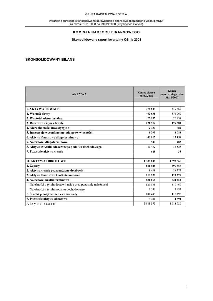GRUPA KAPITAŁOWA PGF S.A. Kwartalne skrócone skonsolidowane sprawozdanie finansowe sporządzone według MSSF za okres 01.01.2008 do 30.09.2008 (w tysiącach złotych) K O M I S J A N AD Z O R U F I N AN S O W E G O Skonsolidowany raport kwartalny QS III/ 2008 SKONSOLIDOWANY BILANS AKTYWA I. AKTYWA TRWAŁE 1. Wartość firmy 2. Wartości niematerialne 3. Rzeczowe aktywa trwałe 4. Nieruchomości inwestycyjne 5. Inwestycje wyceniane metodą praw własności 6. Aktywa finansowe długoterminowe 7. Należności długoterminowe 8. Aktywa z tytułu odroczonego podatku dochodowego 9. Pozostałe aktywa trwałe II. AKTYWA OBROTOWE 1. Zapasy 2. Aktywa trwałe przeznaczone do zbycia 3. Aktywa finansowe krótkoterminowe 4. Należności krótkoterminowe Należności z tytułu dostaw i usług oraz pozostałe należności Należności z tytułu podatku dochodowego 5. Środki pieniężne i ich ekwiwalenty 6. Pozostałe aktywa obrotowe Aktywa razem Koniec okresu 30/09/2008 Koniec poprzedniego roku 31/12/2007 776 524 619 360 462 635 376 760 25 957 26 834 221 954 179 684 2 739 882 1 293 1 081 40 917 17 154 949 402 19 452 16 528 628 35 1 338 848 1 392 360 581 928 597 868 8 418 24 372 110 970 127 779 531 665 521 454 529 135 519 460 2 530 1 994 102 483 116 296 3 384 4 591 2 115 372 2 011 720 1 GRUPA KAPITAŁOWA PGF S.A. Kwartalne skrócone skonsolidowane sprawozdanie finansowe sporządzone według MSSF za okres 01.01.2008 do 30.09.2008 (w tysiącach złotych) PASYWA I. KAPITAŁ WŁASNY RAZEM 1. Kapitał własny podmiotu dominującego 1.1 Kapitał zakładowy 1.2 Należne wpłaty na kapitał zakładowy (wielkość ujemna) 1.3 Kapitał zapasowy 1.4 Kapitał z aktualizacji wyceny 1.5 Akcje własne 1.6 Kapitał pozostały - rezerwowy 1.7 Różnice kursowe z przeliczenia jednostek podporządkowanych 1.8. Niepodzielony wynik finansowy - zysk (strata) z lat ubiegłych - zysk (strata) netto 2. Kapitały mniejszości II . ZOBOWIĄZANIA I POZOSTAŁE PASYWA DŁUGOTERMINOWE 1. Zobowiązania i rezerwy długoterminowe 1.1 Zobowiązania finansowe 1.2 Rezerwa z tytułu odroczonego podatku dochodowego 1.3 Rezerwy długoterminowe 2. Pozostałe pasywa długoterminowe III. ZOBOWIĄZANIA I POZOSTAŁE PASYWA KRÓTKOTERMINOWE 1. Zobowiązania i rezerwy krótkoterminowe 1.1 Zobowiązania finansowe 1.2 Rezerwy krótkoterminowe 1.3 Zobowiązania z tytułu dostaw i usług oraz pozostałe zobowiązania 1.4 Zobowiązania z tytułu podatku dochodowego 2. Pozostałe pasywa krótkoterminowe Pasywa razem Koniec okresu 30/09/2008 Koniec poprzedniego roku 31/12/2007 390 967 406 581 300 776 286 429 25 521 25 521 320 623 - 272 722 - (7 461) (399) 65 424 19 223 (12 657) (5 347) (90 674) (25 291) (118 774) (99 701) 28 100 74 410 90 191 120 152 563 694 613 372 562 127 611 871 538 166 587 464 12 682 13 563 11 279 10 844 1 567 1 501 1 160 711 991 767 1 156 402 979 756 202 861 108 083 4 439 3 700 946 071 856 733 3 031 11 240 4 309 12 011 2 115 372 2 011 720 2 GRUPA KAPITAŁOWA PGF S.A. Kwartalne skrócone skonsolidowane sprawozdanie finansowe sporządzone według MSSF za okres 01.01.2008 do 30.09.2008 (w tysiącach złotych) SKONSOLIDOWANY RACHUNEK ZYSKÓW I STRAT 3 kwartał 2008 okres od 01/07/2008 do 30/09/2008 3 kwartały 2008 narastająco okres od 01/01/2008 do 30/09/2008 3 kwartał 2007 okres od 01/07/2007 do 30/09/2007 3 kwartały 2007 narastająco okres od 01/01/2007 do 30/09/2007 DZIAŁALNOŚĆ KONTYNUOWANA Przychody ze sprzedaży 1 213 728 3 876 606 1 040 545 3 198 738 Koszt własny sprzedaży (2 873 539) (1 089 576) (3 481 910) (942 450) Zysk (strata) ze sprzedaży 124 152 394 696 98 095 325 199 Koszty sprzedaży (81 556) (251 569) (67 387) (214 531) Koszty ogólnego zarządu (34 164) (99 599) (20 839) (61 311) 2 917 8 192 9 129 10 841 Udział w zyskach (stratach) netto jednostek stowarzyszonych 221 238 167 251 Zysk (strata) na działalności operacyjnej 11 570 51 958 19 165 60 449 139 1 508 657 1 077 7 953 24 477 7 357 16 164 (14 841) (40 213) (7 999) (18 670) Pozostałe przychody (koszty) operacyjne netto Zysk (strata) z inwestycji Przychody finansowe Koszty finansowe Zysk (strata) brutto Podatek dochodowy Zysk (strata) netto z działalności kontynuowanej 4 821 37 730 19 180 59 020 (2 750) (11 033) (3 935) (10 648) 2 071 26 697 15 245 48 372 DZIAŁALNOŚĆ ZANIECHANA Strata netto z działalności zaniechanej Zysk (strata) netto ogółem - - - - 2 071 26 697 15 245 48 372 Akcjonariuszom podmiotu dominujacego 2 738 28 100 15 425 48 192 Akcjonariuszom mniejszościowym (667) (1 403) (180) 180 Przypadający: Zysk za okres sprawozdawczy Średnia ważona liczba akcji zwykłych Średnia ważona rozwodniona liczba akcji zwykłych Działalność kontynuowana 28 100 48 192 12 551 752 12 587 680 12 551 752 12 587 680 2,24 3,83 2,24 3,83 Zysk na jedną akcję zwykłą (w zł) - podstawowy / rozwodniony Działalność kontynuowana i zaniechana Zysk na jedną akcję zwykłą (w zł) - podstawowy / rozwodniony 3 GRUPA KAPITAŁOWA PGF S.A. Kwartalne skrócone skonsolidowane sprawozdanie finansowe sporządzone według MSSF za okres 01.01.2008 do 30.09.2008 (w tysiącach złotych) SKONSOLIDOWANY RACHUNEK PRZEPŁYWÓW PIENIĘŻNYCH Koniec okresu 30/09/2008 Koniec okresu porównywalnego 30/09/2007 A. Przepływy środków pieniężnych z działalności operacyjnej (metoda pośrednia) I. Zysk (strata) przed opodatkowaniem II. Korekty razem 1. Udział w (zyskach) stratach netto jednostek podporządkowanych wycenianych metodą praw własności 2. Amortyzacja 3. (Zyski) straty z tytułu różnic kursowych 3. Odsetki i udziały w zyskach (dywidendy) 4. (Zysk) strata z działalności inwestycyjnej 5. Zmiana stanu zapasów 6. Zmiana stanu należności 7. Zmiana stanu zobowiązań krótkoterminowych, z wyjątkiem pożyczek i kredytów 8. Zapłacony podatek dochodowy 9. Inne korekty netto III. Przepływy pieniężne netto z działalności operacyjnej (I +/- II) - metoda pośrednia B. Przepływy środków pieniężnych z działalności inwestycyjnej I. Wpływy 1. Zbycie