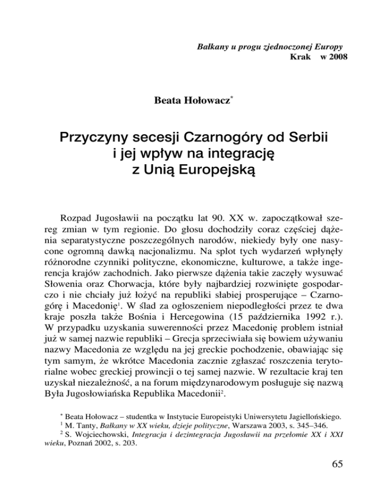 Bałkany u progu zjednoczonej Europy Kraków 2008 Beata Hołowacz* Przyczyny secesji Czarnogóry od Serbii i jej wpływ na integrację z Unią Europejską Rozpad Jugosławii na początku lat 90. XX w. zapoczątkował szereg zmian w tym regionie. Do głosu dochodziły coraz częściej dążenia separatystyczne poszczególnych narodów, niekiedy były one nasycone ogromną dawką nacjonalizmu. Na splot tych wydarzeń wpłynęły różnorodne czynniki polityczne, ekonomiczne, kulturowe, a także ingerencja krajów zachodnich. Jako pierwsze dążenia takie zaczęły wysuwać Słowenia oraz Chorwacja, które były najbardziej rozwinięte gospodarczo i nie chciały już łożyć na republiki słabiej prosperujące – Czarnogórę i Macedonię1. W ślad za ogłoszeniem niepodległości przez te dwa kraje poszła także Bośnia i Hercegowina (15 października 1992 r.). W przypadku uzyskania suwerenności przez Macedonię problem istniał już w samej nazwie republiki – Grecja sprzeciwiała się bowiem używaniu nazwy Macedonia ze względu na jej greckie pochodzenie, obawiając się tym samym, że wkrótce Macedonia zacznie zgłaszać roszczenia terytorialne wobec greckiej prowincji o tej samej nazwie. W rezultacie kraj ten uzyskał niezależność, a na forum międzynarodowym posługuje się nazwą Była Jugosłowiańska Republika Macedonii2. ∗ Beata Hołowacz – studentka w Instytucie Europeistyki Uniwersytetu Jagiellońskiego. M. Tanty, Bałkany w XX wieku, dzieje polityczne, Warszawa 2003, s. 345–346. 2 S. Wojciechowski, Integracja i dezintegracja Jugosławii na przełomie XX i XXI wieku, Poznań 2002, s. 203. 1 65 Tak więc w rozczłonkowanej Jugosławii pozostały tylko Serbia i Czarnogóra, które w kwietniu 1992 r. utworzyły nowy twór państwowy o nazwie Federacyjna Republika Jugosławii. Ustawa zasadnicza wprowadzała dwuizbowy parlament związkowy: Skupsztina składała się z Rady Obywateli (138 mandatów) oraz Rady Republik (40 mandatów). Parlament wybierał prezydenta federacji, powoływał rząd federacji. Gabinet ponosił polityczną odpowiedzialność przed Skupsztiną. Kadencja parlamentu została określona na cztery lata. Jednakże takie rozwiązanie nie można uznać za kontynuacje dawnego modelu federalnego, opartego na związku sześciu republik3. Można by się zastanowić, dlaczego Czarnogóra nie poszła wówczas w ślad za innymi republikami związkowymi i nie ogłosiła niepodległości. Z pewnością na ten stan rzeczy złożyła się trudna sytuacja gospodarcza Czarnogóry, która w dużym stopniu był uzależniona od Serbii oraz nacisk rządu serbskiego na utworzenie republiki. Belgrad starał się przy tym zachować pozycję dominującą i niejako budować idee Wielkiej Serbii. Ponadto w 1992 r. przytłaczająca większość Czarnogórców głosowała za utrzymaniem Jugosławii. Tymczasem funkcjonowanie federacji było wadliwe. Różnice między siostrzanymi republikami można było dostrzec na każdej płaszczyźnie. W obliczu kryzysu kosowskiego Czarnogóra ogłosiła naturalność, jednak działania wojenne prowadzone na jej terenie były nieuniknione. Z tego też powodu Podgorica została także obłożona sankcjami przez zachód. Ponosiła ona niejako konsekwencje polityki Serbii, na którą nie miała większego wpływu4. Z upływem czasu narastał konflikt między dwoma najbardziej wpływowymi politykami rządzącej wówczas Demokratycznej Partii Socjalistów – prezydentem państwa Slobodanem Miloševiciem i premierem Milo Đukanoviciem. Przyczyną sporu była coraz silniejsza chęć dominacji Serbów nad Czarnogórcami, która przejawiała się w sprawach gospodarczych, a także rywalizacją obu polityków w wyborach prezydenckich w 1996 r. W rezultacie szef rządu utworzył nowe ugrupowanie – Socjalistyczną Partię Ludową i odtąd prężnie działał na rzecz secesji Czarnogóry od Serbii. Z tych dążeń nie zrezygnowano także po opuszczeniu stanowiska prezydenta Federacyjnej Republiki Jugosławii przez Slobodana Miloševicia5. 3 J. Wojnicki, System konstytucyjny Serbii i Czarnogóry, Warszawa 2005, s. 12. K. Karczewski, Dezintegracja dla integracji, http://www.e-polityka.pl. 5 K. Zalewski, Nowe państwo Czarnogóra, Gazeta Wyborcza z 15 maja 2006 r., s. 15. 4 66 Tendencje emancypacyjne przejawiały się w konkretnych działaniach rządu. Utworzono własną służbę celną, otwarto granice i zniesiono wizy, udzielono amnestii osobom, które odmówiły służby wojskowej, w 2000 r. zarejestrowano także Czarnogórską Cerkiew Prawosławną, która osiemdziesiąt lat wcześniej została wchłonięta przez Serbską Cerkiew Prawosławną6. Aspiracje niepodległościowe osiągnęły punkt kulminacyjny w 2002 r., kiedy to w wyniku prowadzonych rozmów z udziałem dyplomacji europejskiej ustalono zmianę struktury państwa. W miejsce Federacyjnej Republiki Jugosławii utworzono 4 lutego 2004 r. unię Serbii i Czarnogóry na podstawie podpisania przez prezydentów obu republik tzw. Porozumienia Belgradzkiego. Połączenie w jedno państwo Serbii i Czarnogóry było poniekąd wynikiem nacisku Unii Europejskiej, a zwłaszcza Wysokiego Przedstawiciela UE ds. Wspólnej Polityki Zagranicznej i Obronnej Javiera Solany, który przez kilka lat intensywnie działał na serbskiej scenie politycznej, niejako sprawował nad nią „patronat”. Bruksela dążyła do utworzenia związku obu republik, gdyż obawiała się o kolejne krwawe zmiany na Bałkanach. Według czarnego scenariusza mogłoby dojść do rozpadu Macedonii, kolejnego konfliktu w Kosowie, możliwych zamieszek w Wojwodinie. Ponadto dyplomaci europejscy obawiali się, że niepodległa Czarnogóra może stać się centrum przemytu i prania brudnych pieniędzy. Nielegalny handel rozpoczął się tu na wielką skalę w momencie nałożenia na Jugosławię sankcji przez ONZ. Wówczas napięte stosunki między Miloševiciem a władzami lokalnymi sprawiły, że większość produktów takich jak pa