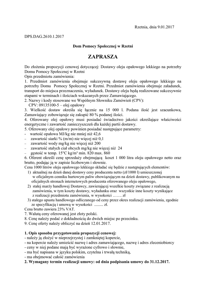 Rzetnia, dnia 9.01.2017 DPS.DAG.2610.1.2017 Dom Pomocy Społecznej w Rzetni ZAPRASZA Do złożenia propozycji cenowej dotyczącej: Dostawy oleju opałowego lekkiego na potrzeby Domu Pomocy Społecznej w Rzetni Opis przedmiotu zamówienia: 1. Przedmiot zamówienia obejmuje sukcesywną dostawę oleju opałowego lekkiego na potrzeby Domu Pomocy Społecznej w Rzetni. Przedmiot zamówienia obejmuje załadunek, transport do miejsca przeznaczenia, wyładunek. Dostawy oleju będą realizowane sukcesywnie etapami w terminach i ilościach wskazanych przez Zamawiającego. 2. Nazwy i kody stosowane we Wspólnym Słowniku Zamówień (CPV): CPV: 09135100-5 – olej opałowy 3. Wielkość dostaw określa się łącznie na 15 000 l. Podana ilość jest szacunkowa, Zamawiający zobowiązuje się zakupić 80 % podanej ilości. 4. Oferowany olej opałowy musi posiadać świadectwo jakości określające właściwości energetyczne i zawartość zanieczyszczeń dla każdej partii dostawy. 5. Oferowany olej opałowy powinien posiadać następujące parametry: - wartość opałowa MJ/kg nie mniej niż 42,6 zawartość siarki % (m/m) nie więcej niż 0,1 zawartość wody mg/kg nie więcej niż 200 zawartość stałych ciał obcych mg/kg nie więcej niż 24 gęstość w temp. 15°C kg/m³ min. 820 max. 860 6. Oferent określi cenę sprzedaży obejmującą koszt 1 000 litra oleju opałowego netto oraz brutto, podając ją w zapisie liczbowym i słownie. Cena 1000 litrów oleju opałowego lekkiego składać się będzie z następujących elementów: aktualnej na dzień danej dostawy ceny producenta netto (zł/1000 l) umieszczonej w oficjalnym cenniku hurtowym paliw obowiązującym na dzień dostawy, publikowanym na oficjalnych stronach internetowych producenta oferowanego oleju opałowego, 2) stałej marży handlowej Dostawcy, zawierającej wszelkie koszty związane z realizacją zamówienia, w tym koszty dostawy, wyładunku oraz wszystkie inne koszty wynikające z realizacji przedmiotu zamówienia, w wysokości ……. zł 3) stałego upustu handlowego odliczanego od ceny przez okres realizacji zamówienia, zgodnie ze specyfikacją i umową w wysokości ......... zł. Cena brutto zawiera 23% VAT. 7. Walutą ceny oferowanej jest złoty polski. 8. Cenę należy podać z dokładnością do dwóch miejsc po przecinku. 9. Cenę oferty należy obliczyć na dzień 12.01.2017. 1. Opis sposobu przygotowania propozycji cenowej: - należy ją złożyć w nieprzejrzystej i zamkniętej kopercie, - na kopercie należy umieścić nazwę i adres zamawiającego, nazwę i adres zleceniobiorcy - ceny w niej podane mają być wyrażone cyfrowo i słownie, - ma być napisana w języku polskim, czytelna i trwałą techniką, - ma obejmować całość zamówienia 2. Wymagany termin realizacji umowy: od dnia podpisania umowy do 31.12.2017. 3. Termin płatności – 21 dni od daty wpływu faktury wystawionej. 4. Przy wyborze propozycji do realizacji zamawiający będzie się kierował kryterium: - cena 5. Wykonawca składający propozycję cenową, składa następujące dokumenty: - formularz ofertowy wg załączonego wzoru, - kserokopię aktualnego wpisu do właściwego rejestru, uprawniającego zleceniobiorcę do występowania w obrocie prawnym (potwierdzoną za zgodność z oryginałem przez zleceniobiorcę), - oświadczenie Wykonawcy, że spełnia następujące warunki wg załączonego wzoru: * posiada kompetencje i uprawnienia do wykonywania określonej działalności lub czynności, jeśli przepisy prawa nakładają obowiązek ich posiadania, * dysponuje odpowiednim zdolnościami technicznymi i zawodowymi do wykonania niniejszego zamówienia, * znajduje się w sytuacji ekonomicznej i finansowej zapewniającej wykonanie zamówienia, * nie podlega wykluczeniu z postępowania o udzielenie zamówienia. 6. Opis sposobu obliczania ceny w składanej propozycji cenowej. W cenę należy wliczyć: - wartość usługi określoną w oparciu o przedmiot zamówienia, - obowiązujący podatek od towarów i usług VAT 7. Miejsce i termin złożenia propozycji cenowej: Propozycję cenową należy złożyć w terminie do dnia 18.01.2017 w zaklejonej kopercie w Biurze Domu Pomocy Społecznej w Rzetni. Kopertę należy zaadresować na Dom Pomocy Społecznej w Rzetni, Rzetnia 87, 63-600 Kępno oraz napis: Propozycja cenowa dot. dostawy oleju opałowego lekkiego na potrzeby Domu Pomocy Społecznej w Rzetni 8. Termin rozpatrzenia propozycji cenowej: Zamawiający w ciągu 7 dni od dnia, w którym upływa termin złożenia oferty cenowej pisemnie informuje oferentów o sposobie jej rozstrzygnięcia. Wybór oferty nastąpi zgodnie z Regulaminem udzielania zamówień o wartości szacunkowej nie przekraczającej równowartości kwoty 30 000 euro, stanowiącym zał. Do Uchwały nr 18.V.2015 z dnia 31.03.2015, z zastrzeżeniem art.701 ust.3 oraz art. 703 ust.2 kodeksu cywilnego. 9. Osoba uprawniona do kontaktów z Oferentami: Ewelina Ławicka tel. 62 7914175 10. Informacje dotyczące zawierania umowy: Umowa zostanie podpisania w terminie do 30 dni od terminu złożenia propozycji cenowej. Dyrektor Domu Pomocy Społecznej w Rzetni Zbigniew Tomczyk Załączniki: Formularz ofertowy Oświadczenie Oferenta ................................ Formularz ofertowy (pieczęć Oferenta) OFERTA (aktualna na dzień 12.01.17) Nawiązując do zaproszenia do złożenia oferty na „Sukcesywne dostawy oleju opałowego lekkiego na potrzeby Domu Pomocy Społecznej w Rzetni”, składamy niniejszą ofertę: 1. W celu wykonanie zamówienia oferujemy następującą cenę 1000 litrów oleju opałowego lekkiego : Olej opałowy lekki Cena hurtowa Ilość w producenta Upust netto litrach netto (zł/1000l) (zł/1000l) na dzień 12.01.2017 przyjęta do celów oceny oferty Marża netto (zł/1000 l) Cena sprzedaży netto (zł/1000 l) VAT Cena sprzedaży brutto (zł/1000 l) 1000 (wskazana marża handlowa lub upust jest stały przez cały okres realizacji zamówienia, zawiera wszelkie koszty zw