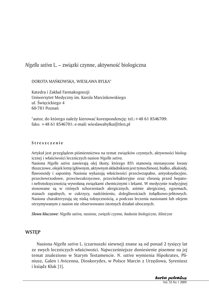 Nigella sativa L. – związki czynne, aktywność biologiczna DOROTA MAŃKOWSKA, WIESŁAWA BYLKA* Katedra i Zakład Farmakognozji Uniwersytet Medyczny im. Karola Marcinkowskiego ul. Święcickiego 4 60-781 Poznań *autor, do którego należy kierować korespondencję: tel.:+48 61 8546709: faks: +48 61 8546701: e-mail: [email protected] Streszczenie Artykuł jest przeglądem piśmiennictwa na temat związków czynnych, aktywności biologicznej i właściwości leczniczych nasion Nigella sativa. Nasiona Nigella sativa zawierają olej tłusty, którego 85% stanowią nienasycone kwasy tłuszczowe, olejek lotny (głównym, aktywnym składnikiem jest tymochinon), białko, alkaloidy, flawonoidy i saponiny. Nasiona wykazują właściwości przeciwzapalne, antyoksydacyjne, przeciwwrzodowe, przeciwcukrzycowe, przeciwbakteryjne oraz chronią przed hepatoi nefrotoksycznością wywołaną związkami chemicznymi i lekami. W medycynie tradycyjnej stosowane są w różnych schorzeniach alergicznych, astmie alergicznej, egzemach, stanach zapalnych, w cukrzycy, nadciśnieniu, dolegliwościach żołądkowo-jelitowych. Nasiona charakteryzują się niską toksycznością, a podczas leczenia nasionami lub olejem otrzymywanym z nasion nie obserwowano istotnych działań ubocznych. Słowa kluczowe: Nigella sativa, nasiona, związki czynne, badania biologiczne, kliniczne WSTĘP Nasiona Nigella sativa L. (czarnuszki siewnej) znane są od ponad 2 tysięcy lat ze swych leczniczych właściwości. Najwcześniejsze doniesienie pisemne na jej temat znaleziono w Starym Testamencie. N. sativa wymienia Hipokrates, Pliniusz, Galen i Avicenna, Dioskorydes, w Polsce Marcin z Urzędowa, Syreniusz i ksiądz Kluk [1]. Vol. 55 No 1 2009 D. Mańkowska, W. Bylka 110 Nazwa Nigella utworzona została przypuszczalnie ze względu na barwę nasion (łac. niger – czarny, nigellus – czarnuszek) [2]. Nazwy synonimiczne Nigella sativa L. to czarnuszka ogrodowa, czarnucha, kmin czarny, panna w zieleni, kąkolnica [1], nazwy angielskie Black Cumin (czarny kminek), Fennel Flower (kwiat kopru), Roman Coriander (kolendra rzymska) i Nutmeg Flower (kwiat gałki muszkatołowej) [3, 4]. W stanie naturalnym czarnuszka siewna występuje na obszarach suchych, w subtropikalnych i umiarkowanych strefach Eurazji i północnej Afryki, gdzie jest też uprawiana [5]. W Polsce uprawia się ją w południowej części kraju [6]. Tradycyjnie nasiona czarnuszki siewnej stosuje się w schorzeniach górnych dróg oddechowych (przeziębieniach, kaszlu, w nieżycie i zapaleniach oskrzeli, przy nawracających infekcjach), w terapii chorób autoimmunologicznych (toczeń, reumatyzm, alergie), w dolegliwościach trawiennych oraz u pacjentów z podwyższonym poziomem cukru we krwi, a także na źle gojące się rany, przy zmianach trądzikowych, w łuszczycy i grzybicach skóry. W lecznictwie stosuje się: zmielone nasiona (zwykle 2–5 g 2 razy dziennie), napar, odwar lub nalewkę przyrządzaną z nasion, a także olej (w dawce 500–1000 mg 2–3 razy dziennie), który otrzymywany jest przez tłoczenie nasion na zimno. Olej, zwany również złotem faraonów, ma barwę miodową do ciemnobrązowej, lekko gorzkawy smak i intensywnie korzenny zapach. Nasiona używane są też jako przyprawa, np. do chleba, mięs, przetworów warzywnych, jako namiastka pieprzu, szczególnie u osób wrażliwych, gdyż nie drażnią błony śluzowej żołądka [7]; również jako środek konserwujący [8], a ze względu na działanie ochronne przed promieniowaniem do produkcji kosmetyków [9]. CHARAKTERYSTYKA BOTANICZNA N. sativa jest rośliną jednoroczną zielną osiągającą do 20–40 cm wysokości, o sztywnej, prostej lub nieznacznie rozgałęziającej się łodydze. Ulistnienie jest skrętoległe, o delikatnych, jasnozielonych, podwójnie pierzastosiecznych liściach, osadzonych na bardzo krótkich ogonkach [10]. Kwiaty pojawiają się między czerwcem a wrześniem, mają podwójny okwiat podzielony na zewnętrzny okółek pięciu działek kielicha o długości 15–20 mm, przypominających płatki o barwie białej do bladobłękitnej z błękitnym unerwieniem i seledynowych szczytach oraz wewnętrzny, składający się z ośmiu działek korony o długości 7–8 mm, przekształconych w żółte, dwuwargowe miodniki wydzielające nektar [11]. Owoc składa się z 5–10 mieszków o długości 2–3 cm całkowicie zrośniętych ze sobą, które zawierają dojrzewające we wrześniu trójgraniaste nasiona o czarnej barwie, o początkowo gorzkim smaku, przechodzącym w ostry, korzenny, przypominający pieprz i zapachu zbliżonym do gałki muszkatołowej [10]. Korzeń rośliny jest palowy, o długości ok. 25 cm [4]. Nigella sativia L. – związki czynne, aktywność biologiczna 111 ZWIĄZKI CZYNNE NIGELLA SATIVA L. Alkaloidy Nasiona N. sativa zawierają alkaloidy diterpenowe: nigellaminę A1 – A5, B1, B2 i C [12], alkaloidy izochinolinowe (N-tlenek nigelliminy, zwany inaczej nigelliną oraz nigelliminę) [13], a także rzadkie w świecie roślinnym alkaloidy indazolowe: nigellidynę i jej 4-O-siarczan oraz nigellicynę [13-15]. Olejek eteryczny Olej tłusty obecny w nasionach zawiera 0,4–2,5% olejku eterycznego, w którego skład wchodzą: trans-anetol (38,3%), limonen (4,3%), p-cymen (14,8%), karwon (4,0%) [16], α-pinen, karwakrol, tymol, 4-terpineol, a także charakterystyczny tymochinon, tymohydrochinon, ditymochinon (ryc. 1) oraz prawdopodobnie polimer tymochinonu, opisany jako nigellon [3]. Zawartość tymochinonu w olejku otrzymanym przez destylację z parą wodną kształtuje się w granicach 24–25% [17]. a) b) c) O O O Rycina 1. a) Tymochinon, b) Tymohydrochinon, c) Ditymochinon Olej tłusty Nasiona zawierają 30%–50% oleju tłustego, w którego skład w około 85% wchodzą nienasycone kwasy tłuszczowe: linolowy (55,6%), oleinowy (23,4%) α-linolenowy (0,4–1%) oraz rzadki w przyrodzie eikozadienowy (2,6–3%), a także kwasy: oleomirystynowy, oleopalmitynowy, m