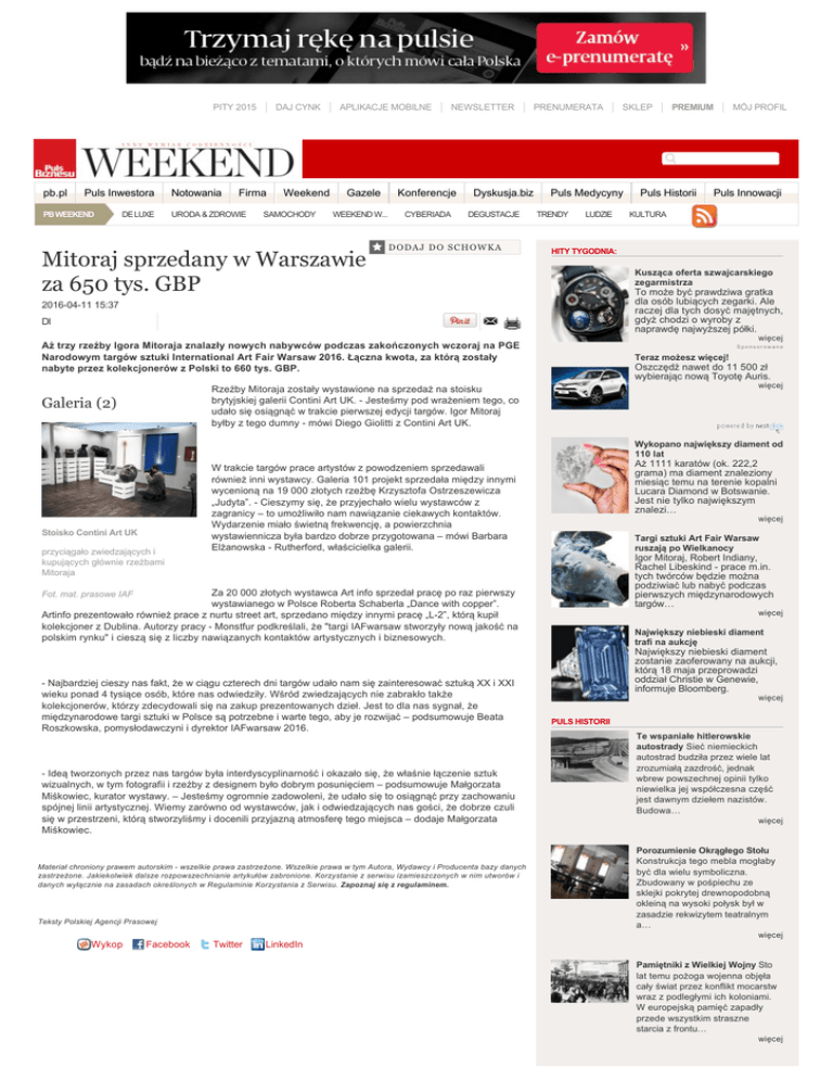 PITY 2015 pb.pl Puls Inwestora PB WEEKEND DE LUXE Notowania DAJ CYNK Firma URODA & ZDROWIE Weekend SAMOCHODY APLIKACJE MOBILNE Gazele WEEKEND W... Mitoraj sprzedany w Warszawie za 650 tys. GBP NEWSLETTER Konferencje CYBERIADA PRENUMERATA Dyskusja.biz DEGUSTACJE DODAJ DO SCHOWKA SKLEP Puls Medycyny TRENDY LUDZIE PREMIUM Puls Historii MÓJ PROFIL Puls Innowacji KULTURA HITY TYGODNIA: Kusząca oferta szwajcarskiego zegarmistrza To może być prawdziwa gratka dla osób lubiących zegarki. Ale raczej dla tych dosyć majętnych, gdyż chodzi o wyroby z naprawdę najwyższej półki. 2016-04-11 15:37 DI więcej Aż trzy rzeźby Igora Mitoraja znalazły nowych nabywców podczas zakończonych wczoraj na PGE Narodowym targów sztuki International Art Fair Warsaw 2016. Łączna kwota, za którą zostały nabyte przez kolekcjonerów z Polski to 660 tys. GBP. Sponsorowane Teraz możesz więcej! Oszczędź nawet do 11 500 zł wybierając nową Toyotę Auris. więcej Rzeźby Mitoraja zostały wystawione na sprzedaż na stoisku brytyjskiej galerii Contini Art UK. - Jesteśmy pod wrażeniem tego, co udało się osiągnąć w trakcie pierwszej edycji targów. Igor Mitoraj byłby z tego dumny - mówi Diego Giolitti z Contini Art UK. Galeria (2) Wykopano największy diament od 110 lat Stoisko Contini Art UK przyciągało zwiedzających i kupujących głównie rzeźbami Mitoraja Aż 1111 karatów (ok. 222,2 grama) ma diament znaleziony miesiąc temu na terenie kopalni Lucara Diamond w Botswanie. Jest nie tylko największym znalezi… W trakcie targów prace artystów z powodzeniem sprzedawali również inni wystawcy. Galeria 101 projekt sprzedała między innymi wycenioną na 19 000 złotych rzeźbę Krzysztofa Ostrzeszewicza „Judyta”. - Cieszymy się, że przyjechało wielu wystawców z zagranicy – to umożliwiło nam nawiązanie ciekawych kontaktów. Wydarzenie miało świetną frekwencję, a powierzchnia wystawiennicza była bardzo dobrze przygotowana – mówi Barbara Elżanowska - Rutherford, właścicielka galerii. więcej Targi sztuki Art Fair Warsaw ruszają po Wielkanocy Igor Mitoraj, Robert Indiany, Rachel Libeskind - prace m.in. tych twórców będzie można podziwiać lub nabyć podczas pierwszych międzynarodowych targów… Za 20 000 złotych wystawca Art info sprzedał pracę po raz pierwszy wystawianego w Polsce Roberta Schaberla „Dance with copper”. Artinfo prezentowało również prace z nurtu street art, sprzedano między innymi pracę „L-2”, którą kupił kolekcjoner z Dublina. Autorzy pracy - Monstfur podkreślali, że "targi IAFwarsaw stworzyły nową jakość na polskim rynku" i cieszą się z liczby nawiązanych kontaktów artystycznych i biznesowych. Fot. mat. prasowe IAF - Najbardziej cieszy nas fakt, że w ciągu czterech dni targów udało nam się zainteresować sztuką XX i XXI wieku ponad 4 tysiące osób, które nas odwiedziły. Wśród zwiedzających nie zabrakło także kolekcjonerów, którzy zdecydowali się na zakup prezentowanych dzieł. Jest to dla nas sygnał, że międzynarodowe targi sztuki w Polsce są potrzebne i warte tego, aby je rozwijać – podsumowuje Beata Roszkowska, pomysłodawczyni i dyrektor IAFwarsaw 2016. - Ideą tworzonych przez nas targów była interdyscyplinarność i okazało się, że właśnie łączenie sztuk wizualnych, w tym fotografii i rzeźby z designem było dobrym posunięciem – podsumowuje Małgorzata Miśkowiec, kurator wystawy. – Jesteśmy ogromnie zadowoleni, że udało się to osiągnąć przy zachowaniu spójnej linii artystycznej. Wiemy zarówno od wystawców, jak i odwiedzających nas gości, że dobrze czuli się w przestrzeni, którą stworzyliśmy i docenili przyjazną atmosferę tego miejsca – dodaje Małgorzata Miśkowiec. więcej Największy niebieski diament trafi na aukcję Największy niebieski diament zostanie zaoferowany na aukcji, którą 18 maja przeprowadzi oddział Christie w Genewie, informuje Bloomberg. więcej PULS HISTORII Te wspaniałe hitlerowskie autostrady Sieć niemieckich autostrad budziła przez wiele lat zrozumiałą zazdrość, jednak wbrew powszechnej opinii tylko niewielka jej współczesna część jest dawnym dziełem nazistów. Budowa… więcej Materiał chroniony prawem autorskim - wszelkie prawa zastrzeżone. Wszelkie prawa w tym Autora, Wydawcy i Producenta bazy danych zastrzeżone. Jakiekolwiek dalsze rozpowszechnianie artykułów zabronione. Korzystanie z serwisu izamieszczonych w nim utworów i danych wyłącznie na zasadach określonych w Regulaminie Korzystania z Serwisu. Zapoznaj się z regulaminem. Teksty Polskiej Agencji Prasowej Porozumienie Okrągłego Stołu Konstrukcja tego mebla mogłaby być dla wielu symboliczna. Zbudowany w pośpiechu ze sklejki pokrytej drewnopodobną okleiną na wysoki połysk był w zasadzie rekwizytem teatralnym a… więcej Wykop Facebook Twitter LinkedIn Pamiętniki z Wielkiej Wojny Sto lat temu pożoga wojenna objęła cały świat przez konflikt mocarstw wraz z podległymi ich koloniami. W europejską pamięć zapadły przede wszystkim straszne starcia z frontu… więcej MATERIAŁ PARTNERA Warszawski high-street na celowniku światowych marek Komentarze NA ZDROWIE 5 idealnych posiłków przed pracą Śniadanie to podobno najważniejszy posiłek w ciągu dania. Ale co najlepiej wrzucić ząb przed wyjściem z domu, żeby zapewnić sobie energię na dobry początek? Amerykański portal… więcej CZYTAJ TAKŻE Nowojorski apartament Pavarottiego szuka nowego właściciela Nowojorski apartament Luciano Pavarottiego przy Central Parku został połączony z sąsiadującym mieszkaniem i teraz, a powstałą nieruchomość można teraz kupić za 20,5 mln USD, podaje Bloomberg. więcej Epidemia otyłości: jak ją zatrzymać? Według Ministerstwa Zdrowia, żeby zmienić błędne nawyki żywieniowe niezbędne są kompleksowe interwencje, a przekształcenia muszą być stymulowane nie tylko ograniczeniami, ale także… Niemcy kończą z monop