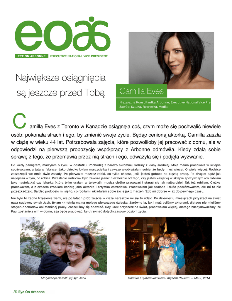 E Y E O N AR B ON N E EXECUTIVE NATIONAL VICE PRESIDENT Największe osiągnięcia są jeszcze przed Tobą Camilla Eves Niezależna Konsultantka Arbonne, Executive National Vice President Zawód: Sztuka, Rozrywka, Media C amilla Eves z Toronto w Kanadzie osiągnęła coś, czym może się pochwalić niewiele osób: pokonała strach i ego, by zmienić swoje życie. Będąc cenioną aktorką, Camilla zaszła w ciążę w wieku 44 lat. Potrzebowała zajęcia, które pozwoliłoby jej pracować z domu, ale w odpowiedzi na pierwszą propozycję współpracy z Arbonne odmówiła. Kiedy zdała sobie sprawę z tego, że przemawia przez nią strach i ego, odważyła się i podjęła wyzwanie. Od kiedy pamiętam, marzyłam o życiu w dostatku. Pochodzę z bardzo skromnej rodziny z klasy średniej. Moja mama pracowała w sklepie spożywczym, a tata w fabryce. Jako dziecko byłam marzycielką i zawsze wyobrażałam sobie, że będę mieć więcej. O wiele więcej. Rodzice zaszczepili we mnie dwie zasady. Po pierwsze: możesz robić, co tylko chcesz, jeśli jesteś gotowa na ciężką pracę. Po drugie: bądź jak najlepsza w tym, co robisz. Przesłanie rodziców było zawsze jasne: niezależnie od tego, czy jesteś kasjerką w sklepie spożywczym (co robiłam jako nastolatka) czy lekarką (którą tylko grałam w telewizji), musisz ciężko pracować i starać się jak najbardziej. Tak też robiłam. Ciężko pracowałam, a z czasem zrobiłam karierę jako aktorka i artystka estradowa. Pracowałam jak szalona i dużo podróżowałam, ale mi to nie przeszkadzało. Bardzo podobało mi się to, co robiłam i układałam sobie życie jak z marzeń. Szło mi dobrze — aż do pewnego czasu. Nie było to żadne trzęsienie ziemi, ale po latach prób zajścia w ciążę nareszcie mi się to udało. Po dziewięciu miesiącach przyszedł na świat nasz cudowny synek Jack. Byłam 44-letnią mamą mojego pierwszego dziecka. Zarówno ja, jak i mąż byliśmy aktorami, dlatego nie mieliśmy stałych dochodów ani stabilnej pracy. Zaczęliśmy się obawiać. Gdy Jack przyszedł na świat, pracowałam więcej, dlatego zdecydowaliśmy, że Paul zostanie z nim w domu, a ja będę pracować, by utrzymać dotychczasowy poziom życia. Motywacja Camilli: jej syn Jack. Camilla z synem Jackiem i mężem Paulem — Maui, 2014. Nagle kariera, o której marzyłam i nad którą ciężko pracowałam, przestała być tak atrakcyjna. Zaczęła mi wręcz przeszkadzać jako matce i czułam się z tym źle. Nie miałam jednak wyboru, a przynajmniej tak mi się wydawało. Nie miałam planu awaryjnego — nigdy nie myślałam, że będzie mi potrzebny. Aktorstwo zawsze było trudną karierą i byłam przekonana, że plan awaryjny byłby zbyt kuszący. Uznałam, że jeśli chcę odnosić sukcesy, to nie mogę mieć alternatywy. Teraz wiem, że to nie było rozsądne. Ale miałam Jacka i brakowało mi wszystkich tych cudownych przeżyć związanych z małym dzieckiem. Nie chciałam rezygnować z kariery, ale STRATEGIA SUKCESU „Wybierz wielkość!” potrzebowałam swobody wyboru w zależności od potrzeb mojej rodziny, a nie ze względu na spłatę kredytu. Nie szukałam innego zawodu. Całe życie byłam aktorką i nie sądziłam, że potrafię robić coś innego. Kiedy moja przyjaciółka i też aktorka Amy Sky pokazała mi Arbonne, pomyślałam dwie rzeczy. Po pierwsze, że w jej życiu musiała nastąpić jakaś tragedia, skoro wzięła się za taki biznes. A po drugie, poczułam się obrażona jej przypuszczeniem, że rozważę tę propozycję. Powiedziałam jej dobitnie, że to nie dla mnie. Nie wyobrażałam sobie siebie w takiej roli. Nie powiedziałam jej jednak, że moim zdaniem jej odbiło i musiała popaść w kłopoty finansowe. Jakże się myliłam! Niechętnie zgodziłam się wypróbować te produkty. Była zdziwiona tym, że razu bardzo mi się spodobały. Miałam zawsze bardzo suchą i wrażliwą skórę. Nie przypuszczałam nawet, że to przez produkty, których używałam. Nagle moja skóra nabrała blasku i stała się nawilżona. Natychmiast kupiłam produkty od Amy, ale jeśli chodzi o możliwości biznesowe, to byłaby Rodzinny wyjazd do Włoch z najlepszymi przyjaciółkami: ENVP Suzanne Van Parys, ENVP Tabatha DeBruyn i Claire Van Parys. przesada. Mój cudowny mąż przypomniał mi jednak, że ograniczony kontakt z Jackiem bardzo źle na mnie wpływa, a Amy zawsze miała głowę do biznesu. To jedna z najsprytniejszych osób, jakie znamy. Decydującym argumentem, jaki przytoczył mąż, było to, że uważa mnie za niezwykłą osobę, która zawsze powinna żyć nadzwyczajnie i nigdy nie poddawać się lękom ani ego. Być może to działalność w Arbonne była potrzebna do spełnienia się tej przepowiedni. Zdecydowałam się wejść w to i nie oglądać za siebie. Na szczycie Smoczego Grzbietu w Hongkongu: wycieczka NVP Challenge do Azji. Zanim dołączyłam do Arbonne, Amy zapytała mnie: „Gdzie będziesz za pięć lat, jeśli nadal będziesz robić to, co robisz dzisiaj? Pięć lat mija błyskawicznie, z Arbonne czy bez”. Nagle, choć obawiałam się dołączyć do Arbonne, bardziej zaczęłam się bać, co będzie, jeśli nie dołączę. I rzeczywiście pięć lat minęło w mgnieniu oka. Teraz jestem ENVP ze strukturą szeroką na cztery poziomy. Oznacza to, że mam bezpośrednio pod sobą w strukturze cztery piękne NVP. Arbonne to nie jest pomysł na szybki zarobek. To praca wymagająca od nas wszystkich dużego wysiłku. Jest to jednak też praca, którą mogę pogodzić z życiem osobistym. Praca, o której myślę z przyjemnością codziennie rano. Moja rodzina żyje teraz w dostatku. Mój mąż przeszedł częściowo na emeryturę i zajmuje się tym, co go pasjonuje. Oboje pracujemy w domu i jesteśmy całkowicie obecni w życiu synka. Możemy wspierać swoich bliskich i podróżować po świecie. Wszystko to dzięki temu, że pomagam innym ludziom, sprzedając niesamowite produkty Arbonne i of