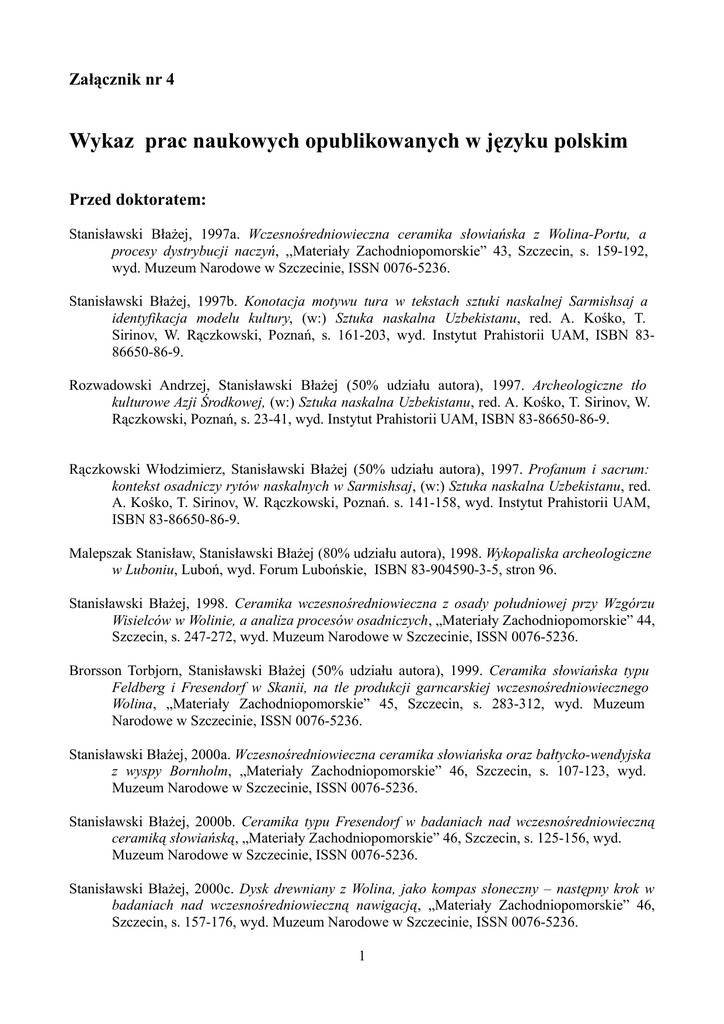 Załącznik nr 4 Wykaz prac naukowych opublikowanych w języku polskim Przed doktoratem: Stanisławski Błażej, 1997a. Wczesnośredniowieczna ceramika słowiańska z Wolina-Portu, a procesy dystrybucji naczyń, ,,Materiały Zachodniopomorskie” 43, Szczecin, s. 159-192, wyd. Muzeum Narodowe w Szczecinie, ISSN 0076-5236. Stanisławski Błażej, 1997b. Konotacja motywu tura w tekstach sztuki naskalnej Sarmishsaj a identyfikacja modelu kultury, (w:) Sztuka naskalna Uzbekistanu, red. A. Kośko, T. Sirinov, W. Rączkowski, Poznań, s. 161-203, wyd. Instytut Prahistorii UAM, ISBN 8386650-86-9. Rozwadowski Andrzej, Stanisławski Błażej (50% udziału autora), 1997. Archeologiczne tło kulturowe Azji Środkowej, (w:) Sztuka naskalna Uzbekistanu, red. A. Kośko, T. Sirinov, W. Rączkowski, Poznań, s. 23-41, wyd. Instytut Prahistorii UAM, ISBN 83-86650-86-9. Rączkowski Włodzimierz, Stanisławski Błażej (50% udziału autora), 1997. Profanum i sacrum: kontekst osadniczy rytów naskalnych w Sarmishsaj, (w:) Sztuka naskalna Uzbekistanu, red. A. Kośko, T. Sirinov, W. Rączkowski, Poznań. s. 141-158, wyd. Instytut Prahistorii UAM, ISBN 83-86650-86-9. Malepszak Stanisław, Stanisławski Błażej (80% udziału autora), 1998. Wykopaliska archeologiczne w Luboniu, Luboń, wyd. Forum Lubońskie, ISBN 83-904590-3-5, stron 96. Stanisławski Błażej, 1998. Ceramika wczesnośredniowieczna z osady południowej przy Wzgórzu Wisielców w Wolinie, a analiza procesów osadniczych, „Materiały Zachodniopomorskie” 44, Szczecin, s. 247-272, wyd. Muzeum Narodowe w Szczecinie, ISSN 0076-5236. Brorsson Torbjorn, Stanisławski Błażej (50% udziału autora), 1999. Ceramika słowiańska typu Feldberg i Fresendorf w Skanii, na tle produkcji garncarskiej wczesnośredniowiecznego Wolina, „Materiały Zachodniopomorskie” 45, Szczecin, s. 283-312, wyd. Muzeum Narodowe w Szczecinie, ISSN 0076-5236. Stanisławski Błażej, 2000a. Wczesnośredniowieczna ceramika słowiańska oraz bałtycko-wendyjska z wyspy Bornholm, „Materiały Zachodniopomorskie” 46, Szczecin, s. 107-123, wyd. Muzeum Narodowe w Szczecinie, ISSN 0076-5236. Stanisławski Błażej, 2000b. Ceramika typu Fresendorf w badaniach nad wczesnośredniowieczną ceramiką słowiańską, „Materiały Zachodniopomorskie” 46, Szczecin, s. 125-156, wyd. Muzeum Narodowe w Szczecinie, ISSN 0076-5236. Stanisławski Błażej, 2000c. Dysk drewniany z Wolina, jako kompas słoneczny – następny krok w badaniach nad wczesnośredniowieczną nawigacją, „Materiały Zachodniopomorskie” 46, Szczecin, s. 157-176, wyd. Muzeum Narodowe w Szczecinie, ISSN 0076-5236. 1 Stanisławski Błażej, 2000d. Wildschweinkiefer mit Pfeilspitze, Zwei Messergriffe, Gefäss mit Deckel, Gussform, Hundenkopfanhänger, Skandinavischer Kamm, Thorshammer, Anhänger in Form eines Stiefels, Kiewer Ei, Runenholz, Swantevit-Figur, Köpfchen einer Gottheit, Pferdfigur, (w:) Europas Mitte um 100. Katalog, red. A. Wieczorek, H.M. Hinz, Stuttgart, s. 68, 77, 80-81, 92, 97, 100, 116, 133, 138-139, wyd. Konrad Theiss Verlag GmbH, ISBN 38062-1544-8. Stanisławski Błażej, 2002. The wooden disc from Wolin – as the next Sun-compass?, “Viking Heritage Magazine” 2/02, Visby, s. 10-11, wyd. Centre for Baltic Studies Gotland University, ISSN 1403-7319. Stanisławski Błażej, 2003a. Wyroby ze steatytu z wczesnośredniowiecznego Wolina, (w:) RES ET FONTES, red. T. Galiński, E. Wilgocki, Szczecin, s. 171-179, wyd. Muzeum Narodowe w Szczecinie oraz Stowarzyszenie Naukowe Archeologów Polskich, ISBN 83-86136-23-0. Stanisławski Błażej, 2003b. The Mammen style from West Pomerania (Wolin and Kamień Pomorski), “Viking Heritage Magazine” 3/03, Visby, s. 3-5, wyd. Centre for Baltic Studies Gotland University, ISSN 1403-7319. Stanisławski Błażej, 2003c. Diet and tableware in Wolin, “Viking Heritage Magazine” 4/03, Visby, s. 25-27, wyd. Centre for Baltic Studies Gotland University, ISSN 1403-7319. Filipowiak Władysław, Stanisławski Błażej (50% udziału autora), 2003. Dendrochronologia w badaniach archeologicznych wczesnośredniowiecznego Wolina, [w:] Polska Akademia Nauk Działalność Naukowa Wybrane Zagadnienia 16, Warszawa, s. 28-30, wyd. Polska Akademia Nauk, ISSN 1233-4545. Po doktoracie: Autorstwo książek: Stanisławski Błażej, 2012. Garncarstwo wczesnośredniowiecznego Wolina, Wrocław, wyd. Instytut Archeologii i Etnologii PAN, ISBN 978-83-89499-86-8, stron 254. Stanisławski Błażej, 2013. Jómswikingowie z Wolina-Jómsborga – studium archeologiczne przenikania kultury skandynawskiej na ziemie polskie, Wrocław wyd. Instytut Archeologii i Etnologii PAN, ISBN 978-83-63760-11-3, stron 355. Redakcja naukowa książek: Stanisławski Błażej (99% udziału autora), Władysław Filipowiak (udział symboliczny) 2013. Wolin wczesnośredniowieczny część 1, seria „Origines Polonorum" t. VI, red. serii P. Urbańczyk, Warszawa, wyd. Fundacja na rzecz Nauki Polskiej, Wydawnictwo "TRIO", Instytut Archeologii i Etnologii PAN, ISBN 978-83-7436-312-9, stron 370. Stanisławski Błażej (99% udziału autora), Władysław Filipowiak (udział symboliczny) 2014. Wolin wczesnośredniowieczny część 2, seria „Origines Polonorum" t. VII, red. serii P. Urbańczyk, Warszawa, wyd. Fundacja na rzecz Nauki Polskiej, Wydawnictwo "TRIO", Instytut Archeologii i Etnologii Polskiej Akademii Nauk, ISBN 978-83-7436-249-8, stron 449. 2 Moździoch Sławomir, Stanisławski Błażej (70% udział autora), Wiszewski Przemysław, 2013. Scandinavian Culture in Medieval Poland, seria Interdisciplinary Medieval Studies, t. 2, red. serii S. Moździoch, P. Wiszewski, Wrocław, wyd. Instytut Archeologii i Etnologii PAN, Instytut Historyczny Uniwersyetu Wrocławskiego, ISBN 978-83-63760- 04-5, stron 478. Autorstwo rozdziałów w pracach zbiorowych: Stanisławski Błażej, 2013a. Wstęp do archeologii wczesnośredniowiecznego Wolina, (w:) Wolin wczesnośredniowieczny 1, red. B. Stanisławski, W. Filipowiak, Orig
