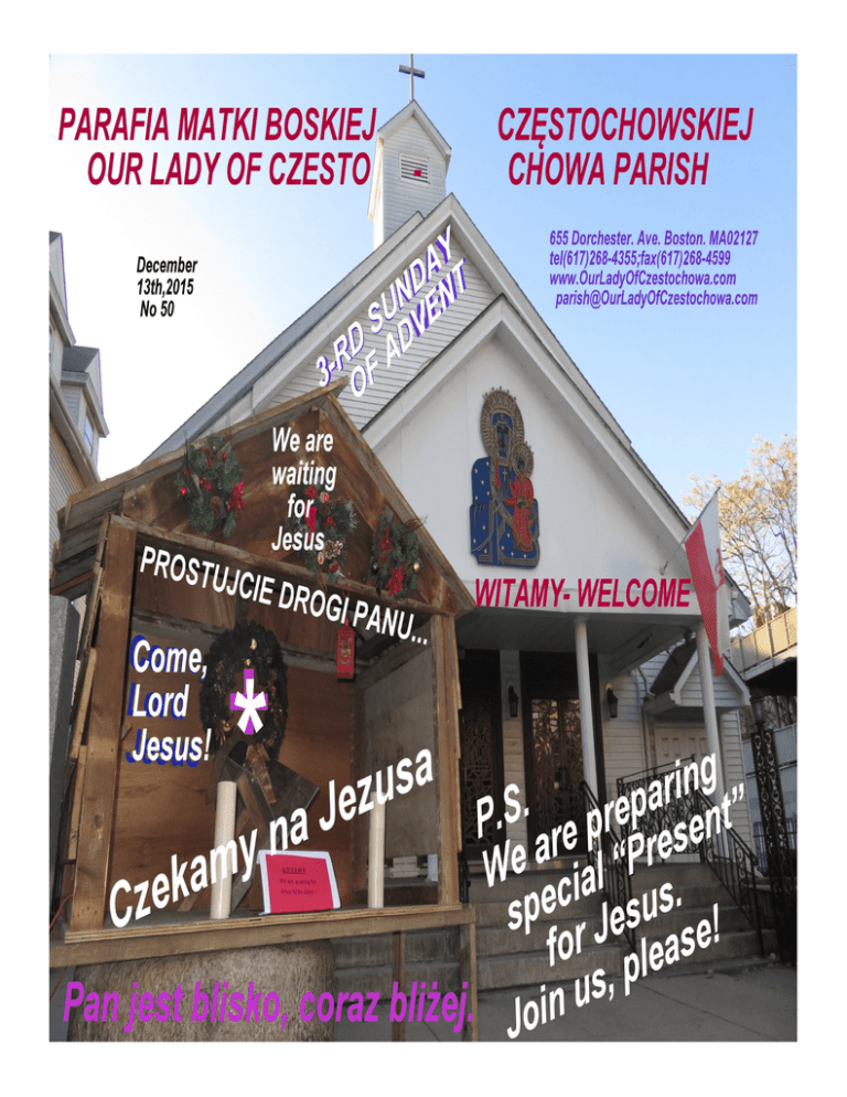 BIURO PARAFIALNE / PARISH OFFICE Tel: 617-268-4355; Fax: 617-268-4599 Monday - Friday - 8:00 am - 2:00 pm Saturday: 10:00 am - 12:00 pm Evenings and weekends - by appointment only. PORZĄDEK MSZY ŚWIĘTYCH MASS SCHEDULE Mon. - Wed. 7:00 am (English); 8:00 am (Polish) Thursday 7:00 am (English) 7:00 pm (Polish) Friday 7:00 am (English) 6:00 pm - 7:00 pm - Adoracja Najśw. Sakr. - Koronka Spowiedź - Adoration, Divine Mercy Chaplet, Confession 7:00 pm (Polish) Saturday 8:00 am (Polish) 4:00 pm (English) 7:00 pm (Polish) Sunday 8:00 am (Polish) 9:30 am (English) 11:00 am (Polish) Holydays - as announced SPOWIEDŹ / CONFESSIONS Friday 6:00 pm and every day 30 min. before Masses. CHRZEST / BAPTISM By arrangement with the priest. Instruction for parents and godparents is required. SAKRAMENT MAŁŻEŃSTWA / MARRIAGE Please, make arrangement with the parish office at least six months in advance. Instruction is required. SAKRAMENT CHORYCH/SACRAMENT OF THE SICK Parishioners who are seriously ill should call the office to arrange for a priest to visit and administer the Sacraments. ŻYCIE JEST DAREM OD BOGA Jeżeli odkryłaś, że pod Twym sercem poczęło się życie, przyjdź do nas sama lub z najbliższą osobą i podziel się tą wspaniałą nowiną. Będziemy Ci błogosławić, a jeśli trzeba - służyć pomocą. Nie lękaj się! - Ojcowie franciszkanie Misją Parafii Matki Bożej Częstochowskiej jest dawanie świadectwa wiary rzymsko-katolickiej i polskiego dziedzictwa. Ofiarnie i nieustannie służymy Bogu i sobie nawzajem zachowując i dzieląc się naszymi polskimi tradycjami w otwarciu się na wszystkich ludzi. Parafię obsługują Ojcowie Franciszkanie. The mission of the Parish of Our Lady of Czestochowa is to bear witness to our Roman Catholic faith and our Polish heritage. We strive to continue to serve God and each other, celebrating and sharing our Polish traditions, welcoming and reaching out to all people. The parish is served by Conventual Franciscan Friars. PASTORAL STAFF - FRANCISCAN FRIARS OJCOWIE FRANCISZKANIE (OFM Conv.) Fr. Jerzy Żebrowski OFMConv. - pastor Fr. Józef Brzozowski OFMConv. - guardian & parochial vicar Fr. Aloysius Minyong Hong OFMConv. - in residence KATECHECI / CATECHISTS Diakon Wojciech Morański - bierzmowanie; Katarzyna Chludzińska - kl. 0; Elżbieta Sokołowska - kl. 1; O. Jerzy Żebrowski - kl. 2; Zofia Fiedorczyk - kl. 3; Monika Danek - kl. 4 i 5; Piotr Goszczynski - kl. 6; Danuta Daniels - kl. 6; Eugeniusz Bramowski - kl. 7; Alicja Szewczyk, Beata Kozak, Małgorzata Sokołowska, Urszula Boryczka, Danuta Surowiec-Ramos - zastępstwa Iwona Gajczak - koordynatorka PRACOWNICY PARAFII / OFFICE STAFF Secretary & Religious Education Coordinator - Mrs. Iwona Gajczak Bookkeeper & Office Assistant - Ms. Connie Bielawski SŁUŻBA MUZYCZNA / MUSIC MINISTRY Organist & Psalmist: Mrs. Marta Saletnik ZAKRYSTIA/SACRISTAN – KWIATY/FLOWERS Mrs. Beata Kozak & Mrs. Renata Marshall LIFE IS A GIFT FROM GOD If you discovered that a new life began under your heart, come to us alone or with someone you love, and share this wonderful news. We will bless you, and - if necessary - offer you help. Do not be afraid! - Franciscan Fathers ACTIVITIES & ORGANIZATIONS Sala św. Jana Pawła II — St. John Paul II Hall Kontakt w sprawie wynajmu sali: tel: 617-268-4355 W sprawie sprzętu audio-wizualnego tel. 617-922-3691 Contact for renting the hall: tel: 617-268-4355 For audio-visual equipment tel. 617-922-3691 (Mariusz) Ministranci / Altar Servers - Eugeniusz Bramowski Spotkania w pierwsze niedziele miesiąca w sali świętego Jana Pawła II o godz. 10:00 am (781-871-2991) Fundacja Kultury Polskiej - Polish Cultural Foundation, Inc. - Mr. Andrzej Pronczuk - tel. 617-859-9910 Polska Szkoła Sobotnia - Polish Saturday School - Mr. Jan Kozak - tel. 617-464-2485 Chór Parafialny i Chórek Dziecięcy Promyki św. Jana Pawła II - Parish Choir & Children Choir - Mrs. Marta Saletnik, tel. kom. 857-212-7962 Stowarzyszenie Weteranów Armii Polskiej - SWAP #37 Mr. Wincenty Wiktorowski - tel. 617-288-1649 Grupa AA - Stanisław, tel. 508 283 4262 Sala pod kościołem. 2 Spotkania odbywają się w każdy czwartek o godz. 7:00 pm Krakowiak - Wednesdays at 7:30 pm - St. John Paul II hall www.krakowiak.org,: Eric Pierce: Tel. 508-320-2344 Żywy Różaniec / Rosary Society - Mrs. Genowefa Lisek tel. 617-436-5779 Siostry Matki Bożej Miłosierdzia Sisters of Our Lady of Mercy: tel. 617-288-1202 Polski Amatorski Teatr w Bostonie / Polish Theater - Mrs. Małgorzata Tutko: tel. 617-325-2208 Harcerze / Polish Scouts - The meetings will be conducted in Polish for young boys and girls. Contact information: Mateusz Wozny, tel. 347-749-5867, email: [email protected] Klub Polski Polish American Citizens Club - Mr. Christopher Lisek Club: 617-436-2786; Cell: 617-436-2686 MASS INTENTIONS - INTENCJE MSZALNE What Do We Do? The people in today's Gospel are "filled with expectation." They believe John the Baptist might be the Messiah they've been waiting for. Three times we hear their question: "What then should we do?" The Messiah's coming requires every man and woman to choose - to "repent" or not. That's John's message and it will be Jesus' too (see Luke 3:3; 5:32; 24:47). "Repentance" translates a Greek word, metanoia (literally, "change of mind"). In the Scriptures, repentance is presented as a two-fold "turning" away from sin (see Ezekiel 3:19; 18:30) and toward God (see Sirach 17:20-21; Hosea 6:1). This "turning" is more than attitude adjustment. It means a radical life-change. It requires "good fruits as evidence of your repentance" (see Luke 3:8). That's why John tells the crowds, soldiers and tax collectors they must prove their faith through works of charity, honesty and social justice. In today's Liturgy, each of us is being called to stand in that crowd and hear the "good news" of John's call to repentance. We should examine our lives, ask from our hearts as they did: "What should we do?" Our repen