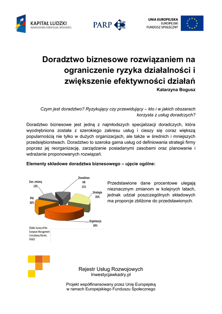 Doradztwo biznesowe rozwiązaniem na ograniczenie ryzyka działalności i zwiększenie efektywności działań Katarzyna Bogusz Czym jest doradztwo? Ryzykujący czy przewidujący – kto i w jakich obszarach korzysta z usług doradczych? Doradztwo biznesowe jest jedną z najmłodszych specjalizacji doradczych, która wyodrębniona została z szerokiego zakresu usług i cieszy się coraz większą popularnością nie tylko w dużych organizacjach, ale także w średnich i mniejszych przedsiębiorstwach. Doradztwo to szeroka gama usług od definiowania strategii firmy poprzez jej reorganizację, zarządzanie posiadanymi zasobami oraz planowanie i wdrażanie proponowanych rozwiązań. Elementy składowe doradztwa biznesowego – ujęcie ogólne: Przedstawione dane procentowe ulegają nieznacznym zmianom w kolejnych latach, jednak udział poszczególnych składowych ma proporcje zbliżone do przedstawionych. Rejestr Usług Rozwojowych Inwestycjawkadry.pl Projekt współfinansowany przez Unię Europejską w ramach Europejskiego Funduszu Społecznego Ostatnie lata to nieustanne doskonalenie oraz rozszerzanie zakresu oferowanych usług ze szczególnym uwzględnieniem usług marketingowych i informatycznych a także zmieniających się uwarunkowań kulturowych. Dzisiaj rynek konsultingowy, podobnie jak większość obszarów naszego życia jest konkurencyjnym rynkiem globalnym, który tworzą duże firmy międzynarodowe, konsultanci indywidualni oraz małe firmy zatrudniające do 10 wyspecjalizowanych doradców. Każdy znajdzie więc ofertę na miarę swoich oczekiwań i możliwości. W ciągu ostatnich lat zmienia się też forma współpracy z doradcami, którzy dzisiaj coraz częściej pełnią funkcję swego rodzaju pracowników tymczasowych. Przecieranie szlaku czy wyważanie otwartych drzwi? Czy sprawnemu menedżerowi potrzebna jest pomoc? Kiedy warto szukać wsparcia dla biznesu? Czego można oczekiwać od partnera zmiany? Wsparcie w zakresie opracowania analizy potrzeb rozwojowych i planów rozwoju dla mikro, małych i średnich przedsiębiorców zostało przewidziane w ramach działania 2.2 Wsparcie na rzecz zarządzania strategicznego przedsiębiorstw oraz budowy przewagi konkurencyjnej na rynku. Szczegółów szukaj na stronie www.parp.gov.pl lub zapytaj naszych konsultantów: 22 432 89 91, 22 432 89 92, 22 432 89 93 oraz 0 801 33 22 02* * koszt połączenia jak za połączenie lokalne Bez względu na rodzaj kapitału założycielskiego danego przedsiębiorstwa, decyzje dotyczące bieżącego zarządzania podejmuje zwykle zarząd. Jedną z najważniejszych decyzji (o ile nie najważniejszą) z zakresu kierowania organizacją jest nakreślenie wspólnej wizji przyszłości. Dzisiaj trudno sobie wyobrazić osiągnięcie przez firmę sukcesu bez posiadania określonych celów, misji, systemu wartości wspólnych dla wszystkich działów i pracowników. To bez wątpienia podstawowe, bazowe czynniki powodzenia i rozwoju. Jednocześnie nadal dość często wspólne wizje opierają się na charyzmie lidera, albo też powstają na skutek sytuacji Rejestr Usług Rozwojowych Inwestycjawkadry.pl Projekt współfinansowany przez Unię Europejską w ramach Europejskiego Funduszu Społecznego kryzysowych, kiedy wszyscy jednoczą się wokół zdiagnozowanego właśnie zagrożenia, które w dłuższej lub krótszej perspektywie godzi w interesy wszystkich grup pracowników. Jednak nie na takich przyczynach zaangażowania i nie na chwilowej współpracy, czy raczej subordynacji zależy pracodawcom. Najbardziej efektywne zaangażowanie wynika z postawy każdego pracownika indywidualnie i jest budowane przez wspólną wizję przyszłości i przedstawienie jej w formie zbioru zasad i praktycznych wskazówek zastosowania. Skuteczni liderzy zrozumieją tę prawidłowość, dlatego starają się budować w swoich organizacjach wspólne obrazy przyszłości, przedstawiają wizję i cele do realizacji. Jeżeli potrzebują wsparcia w tym zakresie korzystają z usług firm doradczych, tym samym zwiększają szanse powodzenia projektu, zakres wykorzystywanej wiedzy oraz dzielą się odpowiedzialnością. Sprawny strateg, świetny zarządca i organizator nie musi jednakowo dobrze radzić sobie w każdym obszarze działalności firmy. Na podstawie wieloletniej praktyki w tym zakresie pozwolę sobie na stwierdzenie, że często świetnym przywódcom i wybitnym strategom łatwiej dostrzec i antycypować skutki zewnętrznych zagrożeń rynkowych, niż zarzewia konfliktów czy zagrożenia wewnętrzne. Czym innym jest bowiem tworzenie wizji, nadzór finansowy, bieżąca kontrola, rozumienie i docenianie każdego segmentu działalności, czy określanie celów biznesowych dla każdego z nich, czym innym zaś umiejętność sprawnego, merytorycznego zarządzania każdym działem, każdą grupą wiekową pracowników, diagnozowanie zagrożeń wewnętrznych dzień po dniu, przy jednoczesnym zapewnieniu pełnej, zintegrowanej komunikacji uwzględniającej różnorodność potrzeb i możliwości zainteresowanych odbiorców. Tym bardziej, że należy uwzględnić pełną listę zasobów, jakimi dysponuje organizacja. Zwykle wyróżnia się 4 główne zasoby przedsiębiorstwa, jednak w ostatnim czasie wraz z wiedzą dotyczącą środowiska sprzyjającego rozwojowi i wprowadzanym zmianom, bez wahania dołączamy na stałe piąty element – kulturę organizacyjną, która jest swego rodzaju gwarantem udanych realizacji oraz nieocenioną mocą każdej zdrowej organizacji. Rejestr Usług Rozwojowych Inwestycjawkadry.pl Projekt współfinansowany przez Unię Europejską w ramach Europejskiego Funduszu Społecznego Świadome budowanie kultury organizacyjnej, jej obiektywna ocena stworzona na podstawie badania opinii pracowników, określenie mocnych stron i punktów do poprawy, a także wyznaczenie kierunków działania stanowią dużą siłę każdej organizacji. Ta niepozorna wartość, budowana niejako „przy okazji” wykonywa