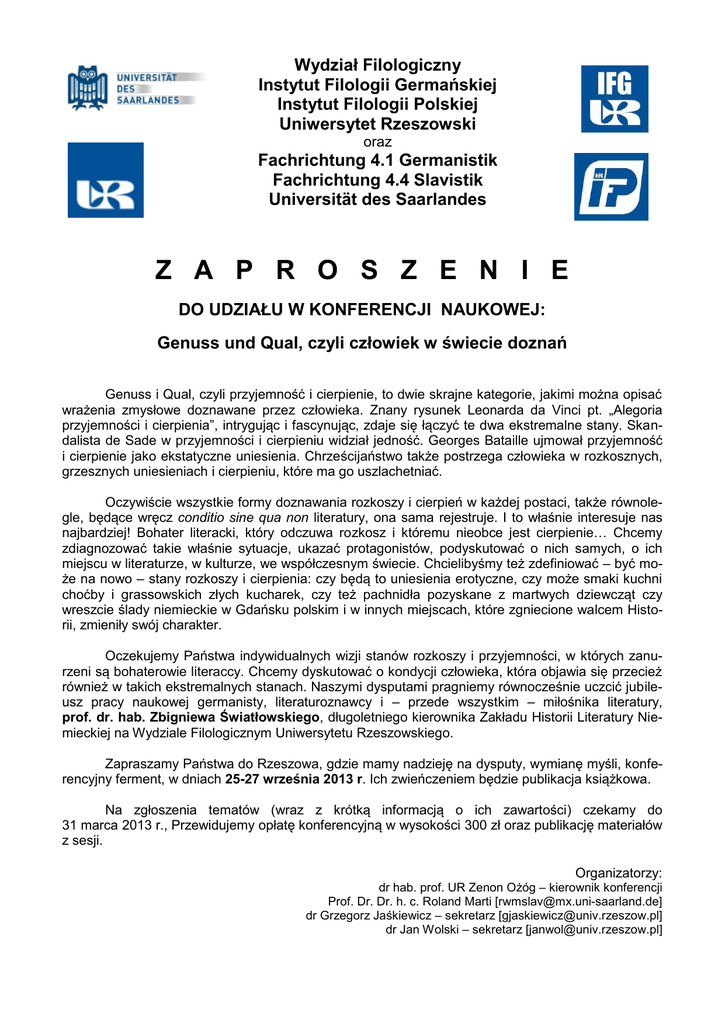 Wydział Filologiczny Instytut Filologii Germańskiej Instytut Filologii Polskiej Uniwersytet Rzeszowski oraz Fachrichtung 4.1 Germanistik Fachrichtung 4.4 Slavistik Universität des Saarlandes Z A P R O S Z E N I E DO UDZIAŁU W KONFERENCJI NAUKOWEJ: Genuss und Qual, czyli człowiek w świecie doznań Genuss i Qual, czyli przyjemność i cierpienie, to dwie skrajne kategorie, jakimi można opisać wrażenia zmysłowe doznawane przez człowieka. Znany rysunek Leonarda da Vinci pt. „Alegoria przyjemności i cierpienia”, intrygując i fascynując, zdaje się łączyć te dwa ekstremalne stany. Skandalista de Sade w przyjemności i cierpieniu widział jedność. Georges Bataille ujmował przyjemność i cierpienie jako ekstatyczne uniesienia. Chrześcijaństwo także postrzega człowieka w rozkosznych, grzesznych uniesieniach i cierpieniu, które ma go uszlachetniać. Oczywiście wszystkie formy doznawania rozkoszy i cierpień w każdej postaci, także równolegle, będące wręcz conditio sine qua non literatury, ona sama rejestruje. I to właśnie interesuje nas najbardziej! Bohater literacki, który odczuwa rozkosz i któremu nieobce jest cierpienie… Chcemy zdiagnozować takie właśnie sytuacje, ukazać protagonistów, podyskutować o nich samych, o ich miejscu w literaturze, w kulturze, we współczesnym świecie. Chcielibyśmy też zdefiniować – być może na nowo – stany rozkoszy i cierpienia: czy będą to uniesienia erotyczne, czy może smaki kuchni choćby i grassowskich złych kucharek, czy też pachnidła pozyskane z martwych dziewcząt czy wreszcie ślady niemieckie w Gdańsku polskim i w innych miejscach, które zgniecione walcem Historii, zmieniły swój charakter. Oczekujemy Państwa indywidualnych wizji stanów rozkoszy i przyjemności, w których zanurzeni są bohaterowie literaccy. Chcemy dyskutować o kondycji człowieka, która objawia się przecież również w takich ekstremalnych stanach. Naszymi dysputami pragniemy równocześnie uczcić jubileusz pracy naukowej germanisty, literaturoznawcy i – przede wszystkim – miłośnika literatury, prof. dr. hab. Zbigniewa Światłowskiego, długoletniego kierownika Zakładu Historii Literatury Niemieckiej na Wydziale Filologicznym Uniwersytetu Rzeszowskiego. Zapraszamy Państwa do Rzeszowa, gdzie mamy nadzieję na dysputy, wymianę myśli, konferencyjny ferment, w dniach 25-27 września 2013 r. Ich zwieńczeniem będzie publikacja książkowa. Na zgłoszenia tematów (wraz z krótką informacją o ich zawartości) czekamy do 31 marca 2013 r., Przewidujemy opłatę konferencyjną w wysokości 300 zł oraz publikację materiałów z sesji. Organizatorzy: dr hab. prof. UR Zenon Ożóg – kierownik konferencji Prof. Dr. Dr. h. c. Roland Marti [[email protected]] dr Grzegorz Jaśkiewicz – sekretarz [[email protected]] dr Jan Wolski – sekretarz [[email protected]]