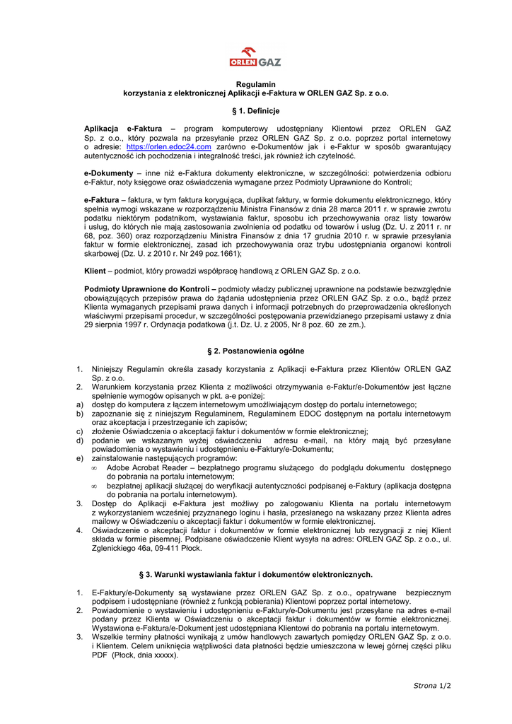 Regulamin korzystania z elektronicznej Aplikacji e-Faktura w ORLEN GAZ Sp. z o.o. § 1. Definicje Aplikacja e-Faktura – program komputerowy udostępniany Klientowi przez ORLEN GAZ Sp. z o.o., który pozwala na przesyłanie przez ORLEN GAZ Sp. z o.o. poprzez portal internetowy o adresie: https://orlen.edoc24.com zarówno e-Dokumentów jak i e-Faktur w sposób gwarantujący autentyczność ich pochodzenia i integralność treści, jak również ich czytelność. e-Dokumenty – inne niż e-Faktura dokumenty elektroniczne, w szczególności: potwierdzenia odbioru e-Faktur, noty księgowe oraz oświadczenia wymagane przez Podmioty Uprawnione do Kontroli; e-Faktura – faktura, w tym faktura korygująca, duplikat faktury, w formie dokumentu elektronicznego, który spełnia wymogi wskazane w rozporządzeniu Ministra Finansów z dnia 28 marca 2011 r. w sprawie zwrotu podatku niektórym podatnikom, wystawiania faktur, sposobu ich przechowywania oraz listy towarów i usług, do których nie mają zastosowania zwolnienia od podatku od towarów i usług (Dz. U. z 2011 r. nr 68, poz. 360) oraz rozporządzeniu Ministra Finansów z dnia 17 grudnia 2010 r. w sprawie przesyłania faktur w formie elektronicznej, zasad ich przechowywania oraz trybu udostępniania organowi kontroli skarbowej (Dz. U. z 2010 r. Nr 249 poz.1661); Klient – podmiot, który prowadzi współpracę handlową z ORLEN GAZ Sp. z o.o. Podmioty Uprawnione do Kontroli – podmioty władzy publicznej uprawnione na podstawie bezwzględnie obowiązujących przepisów prawa do żądania udostępnienia przez ORLEN GAZ Sp. z o.o., bądź przez Klienta wymaganych przepisami prawa danych i informacji potrzebnych do przeprowadzenia określonych właściwymi przepisami procedur, w szczególności postępowania przewidzianego przepisami ustawy z dnia 29 sierpnia 1997 r. Ordynacja podatkowa (j.t. Dz. U. z 2005, Nr 8 poz. 60 ze zm.). § 2. Postanowienia ogólne 1. 2. a) b) c) d) e) 3. 4. Niniejszy Regulamin określa zasady korzystania z Aplikacji e-Faktura przez Klientów ORLEN GAZ Sp. z o.o. Warunkiem korzystania przez Klienta z możliwości otrzymywania e-Faktur/e-Dokumentów jest łączne spełnienie wymogów opisanych w pkt. a-e poniżej: dostęp do komputera z łączem internetowym umożliwiającym dostęp do portalu internetowego; zapoznanie się z niniejszym Regulaminem, Regulaminem EDOC dostępnym na portalu internetowym oraz akceptacja i przestrzeganie ich zapisów; złożenie Oświadczenia o akceptacji faktur i dokumentów w formie elektronicznej; podanie we wskazanym wyżej oświadczeniu adresu e-mail, na który mają być przesyłane powiadomienia o wystawieniu i udostępnieniu e-Faktury/e-Dokumentu; zainstalowanie następujących programów: • Adobe Acrobat Reader – bezpłatnego programu służącego do podglądu dokumentu dostępnego do pobrania na portalu internetowym; • bezpłatnej aplikacji służącej do weryfikacji autentyczności podpisanej e-Faktury (aplikacja dostępna do pobrania na portalu internetowym). Dostęp do Aplikacji e-Faktura jest możliwy po zalogowaniu Klienta na portalu internetowym z wykorzystaniem wcześniej przyznanego loginu i hasła, przesłanego na wskazany przez Klienta adres mailowy w Oświadczeniu o akceptacji faktur i dokumentów w formie elektronicznej. Oświadczenie o akceptacji faktur i dokumentów w formie elektronicznej lub rezygnacji z niej Klient składa w formie pisemnej. Podpisane oświadczenie Klient wysyła na adres: ORLEN GAZ Sp. z o.o., ul. Zglenickiego 46a, 09-411 Płock. § 3. Warunki wystawiania faktur i dokumentów elektronicznych. 1. 2. 3. E-Faktury/e-Dokumenty są wystawiane przez ORLEN GAZ Sp. z o.o., opatrywane bezpiecznym podpisem i udostępniane (również z funkcją pobierania) Klientowi poprzez portal internetowy. Powiadomienie o wystawieniu i udostępnieniu e-Faktury/e-Dokumentu jest przesyłane na adres e-mail podany przez Klienta w Oświadczeniu o akceptacji faktur i dokumentów w formie elektronicznej. Wystawiona e-Faktura/e-Dokument jest udostępniana Klientowi do pobrania na portalu internetowym. Wszelkie terminy płatności wynikają z umów handlowych zawartych pomiędzy ORLEN GAZ Sp. z o.o. i Klientem. Celem uniknięcia wątpliwości data płatności będzie umieszczona w lewej górnej części pliku PDF (Płock, dnia xxxxx). Strona 1/2 4. 5. 6. 7. Doręczenie e-Faktury/e-Dokumentu Klientowi następuje z chwilą, gdy wiadomość zawierająca powiadomienie o wystawieniu i możliwości ich pobrania z portalu internetowego zostanie wysłana do Klienta. Wezwania do zapłaty wysłane na adres e-mail podany w Oświadczeniu o akceptacji faktur i dokumentów w formie elektronicznej uznaje za doręczone skutecznie. Złożenie przez Klienta Oświadczenia o akceptacji faktur i dokumentów w formie elektronicznej nie pozbawia ORLEN GAZ Sp. z o.o. prawa do wystawiania i przesyłania faktur oraz innych dokumentów w formie papierowej w szczególności w sytuacji, gdy nie jest możliwe wystawienie i zamieszczenie e-Faktury/e-Dokumentu na portalu internetowym z powodów technicznych. Przy czym w przypadku prośby o wystawienie duplikatów lub korekt do dokumentów wystawionych w formie papierowej duplikaty będą również wystawione w formie papierowej. ORLEN GAZ Sp. z o.o. rozpoczyna wystawianie e-Faktur/e-Dokumentów nie wcześniej niż w następnym dniu po złożeniu przez Klienta Oświadczenia o akceptacji faktur i dokumentów w formie elektronicznej. § 4. Zmiana adresu e-mail i rezygnacja 1. 2. 3. 4. 5. Zmiana adresu e-mail, na który są przesyłane powiadomienia o wystawieniu i udostępnieniu e-Faktury/e-Dokumentu może być dokonana w sposób wskazany w § 2 ust. 4 niniejszego Regulaminu. W przypadku niepowiadomienia ORLEN GAZ Sp. z o.o. o zmianie adresu e-mail, e-Fakturę/e-Dokument uważa się za skutecznie doręczony na dotychczasowy adres podany przez Klienta w Oświadczeniu o akceptacji faktur i dokumentów w formie elektronicznej. Klient może zrezygnować z mo