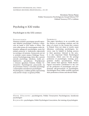HORYZONTY PSYCHOLOGII, 2012, TOM II MATERIAŁY, RECENZJE, SPRAWOZDANIA, s. 191-199 Krystyna Teresa Panas Polskie Towarzystwo Psychologiczne Zarząd Główny PTP Oddział Terenowy PTP w Lublinie Psycholog w XXI wieku Psychologist in the XXI century Streszczenie Niniejszy artykuł w przystępny sposób zapoznaje adeptów psychologii z historią i miejscem tej nauki w XXI wieku w Polsce. Nie rości sobie prawa do rozstrzygania wielu dylematów nękających psychologów, może być jednak pomocny w znalezieniu odpowiedzi na nurtujące ich pytania. Zaznaczone jest też w artykule ważne miejsce Polskiego Towarzystwa Psychologicznego, które dba o prestiż zawodu psychologa, szkolenia, studia podyplomowe, specjalizacje. Współpracuje z różnymi agendami Państwa. Polskie Towarzystwo Psychologiczne przyczyniło się do powstania Ustawy o zawodzie psychologa i samorządzie zawodowym psychologów. Psychologowie z Lublina godnie reprezentują swój zawód w kraju i za granicą Polski. Summary This paper introduces in an accessible way the history of psychology students and the place of science in the twenty-first century in Poland. Does not claim to resolve many dilemmas confronting psychologists, however, may be helpful in finding answers to their questions. Selected in the article is also important Polish Psychological Association, which cares for the prestige profession of psychologist, training, postgraduate studies, specializations. Works with various State agencies. Polish Psychological Association contributed to the Law on the profession of psychologist and professional self-government of psychologists. Psychologists from Lublin worthily represent their profession at home and abroad Polish. S ł o w a k l u c z o w e : psychologowie, Polskie Towarzystwo Psychologiczne, kształcenie psychologów K e y w o r d s : psychologists, Polish Psychological Association, the training of psychologists 192 K. T. Panas, Psycholog w XXI wieku HORYZONTY PSYCHOLOGII, 2012, TOM II – MATERIAŁY, RECENZJE, SPRAWOZDANIA Wstęp Niniejszy artykuł w przystępny sposób zapoznaje adeptów psychologii z historią i miejscem tej nauki w XXI wieku w Polsce. Nie rości sobie ten artykuł prawa do rozstrzygania wielu dylematów nękających psychologów, może być jednak pomocny w znalezieniu odpowiedzi na nurtujące ich pytania. Ustawa z dnia 8 czerwca 2001 r. o zawodzie psychologa i samorządzie zawodowym psychologów (Dz. U. Nr 73, poz. 763) jest ważnym aktem prawnym, ponieważ psycholog profesjonalnie zaangażowany jest m.in. w wiele dziedzin życia społecznego, kulturalnego, gospodarczego i edukacyjnego. Zawód psychologa jest zawodem zaufania publicznego. Oznacza to, że na wszystkich płaszczyznach psycholog nawiązuje prawidłową relację z odbiorcą swoich usług. Wchodzi on za przyzwoleniem w intymny świat swego rozmówcy – jego emocji - radości, smutków, ale i postaw, zachowań itp. Oczekuje się więc od psychologów rzetelnej wiedzy, umiejętności i kompetencji w diagnostyce, profilaktyce i terapii w różnych obszarach życia społecznego. O ważności psychologów świadczy również fakt odwoływania się ustawodawców do tego zawodu w kilkudziesięciu regulacjach prawnych – ustawach lub rozporządzeniach (szczegóły – www.ptp.org.pl ). Status psychologa Każdy psycholog musi posiadać wykształcenie specjalistyczne – studia pięcioletnie jednolite. Niezbędne są również specjalizacje i nieustanne dokształcanie się na studiach podyplomowych. Ważnym elementem w pracy psychologa jest przestrzeganie zasad etyki zawodowej. Kodeks Etyczno-Zawodowy Psychologa został zatwierdzony w Polsce w 1991 r. i zawiera zasady postępowania psychologa jako praktyka, badacza, nauczyciela i popularyzatora. „Mimo różnych porządków moralnych i światopoglądowych istnieje zespół podstawowych wartości humanistycznych, które znalazły wyraz w Powszechnej Deklaracji Praw Człowieka ONZ. W swoich czynnościach zawodowych psycholog zawsze powinien respektować te podstawowe wartości, zwłaszcza godność osoby ludzkiej, podmiotowość i autonomię człowieka i jego prawo do nieskrępowanego rozwoju. Psycholog uznaje prawo każdego człowieka do kierowania się własnym systemem wartości, dokonywania własnych wyborów, jak również prawo do intymności. Jednocześnie psycholog świadomy jest skutków, jakie przynosi lub przynieść może w przyszłości jego oddziaływanie – ostatecznie powinny to być skutki pomyślne dla odbiorcy lub odbiorców czynności zawodowych psychologa. W każdym przypadku na psychologu ciąży odpowiedzialność za następstwa kontaktu, jaki w ramach swojej roli zawodowej nawiązuje z drugim człowiekiem. K. T. Panas, Psycholog w XXI wieku HORYZONTY PSYCHOLOGII, 2012, TOM II – MATERIAŁY, RECENZJE, SPRAWOZDANIA 193 Granice ingerencji psychologa wyznaczone są z jednej strony – jego kompetencjami profesjonalnymi, z drugiej strony – celami i oczekiwaniami formułowanymi przez osoby zgłaszające się po pomoc psychologiczną” (Kodeks Etyczno-Zawodowy Psychologa, 1991). Z powyższego paradygmatu wynika konieczność troszczenia się o standardy nauczania psychologii i standardy stosowanych usług psychologicznych. Etyka zawodowa psychologów Niewątpliwie należy od pierwszych lat studiów zapoznawać studentów psychologii z etyką zawodową. Zajęcia te poruszają problematykę związaną z dylematami psychologicznymi, które pojawiają się w różnych dziedzinach życia społecznego (np. wymiar sprawiedliwości – czy można przeprowadzać badania psychologiczne skazanego bez zagwarantowania poufności spotkania; edukacja – czy można przeprowadzać badania na uczniach bez zgody rodziców i testami psychologicznymi bez polskiej normalizacji, czy psycholog pracujący z uczniami lub studentami może prowadzić z nimi terapię; zdrowie –sposób podania lub nie informacji choremu o chorobie terminalnej; reklama – czy dla korzyści komercyjnych możn