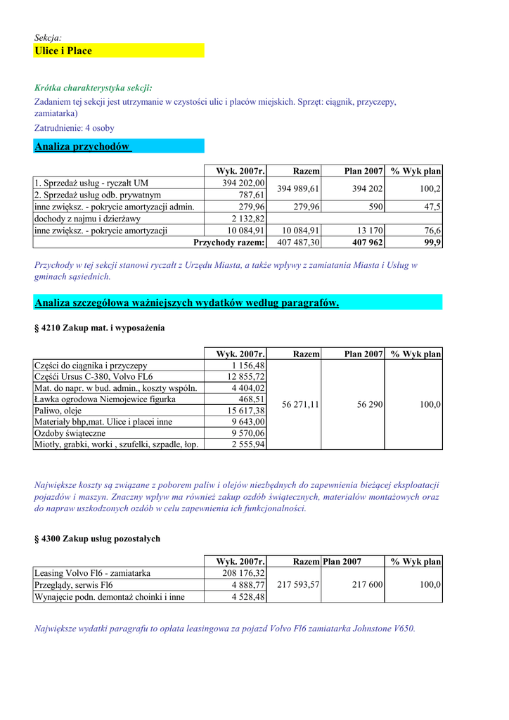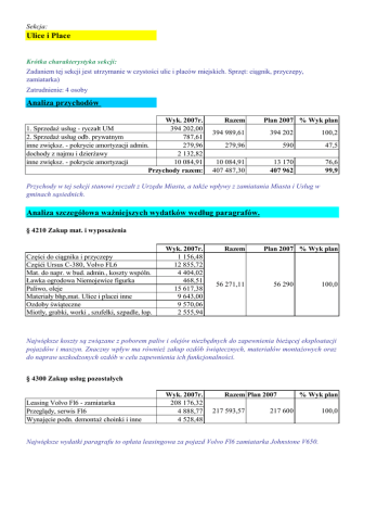 Sekcja: Ulice i Place Krótka charakterystyka sekcji: Zadaniem tej sekcji jest utrzymanie w czystości ulic i placów miejskich. Sprzęt: ciągnik, przyczepy, zamiatarka) Zatrudnienie: 4 osoby Analiza przychodów Wyk. 2007r. 1. Sprzedaż usług - ryczałt UM 394 202,00 2. Sprzedaż usług odb. prywatnym 787,61 inne zwiększ. - pokrycie amortyzacji admin. 279,96 dochody z najmu i dzierżawy 2 132,82 inne zwiększ. - pokrycie amortyzacji 10 084,91 Przychody razem: Razem Plan 2007 % Wyk plan 394 989,61 394 202 100,2 279,96 590 47,5 10 084,91 407 487,30 13 170 407 962 76,6 99,9 Przychody w tej sekcji stanowi ryczałt z Urzędu Miasta, a także wpływy z zamiatania Miasta i Usług w gminach sąsiednich. Analiza szczegółowa ważniejszych wydatków według paragrafów. § 4210 Zakup mat. i wyposażenia Części do ciągnika i przyczepy Częśći Ursus C-380, Volvo FL6 Mat. do napr. w bud. admin., koszty wspóln. Ławka ogrodowa Niemojewice figurka Paliwo, oleje Materiały bhp,mat. Ulice i placei inne Ozdoby świąteczne Miotły, grabki, worki , szufelki, szpadle, łop. Wyk. 2007r. 1 156,48 12 855,72 4 404,02 468,51 15 617,38 9 643,00 9 570,06 2 555,94 Razem 56 271,11 Plan 2007 % Wyk plan 56 290 100,0 Największe koszty są związane z poborem paliw i olejów niezbędnych do zapewnienia bieżącej eksploatacji pojazdów i maszyn. Znaczny wpływ ma również zakup ozdób świątecznych, materiałów montażowych oraz do napraw uszkodzonych ozdób w celu zapewnienia ich funkcjonalności. § 4300 Zakup usług pozostałych Leasing Volvo Fl6 - zamiatarka Przeglądy, serwis Fl6 Wynajęcie podn. demontaż choinki i inne Wyk. 2007r. 208 176,32 4 888,77 4 528,48 Razem Plan 2007 217 593,57 % Wyk plan 217 600 Największe wydatki paragrafu to opłata leasingowa za pojazd Volvo Fl6 zamiatarka Johnstone V650. 100,0 § 4430 Różne opłaty i składki Ubezpieczenia pojazdów i inne Wyk. 2007r. 25 109,08 Razem Plan 2007 % Wyk plan 25 109,08 25 110 100,0 Opłaty ubezpieczeniowe - zamiatarka, ciągnik, przyczepa. § 3020 Wydatki osob. nie zal. do wynag. Ekwiwalent za pranie odzieży roboczej Odzież robocza, rękawice, obuwie, buty, kamiz. Napoje, posiłki regeneracyjne i inne Wyk. 2007r. 990,00 1 141,77 2 243,63 Razem Plan 2007 4 375,40 % Wyk plan 4 380 99,9 Wydatki na posiłki regeneracyjne i ekwiw. za pranie pochłaniają większość kosztów tego paragrafu. Komentarz Wynik finansowy jest uwarunkowany m.in. zakupem zamiatarek Limpar 102, ciągnika Pronar 32AMK, nieplanowanymi zakupami ozdób świątecznych do dekoracji miasta. Nie planowano tak daleko posuniętych napraw ozdób świątecznych (wymiana przewodów świetlnych, naprawa konstrukcji). Sekcja: Targowica Krótka charakterystyka sekcji: Zadaniem tej sekcji jest utrzymanie w czystości Targowicy Miejskiej. Analiza przychodów 1. Sprzedaż usług - ryczałt UM Wyk. 2007 27 120,00 Razem 27 120,00 Plan 2007 % Wyk plan 27120,0 100,0 Całkowite koszty utrzymania tej sekcji pokrywane są ryczałtem z UM. W celu uprzątnięcia targowicy Zakład Usług Komunalnych zatrudnia 2 osoby na podstawie umowy zlecenia. Koszt wynagrodzenia wraz z pochodnymi stanowi ponad 98% kosztów tej sekcji.