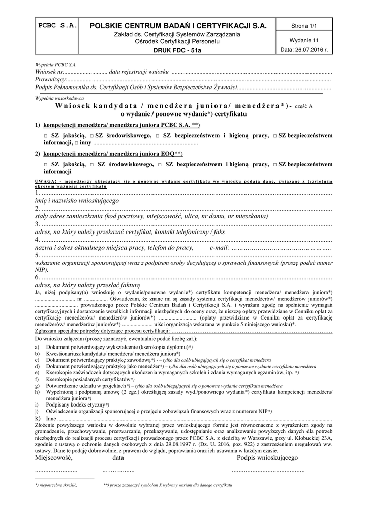PCBC S.A. POLSKIE CENTRUM BADAŃ I CERTYFIKACJI S.A. Zakład ds. Certyfikacji Systemów Zarządzania Ośrodek Certyfikacji Personelu DRUK FDC - 51a Strona 1/1 Wydanie 11 Data: 26.07.2016 r. Wypełnia PCBC S.A. Wniosek nr............................. data rejestracji wniosku ........................................................... ............................................. Prowadzący:........................................................................................................................................................................... Podpis Pełnomocnika ds. Certyfikacji Osób i Systemów Bezpieczeństwa ywności.......................................……............... Wypełnia wnioskodawca Wniosek kandydata / menedżera juniora/ menedżera*)- część A o wydanie / ponowne wydanie*) certyfikatu 1) kompetencji menedżera/ menedżera juniora PCBC S.A. **) □ SZ jakością, □ SZ środowiskowego, □ SZ bezpieczeństwem i higieną pracy, □ SZ bezpieczeństwem informacji, □ inny .................................................................... 2) kompetencji menedżera/ menedżera juniora EOQ**) □ SZ jakością, □ SZ środowiskowego, □ SZ bezpieczeństwem i higieną pracy, □ SZ bezpieczeństwem informacji UWAGA! - menedżer zy ubiegający s ię o ponowne wydanie certyfikatu we wnios ku podają dane, związane z tr zyletnim okresem ważności certyfikatu 1. ........................................................................................................................................................................... imię i nazwisko wnioskującego 2. ........................................................................................................................................................................... stały adres zamieszkania (kod pocztowy, miejscowość, ulica, nr domu, nr mieszkania) 3. ........................................................................................................................................................................... adres, na który nale y przekazać certyfikat, kontakt telefoniczny / faks 4. ........................................................................................................................................................................... nazwa i adres aktualnego miejsca pracy, telefon do pracy, e-mail: ………………………………………….. 5. ........................................................................................................................................................................... wskazanie organizacji sponsorującej wraz z podpisem osoby decydującej o sprawach finansowych (proszę podać numer NIP). 6. ........................................................................................................................................................................... adres, na który nale y przesłać fakturę Ja, niżej podpisany(a) wnioskuję o wydanie/ponowne wydanie*) certyfikatu kompetencji menedżera/ menedżera juniora*) ............................. nr ................. Oświadczam, że znane mi są zasady systemu certyfikacji menedżerów/ menedżerów juniorów*) ............................... prowadzonego przez Polskie Centrum Badań i Certyfikacji S.A. i wyrażam zgodę na spełnienie wymagań certyfikacyjnych i dostarczenie wszelkich informacji niezbędnych do oceny oraz, że uiszczę opłaty przewidziane w Cenniku opłat za certyfikację menedżerów/ menedżerów juniorów*) ........................... (opłaty przewidziane w Cenniku opłat za certyfikację menedżerów/ menedżerów juniorów*) ...................... uiści organizacja wskazana w punkcie 5 niniejszego wniosku)*. Zgłaszam specjalne potrzeby dotyczące procesu certyfikacji: …………………………………………………………………………… Do wniosku załączam (proszę zaznaczyć, ewentualnie podać liczbę zał.): a) Dokument potwierdzający wykształcenie (kserokopia dyplomu)*) b) Kwestionariusz kandydata/ menedżera/ menedżera juniora*) c) Dokument potwierdzający praktykę zawodową*) - – tylko dla osób ubiegających się o certyfikat mened era d) Dokument potwierdzający praktykę jako menedżer*) – tylko dla osób ubiegających się o ponowne wydanie certyfikatu mened era e) Kserokopie zaświadczeń dotyczących ukończenia wymaganych szkoleń i zdania wymaganych egzaminów, itp. *) f) Kserokopie posiadanych certyfikatów*) g) Potwierdzenie udziału w projektach*) – tylko dla osób ubiegających się o ponowne wydanie certyfikatu mened era h) Wypełnioną i podpisaną umowę (2 egz.) określającą zasady wyd./ponownego wydania*) certyfikatu kompetencji menedżera/ menedżera juniora*) i) Podpisany kodeks etyczny*) j) Oświadczenie organizacji sponsorującej o przejęciu zobowiązań finansowych wraz z numerem NIP *) k) Inne .................................................................................................. .................................................................................................... Złożenie powyższego wniosku w dowolnie wybranej przez wnioskującego formie jest równoznaczne z wyrażeniem zgody na gromadzenie, przechowywanie, przetwarzanie, przekazywanie, udostępnianie oraz analizowanie powyższych danych dla potrzeb niezbędnych do realizacji procesu certyfikacji prowadzonego przez PCBC S.A. z siedzibą w Warszawie, przy ul. Kłobuckiej 23A, zgodnie z ustawą o ochronie danych osobowych z dnia 29.08.1997 r. (Dz. U. 2016, poz. 922) z zastrzeżeniem uregulowań ww. ustawy. Dane te podaję dobrowolnie, z prawem do wglądu, poprawiania oraz ich usuwania w każdym czasie. Miejscowość, ......................... data Podpis wnioskującego ..……......... ........................................... ________________________ *) niepotrzebne skreślić, **) proszę zaznaczyć symbolem X wybrany wariant dla danego certyfikatu