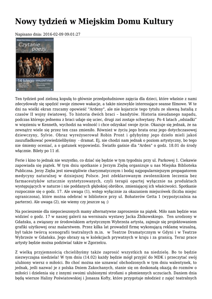 Nowy tydzień w Miejskim Domu Kultury Napisano dnia: 2016-02-09 09:01:27 Ten tydzień pod zieloną kopułą to głównie przedpołudniowe zajęcia dla dzieci, które właśnie z nami zdecydowały się spędzić swoje zimowe wakacje, a także niezwykle interesujące seanse filmowe. W te dni na wielki ekran rzucamy opowieść "Ardeny", ale nie kojarzcie tego tytułu ze sławną batalią z czasów II wojny światowej. To historia dwóch braci – bandytów. Historia nieudanego napadu, podczas którego jednemu z braci udaje się uciec, drugi zaś zostaje schwytany. Po 4 latach „odsiadki” w więzieniu w Kenneth, wychodzi na wolność i chce odzyskać swoje życie. Okazuje się jednak, że na zewnątrz wiele się przez ten czas zmieniło. Również w życiu jego brata oraz jego dotychczasowej dziewczyny, Sylvie. Obraz wyreżyserował Robin Pront i gdybyśmy jego dzieło mieli jakoś zaszufladkować powiedzielibyśmy - dramat. Ej, nie chodzi nam jednak o poziom artystyczny, bo tego nie śmiemy oceniać, a o gatunek wypowiedzi. Światło gaśnie dla "Arden" o godz. 18.01 do środy włącznie. Bilety po 11 zł. Ferie i kino to jednak nie wszystko, co dziać się będzie w tym tygodniu przy ul. Parkowej 1. Ciekawie zapowiada się piątek. W tym dniu spotkanie z Jerzym Ziębą organizuje u nas Miejska Biblioteka Publiczna. Jerzy Zięba jest niewątpliwie charyzmatycznym i bodaj najpopularniejszym propagatorem medycyny naturalnej w dzisiejszej Polsce. Jest zdeklarowanym zwolennikiem leczenia bez farmaceutyków sztucznie syntetyzowanych, czyli terapii opartej wyłącznie na produktach występujących w naturze i nie poddanych głębokiej obróbce, zmieniającej ich właściwości. Spotkanie rozpocznie się o godz. 17. Ale uwaga (1), wstęp wyłącznie za okazaniem miejscówek (liczba miejsc ograniczona), które można odebrać w bibliotece przy ul. Bohaterów Getta 1 (wypożyczalnia na parterze). Ale uwaga (2), nie wiemy czy jeszcze są :) Na pocieszenie dla niepocieszonych mamy alternatywne zaproszenie na piątek. Miło nam będzie was widzieć o godz. 17 w naszej galerii na wernisażu wystawy Jacka Żbikowskiego. Ten urodzony w Gdańsku, a związany ze środowiskiem artystycznym Wybrzeża artysta, zajmuje się projektowaniem grafiki użytkowej oraz malarstwem. Przez kilka lat prowadził firmę wykonującą reklamę wizualną, był także twórcą scenografii teatralnych m.in. w Teatrze Dramatycznym w Gdyni i w Teatrze Wybrzeże w Gdańsku. Jego obrazy są w kolekcjach prywatnych w kraju i za granicą. Teraz prace artysty będzie można podziwiać także w Zgorzelcu. Z wielką przyjemnością chcielibyśmy także zaprosić wszystkich na niedzielę. Bo to będzie niezwyczajna niedziela! W tym dniu (14.02) każdy będzie mógł przyjść do MDK i przeczytać swój ulubiony wiersz o miłości. Bo choć można nie uznawać obchodzonych w tym dniu walentynek, to jednak, jeśli nazwać je z polska Dniem Zakochanych, stanie się on doskonałą okazją do rozmów o miłości i dzielenia się z innymi swoimi ulubionymi strofami o płomiennych uczuciach. Daniem dnia będą wiersze Haliny Poświatowskiej i Jonasza Kofty, które przygotuje młodzież z zajęć teatralnych MDK. Ale przyjść i pochwalić się swoim ulubionym wierszem może absolutnie każdy! Początek godz. 16. Oprócz poezji i fragmentów prozy, w programie jest też kawa i ciastka. Wstęp wolny! Źródło: MDK w Zgorzelcu