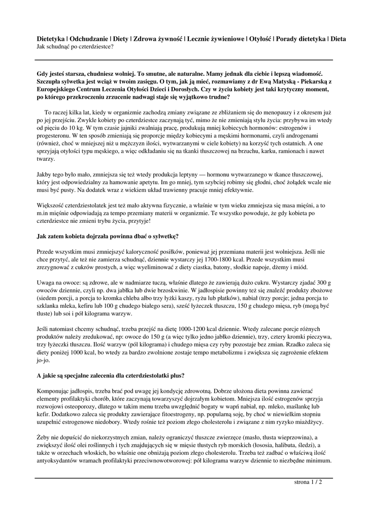Dietetyka | Odchudzanie | Diety | Zdrowa żywność | Lecznie żywieniowe | Otyłość | Porady dietetyka | Dieta Jak schudnąć po czterdziestce? Gdy jesteś starsza, chudniesz wolniej. To smutne, ale naturalne. Mamy jednak dla ciebie i lepszą wiadomość. Szczupła sylwetka jest wciąż w twoim zasięgu. O tym, jak ją mieć, rozmawiamy z dr Ewą Matyską - Piekarską z Europejskiego Centrum Leczenia Otyłości Dzieci i Dorosłych. Czy w życiu kobiety jest taki krytyczny moment, po którego przekroczeniu zrzucenie nadwagi staje się wyjątkowo trudne? To raczej kilka lat, kiedy w organizmie zachodzą zmiany związane ze zbliżaniem się do menopauzy i z okresem już po jej przejściu. Zwykle kobiety po czterdziestce zaczynają tyć, mimo że nie zmieniają stylu życia: przybywa im wtedy od pięciu do 10 kg. W tym czasie jajniki zwalniają pracę, produkują mniej kobiecych hormonów: estrogenów i progesteronu. W ten sposób zmieniają się proporcje między kobiecymi a męskimi hormonami, czyli androgenami (również, choć w mniejszej niż u mężczyzn ilości, wytwarzanymi w ciele kobiety) na korzyść tych ostatnich. A one sprzyjają otyłości typu męskiego, a więc odkładaniu się na tkanki tłuszczowej na brzuchu, karku, ramionach i nawet twarzy. Jakby tego było mało, zmniejsza się też wtedy produkcja leptyny — hormonu wytwarzanego w tkance tłuszczowej, który jest odpowiedzialny za hamowanie apetytu. Im go mniej, tym szybciej robimy się głodni, choć żołądek wcale nie musi być pusty. Na dodatek wraz z wiekiem układ trawienny pracuje mniej efektywnie. Większość czterdziestolatek jest też mało aktywna fizycznie, a właśnie w tym wieku zmniejsza się masa mięśni, a to m.in mięśnie odpowiadają za tempo przemiany materii w organizmie. Te wszystko powoduje, że gdy kobieta po czterdziestce nie zmieni trybu życia, przytyje! Jak zatem kobieta dojrzała powinna dbać o sylwetkę? Przede wszystkim musi zmniejszyć kaloryczność posiłków, ponieważ jej przemiana materii jest wolniejsza. Jeśli nie chce przytyć, ale też nie zamierza schudnąć, dziennie wystarczy jej 1700-1800 kcal. Przede wszystkim musi zrezygnować z cukrów prostych, a więc wyeliminować z diety ciastka, batony, słodkie napoje, dżemy i miód. Uwaga na owoce: są zdrowe, ale w nadmiarze tuczą, właśnie dlatego że zawierają dużo cukru. Wystarczy zjadać 300 g owoców dziennie, czyli np. dwa jabłka lub dwie brzoskwinie. W jadłospisie powinny też się znaleźć produkty zbożowe (siedem porcji, a porcja to kromka chleba albo trzy łyżki kaszy, ryżu lub płatków), nabiał (trzy porcje; jedna porcja to szklanka mleka, kefiru lub 100 g chudego białego sera), sześć łyżeczek tłuszczu, 150 g chudego mięsa, ryb (mogą być tłuste) lub soi i pół kilograma warzyw. Jeśli natomiast chcemy schudnąć, trzeba przejść na dietę 1000-1200 kcal dziennie. Wtedy zalecane porcje różnych produktów należy zredukować, np: owoce do 150 g (a więc tylko jedno jabłko dziennie), trzy, cztery kromki pieczywa, trzy łyżeczki tłuszczu. Ilość warzyw (pól kilograma) i chudego mięsa czy ryby pozostaje bez zmian. Rzadko zaleca się diety poniżej 1000 kcal, bo wtedy za bardzo zwolnione zostaje tempo metabolizmu i zwiększa się zagrożenie efektem jo-jo. A jakie są specjalne zalecenia dla czterdziestolatki plus? Komponując jadłospis, trzeba brać pod uwagę jej kondycję zdrowotną. Dobrze ułożona dieta powinna zawierać elementy profilaktyki chorób, które zaczynają towarzyszyć dojrzałym kobietom. Mniejsza ilość estrogenów sprzyja rozwojowi osteoporozy, dlatego w takim menu trzeba uwzględnić bogaty w wapń nabiał, np. mleko, maślankę lub kefir. Dodatkowo zaleca się produkty zawierające fitoestrogeny, np. popularną soję, by choć w niewielkim stopniu uzupełnić estrogenowe niedobory. Wtedy rośnie też poziom złego cholesterolu i związane z nim ryzyko miażdżycy. Żeby nie dopuścić do niekorzystnych zmian, należy ograniczyć tłuszcze zwierzęce (masło, tłusta wieprzowina), a zwiększyć ilość olei roślinnych i tych znajdujących się w mięsie tłustych ryb morskich (łososia, halibuta, śledzi), a także w orzechach włoskich, bo właśnie one obniżają poziom złego cholesterolu. Trzeba też zadbać o właściwą ilość antyoksydantów wramach profilaktyki przeciwnowotworowej: pół kilograma warzyw dziennie to niezbędne minimum. strona 1 / 2 Dietetyka | Odchudzanie | Diety | Zdrowa żywność | Lecznie żywieniowe | Otyłość | Porady dietetyka | Dieta Jak schudnąć po czterdziestce? Dodatkowo czterdziestolatka powinna regularnie kontrolować swoją wagę: najlepiej codzienne rano, na czczo. Bywa jednak, że ważenie się psuje kobietom humor, bo wciąż przypomina o nadwadze. W takiej sytuacji warto ważyć się choć raz w tygodniu. To pozwoli na bieżąco obserwować ewentualne wahania ciężaru ciała i w porę podjąć działania odchudzające, np. przejść na dietę 1200 kcal. To przypomina ogólne zasady zdrowego odżywiania, ale jak jeszcze można pomóc kobiecie dojrzałej w tak trudnym dla niej odchudzaniu? Tak naprawdę dieta odchudzająca czterdziestolatki niczym nie różni się od tej dla trzydziestolatki. Większą rolę odgrywają produkty z fitoestrogenami, te bogate w wapń i w kwasy tłuszczowe obniżające poziom złego cholesterolu. Ale w przypadku kobiety dojrzałej dużo ważniejsza niż u młodszych pań jest aktywność fizyczna. Chodzi tu przede wszystkim o niedopuszczenie do spadku masy mięśniowej. Większe znaczenie ma też wtedy pomoc psychologiczna. Zmiany hormonalne mogą sprzyjać depresji i w związku z tym nawykom pocieszania się lub rozładowywania napięcia za pomocą jedzenia. Poza tym wiele kobiet po czterdziestce oduczyło się cieszyć się życiem i sprawiać sobie przyjemności. Dlatego w centrum leczenia otyłości, gdzie pracuję, mamy specjalne zajęcia, służące odnalezieniu aktywności daj