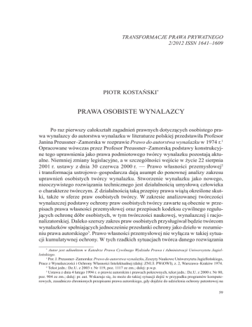 Transformacje Prawa Prywatnego 2/2012 ISSN 1641–1609 Piotr Kostański* Prawa osobiste wynalazcy Po raz pierwszy całokształt zagadnień prawnych dotyczących osobistego prawa wynalazcy do autorstwa wynalazku w literaturze polskiej przedstawiła Profesor Janina Preussner–Zamorska w rozprawie Prawo do autorstwa wynalazku w 1974 r. Opracowane wówczas przez Profesor Preussner–Zamorską podstawy konstrukcyjne tego uprawnienia jako prawa podmiotowego twórcy wynalazku pozostają aktualne. Niemniej zmiany legislacyjne, a w szczególności wejście w życie 22 sierpnia 2001 r. ustawy z dnia 30 czerwca 2000 r. — Prawo własności przemysłowej i transformacja ustrojowo–gospodarcza dają asumpt do ponownej analizy zakresu uprawnień osobistych twórcy wynalazku. Stworzenie wynalazku jako nowego, nieoczywistego rozwiązania technicznego jest działalnością umysłową człowieka o charakterze twórczym. Z działalnością taką przepisy prawa wiążą określone skutki, także w sferze praw osobistych twórcy. W zakresie analizowanej twórczości wynalazczej podstawy ochrony praw osobistych twórcy zawarte są obecnie w przepisach prawa własności przemysłowej oraz przepisach kodeksu cywilnego regulujących ochronę dóbr osobistych, w tym twórczości naukowej, wynalazczej i racjonalizatorskiej. Daleko szerszy zakres praw osobistych przysługiwał będzie twórcom wynalazków spełniających jednocześnie przesłanki ochrony jako dzieło w rozumieniu prawa autorskiego. Prawo własności przemysłowej nie wyłącza w takiej sytua cji kumulatywnej ochrony. W tych rzadkich sytuacjach twórca danego rozwiązania * Autor jest adiunktem w Katedrze Prawa Cywilnego Wydziału Prawa i Administracji Uniwersytetu Jagiel lońskiego. Por. J. Preussner–Zamorska: Prawo do autorstwa wynalazku, Zeszyty Naukowe Uniwersytetu Jagiellońskiego, Prace z Wynalazczości i Ochrony Własności Intelektualnej (dalej: ZNUJ. PWiOWI), z. 2, Warszawa–Kraków 1974. Tekst jedn.: Dz.U. z 2003 r. Nr 119, poz. 1117 ze zm.; dalej: p.w.p. Ustawa z dnia 4 lutego 1994 r. o prawie autorskim i prawach pokrewnych, tekst jedn.: Dz.U. z 2000 r. Nr 80, poz. 904 ze zm.; dalej: pr. aut. Wskazuje się, że może do takiej sytuacji dojść w przypadku programów komputerowych, zasadniczo chronionych przepisami prawa autorskiego, gdy dojdzie do udzielenia ochrony patentowej na 59 Transformacje Prawa Prywatnego 2/2012 korzystał będzie z pełni autorskich praw osobistych, co jednak pozostaje poza zakresem niniejszych rozważań. Prawa osobiste twórcy wynalazku mają szersze uzasadnienie aksjologiczne w teorii naturalnej i teorii nagrody oraz teorii zachęty, którymi uzasadnia się wprowadzenie ochrony patentowej. Zgodnie z pierwszą z teorii korzyści materialne oraz idealne związane z dokonaniem wynalazku winny przypadać jego twórcy (jako naturalne prawo do owoców własnej działalności umysłowej). Teoria nagrody i teoria zachęty zakładają, że instytucje prawa patentowego zarówno w zakresie praw osobistych, jak i majątkowych mają zapewnić twórcy wynagrodzenie (materialne oraz satysfakcję niematerialną) za dotychczasowe dokonania (stworzenie wynalazku) oraz zachęcić go do dalszej aktywności i wysiłku twórczego. Jednym z aspektów owej nagrody i zachęty jest uznanie (sława), którym twórca wynalazku będzie cieszył się w społeczeństwie. Praktyczna realizacja tego interesu osobistego twórcy możliwa jest wówczas, gdy system prawny przewiduje odpowiednią regulację praw osobistych, umożliwiających twórcy informowanie o swojej osobie w kontekście informacji o wynalazku oraz zapobieganie anonimizowaniu wynalazku i sprzeciw wobec przypisania sobie twórczości wynalazku przez osobę drugą. Dzięki ujawnieniu swych danych twórca wynalazku ma możliwość budowania własnego prestiżu oraz pełniejszej realizacji praw majątkowych. Od początków prawniczej analizy prawa własności intelektualnej zakładano, iż wraz z dokonaniem wynalazku powstaje prawo osobiste; pogląd ten zapoczątkował w drugiej połowie XIX w. w nauce niemieckiej Otto von Gierke. Punktem wyjścia dla aktualnej analizy treści praw osobistych wynalazcy muszą być wiążące Polskę umowy międzynarodowe. Regulacje o zakresie ogólnym, przewidujące prawo do ochrony osobistych uprawnień związanych z twórczością zawierają: Powszechna Deklaracja Praw Człowieka i Obywatela z 10 grudnia 1948 r. oraz Międzynarodowy Pakt Praw Gospodarczych, Społecznych i Kulturalnych Organizacji Narodów Zjednoczonych z 16 grudnia 1966 r. Zgodnie z art. 27 deklaracji każdy człowiek ma prawo do ochrony moralnych i materialnych korzyści z jakiejkolwiek jego działalności naukowej. Użyte w deklaracji pojęcie korzyści moralnych z działalności naukowej, w tym oczywiście w zakresie stosowanych nauk technicznych, obejmuje prawa osobiste twórcy wynalazku. Podobnym pojęciem posłużył się prawodawca międzynarodowy w art. 15 ust. 1 lit. c paktu, w którym zapisano prawo każdego do korzystania z ochrony interesów moralnych i materialnych wynikających z wszelkiej twórczości naukowej, której jest autorem. W pakcie wprost powiązano ochronę praw osobistych („interesów moralnych”) z działalnośtzw. wynalazek wdrażany przy użyciu komputera i w ten sposób ochroną patentową objęty zostałby także program komputerowy. Na ten temat szerzej piszę w pracy: Die Schutzwirkung des Patent nach polnischem Recht, Baden–Baden 2010, s. 58–78. M. du Vall: Prawo patentowe, Warszawa 2008, s. 207. 60 Piotr Kostański: Prawa osobiste wynalazcy cią twórczą. W związku z zakresem opracowania, abstrakcyjne normy aktów ogólnych należy odnieść do wynalazcy, a więc osoby fizycznej, która w sposób twórczy rozwiązała określony problem techniczny, tworząc rozwiązanie mające cechy nowości, nieoczywistości i nadające się do przemysłowego stosowania. Rozwiązanie to powinno należeć do jakiejkolwiek dziedziny techniki (w 