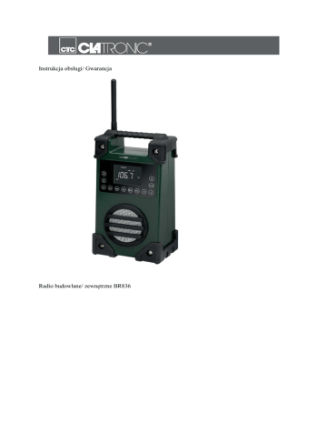 Instrukcja obsługi/ Gwarancja Radio budowlane/ zewnętrzne BR836 Przegląd elementów do obsługi Instrukcja obsługi Dziękujemy, że zdecydowali się Państwo na zakup naszego produktu. Życzymy zadowolenia z zakupionego urządzenia. Symbole użyte w instrukcji obsługi Ważne informacje dotyczące bezpieczeństwa są szczególnie oznakowane. Zawsze należy przestrzegać tych instrukcji, aby uniknąć wypadków i uszkodzenia urządzenia: OSTRZEŻENIE: Ostrzega przed zagrożeniami dla zdrowia i pokazuje potencjalne ryzyko obrażeń UWAGA: Wskazuje na potencjalne niebezpieczeństwo dla urządzenia i innych przedmiotów. WSKAZÓWKA: Podkreśla porady i informacje dla użytkowników. Ogólne wskazówki dot. bezpieczeństwa Przed użyciem urządzenie proszę dokładnie przeczytać i zachować instrukcję obsługi oraz kartę gwarancyjną, paragon oraz w miarę możliwości pudełko z opakowaniem wewnętrznym. W przypadku gdy przekazują Państwo osobie trzeciej należy przekazać także instrukcję obsługi. • • • • • • • • • • • • • Aby uniknąć ryzyka pożaru lub porażenia prądem nie należy narażać urządzenia na działanie deszczu lub wilgotności. Nie używać dekodera w bezpośrednim sąsiedztwie wody (w łazience, na basenie, w wilgotnej piwnicy). Korzystać z urządzenia wyłącznie do celów prywatnych i przewidzianych. Urządzenie nie jest przeznaczone do użytku publicznego. Zasilacz jest przeznaczony tylko do użytku w suchych pomieszczeniach. Sprawdzić czy wyjściowe napięcie elektryczne i polaryzacja zasilacza pokrywają się z informacjami na podłączonym urządzeniu! Nie dotykać podłączonego do sieci zasilacza wilgotnymi rękami! Odłączyć zasilacz sieciowy z gniazdka w trakcie czyszczenia lub w razie uszkodzeń! Upewnij się, że kabel zasilający nie jest skręcony, przygnieciony i nie ma kontaktu ze źródłem ciepła. Urządzenie podłączać tylko do prawidłowo zainstalowanego gniazda. Należy sprawdzić czy napięcie podane na urządzeniu jest zgodne z napięciem w gnieździe. Przy używaniu zewnętrznych zasilaczy sieciowych zwracać uwagę na właściwe napięcie i polarność, zawsze prawidłowo wkładać baterie Urządzenie ustawić tak, aby otwory wentylacyjne nie były zasłonięte Nigdy nie otwierać obudowy urządzenia. W przypadku niefachowej naprawy może powstać znaczące niebezpieczeństwo dla użytkownika. W przypadku uszkodzeń urządzenia, w szczególności kabla sieciowego nie należy go używać, ale oddać je do naprawy przez fachowca. Kabel zasilający należy sprawdzać regularnie pod kątem uszkodzeń. Uszkodzony kabel sieciowy powinien być wymieniony na równowartościowy przez producenta, nasz punkt serwisowy lub podobnie wykwalifikowaną osobę w celu uniknięcia niebezpieczeństw. W przypadku nie używania urządzenia przez dłuższy czas odłączyć je od gniazda zasilającego lub wyjąć baterie. Te symbole mogą znajdować się na urządzeniu. Należy zwrócić uwagę na: Symbol pioruna – wskazuje użytkownikowi części we wnętrzu urządzenia gdzie przepływa prąd o wysokim napięciu. Symbol z wykrzyknikiem - wskazuje użytkownikowi ważne wskazówki dotyczące konserwacji i obsługi urządzenia zawarte w instrukcji obsługi. Dzieci i osoby starsze • Dla bezpieczeństwa Państwa dzieci nie należy zostawiać elementów opakowania (plastikowe torebki, karton, styropian itp.) w miejscach dla nich dostępnych. OSTRZEŻENIE! Nie należy pozwalać małym dzieciom bawić się folią. Isnieje ryzyko uduszenia! • Urządzenie nie jest przeznaczone do użytku przez osoby (w tym dzieci) o ograniczonej sprawności fizycznej, zdolności sensorycznej lub umysłowej lub bez potrzebnego doświadczenia i / lub wiedzy, chyba że są one nadzorowane przez osobę odpowiedzialną za ich bezpieczeństwo lub otrzymały wskazówki, w jaki sposób korzystać z urządzenia. • Dzieci powinny być nadzorowane, aby nie bawiły się urządzeniem. Przegląd elementów do obsługi 1. Antena FM 2. Uchwyt 3. Wyświetlacz LCD 4. Przycisk (wł/wył) 5. Przycisk FUNCTION 6. Przycisk (włączanie/wyłączanie alarmu/ ustawianie alarmu 7. Przycisk (ustawianie zegara) 8.Przycisk M- (odtwarzanie/ pauza/ pamięć stacji) 9. Przycisk ■/ M+ (stop/pamięć stacji) 10. Głośnik 11. Przyciski następna stacja/ następny utwór 12. Przyciski (regulacja głośności) 13. Przycisk PROG/MEM (pamięć) 14. Przycisk SNOOZE/SLEEP Tylna strona (brak obrazka) Pod gumową pokrywą znajdują się następujące złącza: - wejście 9V DC IN + lampka kontrolna poziomu naładowania akumulatora - Złącze AUX IN - wejście USB Wyposażenie (bez obrazka) Zasilacz Uruchamianie urządzenia • • • • • Przed uruchomieniem urządzenia przeczytać dokładnie niniejszą instrukcję obsługi. Wybrać odpowiednie umiejscowienie dla urządzenia. Nadają się suche, płaskie, antypoślizgowe powierzchnie, na których można dobrze obsługiwać urządzenie. Należy zwrócić uwagę aby urządzenie miało dobrą wentylację. Usunąć folię ochronną z wyświetlacza. W razie potrzeby przykręcić elastyczną antenę do odpowiedniego złącza. Zasilanie (zasilacz) • • • Umieścić wtyczkę sieciową w prawidłowo zainstalowanym gniazdku sieciowym. Zdjąć gumową osłonę tylnej części urządzenia, a następnie połączyć urządzenie z zasilaczem umieszczając wtyczkę zasilacza w wejściu 9V V DC IN. Upewnić się, że napięcie w sieci odpowiada specyfikacji na tabliczce znamionowej. W przypadku nie korzystania z urządzenia należy utrzymywać gumową pokrywę zamkniętą. UWAGA • Dołączony do urządzenia adapter sieciowy może być używany tylko z niniejszym urządzeniem. Nie stosować z innymi urządzeniami. • • • • • • • • • • • • Używać wyłącznie adaptera prądu zmiennego 9V uszkodzić urządzenie. inny rodzaj adaptera może • i WSKAZÓWKA • W przypadku nie korzystania z urządzenia przez dłuższy c